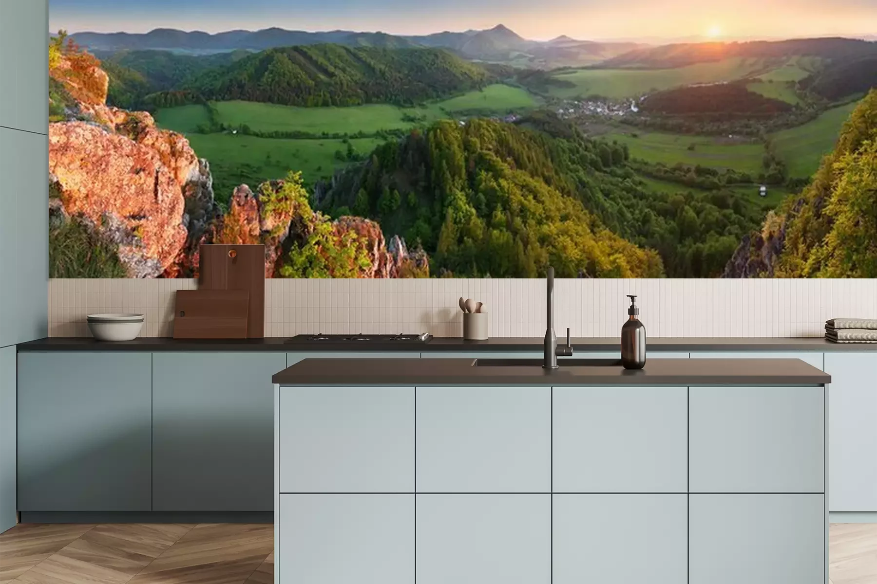 Het materiaal Premium is een glad vinyl op vlies, dat bestand is tegen uitrekken en vervorming. Het is dampdoorlatend – de muren kunnen vrij ademen – waardoor het geschikt is voor gebruik in de keuken en badkamer. Bij vervuiling kan het materiaal worden afgenomen met een vochtige doek. De maximale breedte van één baan bedraagt 95 of 105 cm, afhankelijk van de beschikbaarheid. Montage vindt plaats met de rand-aan-rand methode, wat een esthetisch resultaat zonder zichtbare naden oplevert. Omdat de lijm rechtstreeks op de muur wordt aangebracht, verloopt de installatie van het fotobehang snel en eenvoudig.