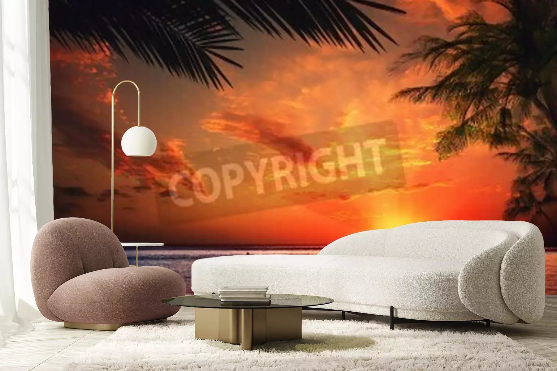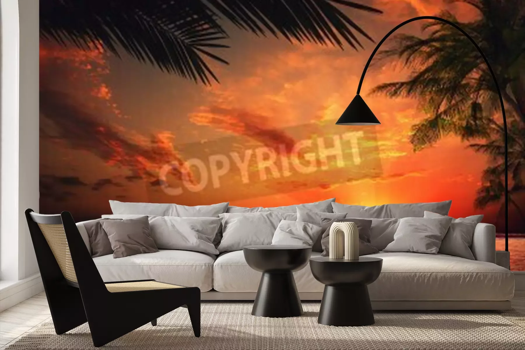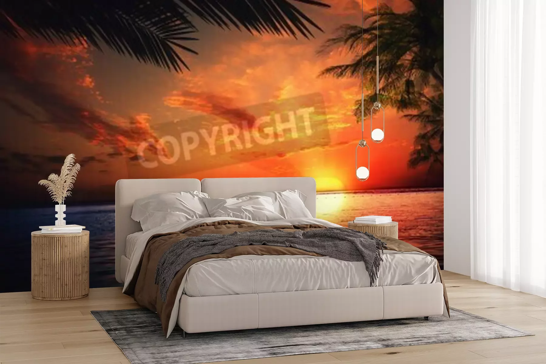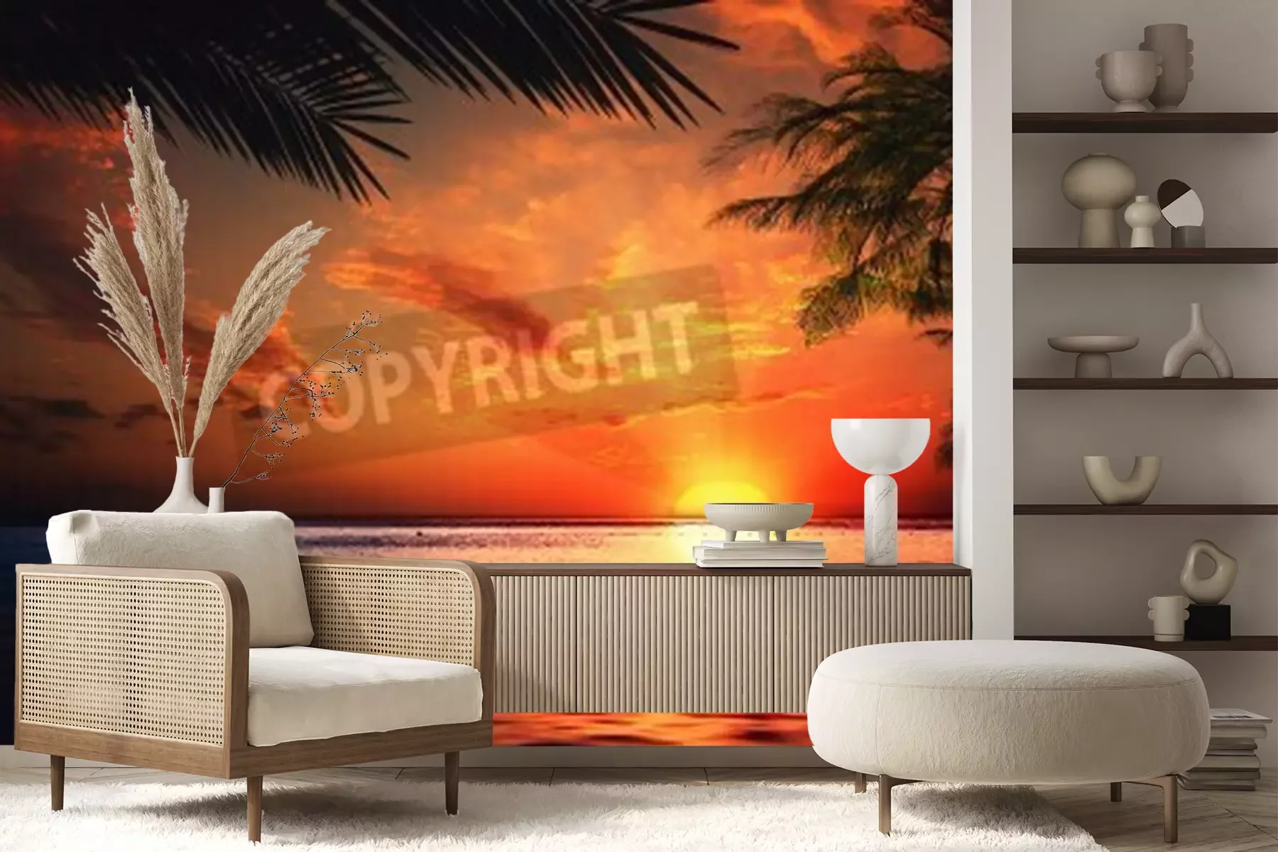 Fotobehang Zonsondergang half verborgen achter de horizon