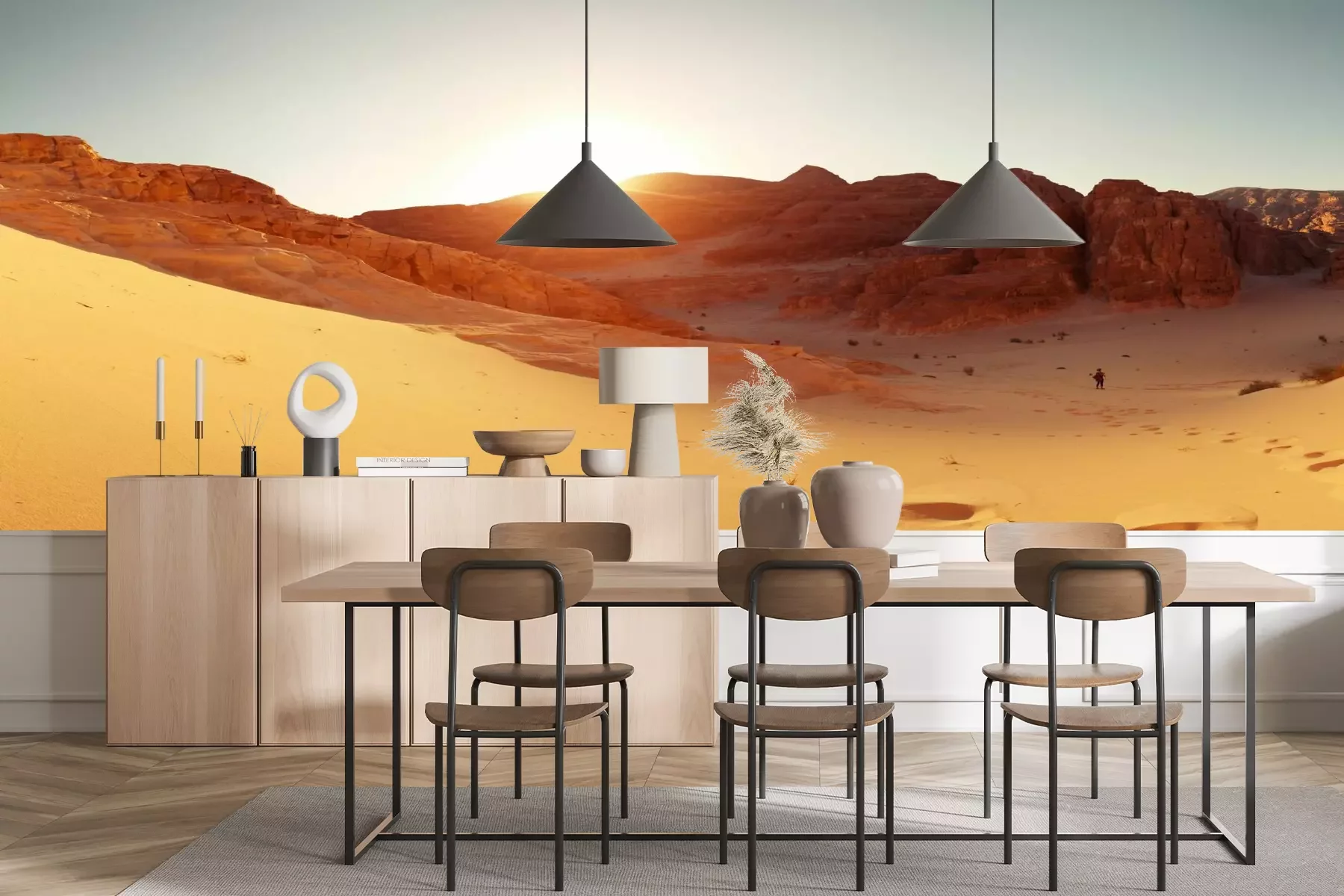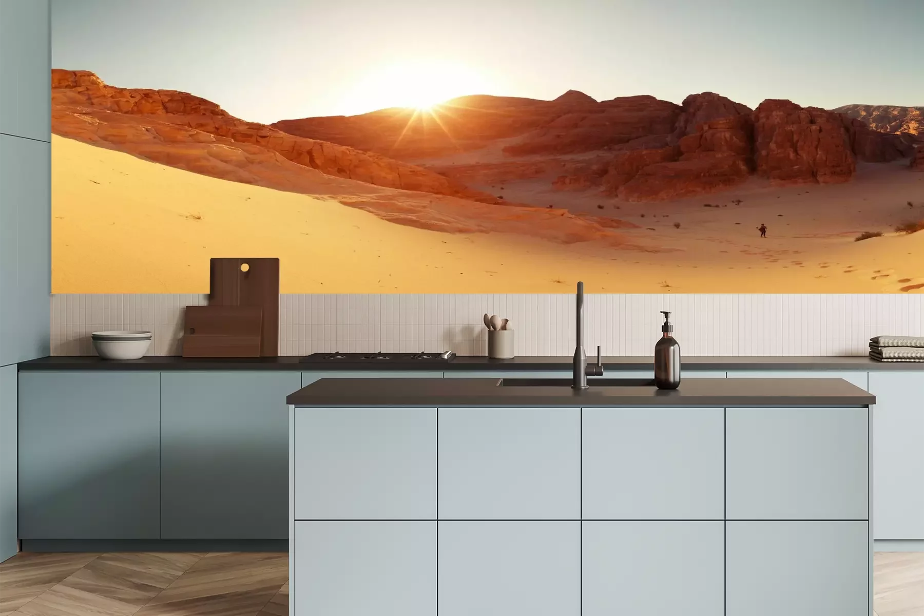Het materiaal Premium+ is een gestructureerd vinyl op vlies met een gewicht van 255 g/m², dat kleine oneffenheden in de muur effectief camoufleert. De subtiele structuur van fijn zand geeft het oppervlak een exclusieve uitstraling, terwijl de halfmatte afwerking de diepte van de kleuren benadrukt. Het materiaal is dampdoorlatend, waardoor het ook in de keuken en badkamer kan worden gebruikt. De maximale breedte van één baan bedraagt 100 cm – bij grotere afmetingen wordt het fotobehang in meerdere gelijke banen verdeeld. De lijm wordt direct op de muur aangebracht en het behang wordt rand-aan-rand geplakt, wat zorgt voor een esthetisch resultaat zonder zichtbare naden. Het oppervlak kan gemakkelijk worden schoongemaakt door het voorzichtig af te nemen met een vochtige doek.