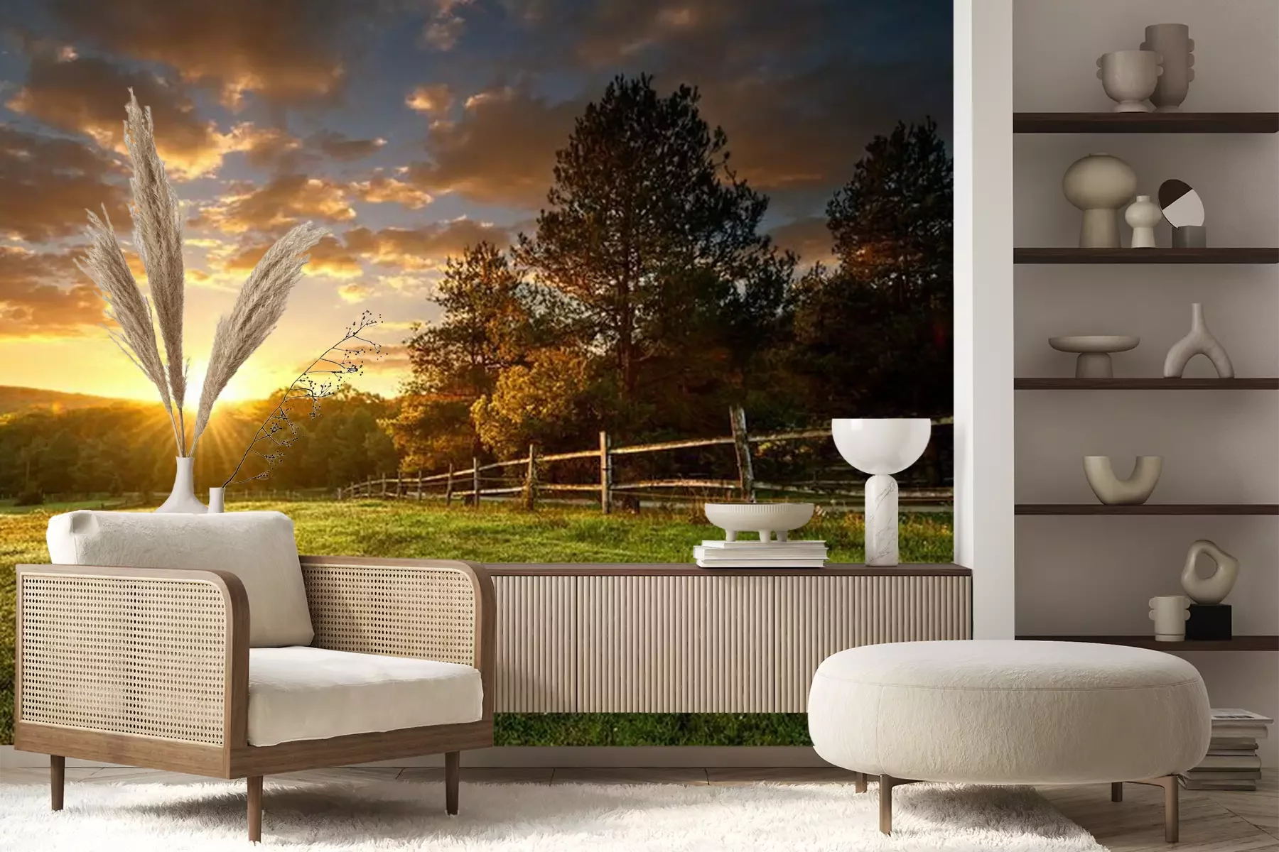 Het materiaal Premium+ is een gestructureerd vinyl op vlies met een gewicht van 255 g/m², dat kleine oneffenheden in de muur effectief camoufleert. De subtiele structuur van fijn zand geeft het oppervlak een exclusieve uitstraling, terwijl de halfmatte afwerking de diepte van de kleuren benadrukt. Het materiaal is dampdoorlatend, waardoor het ook in de keuken en badkamer kan worden gebruikt. De maximale breedte van één baan bedraagt 100 cm – bij grotere afmetingen wordt het fotobehang in meerdere gelijke banen verdeeld. De lijm wordt direct op de muur aangebracht en het behang wordt rand-aan-rand geplakt, wat zorgt voor een esthetisch resultaat zonder zichtbare naden. Het oppervlak kan gemakkelijk worden schoongemaakt door het voorzichtig af te nemen met een vochtige doek.