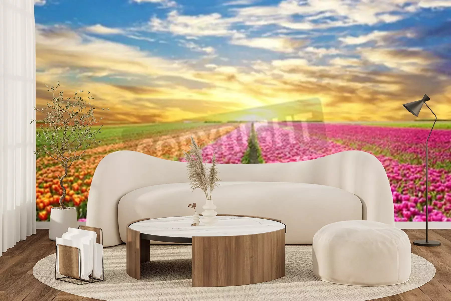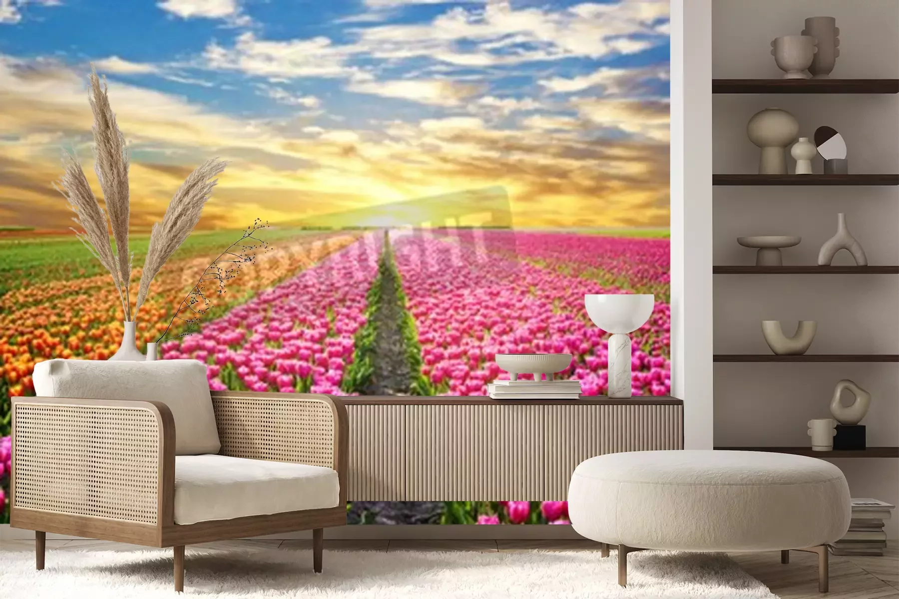 Fotobehang Zonsopgang boven een veld met tulpen