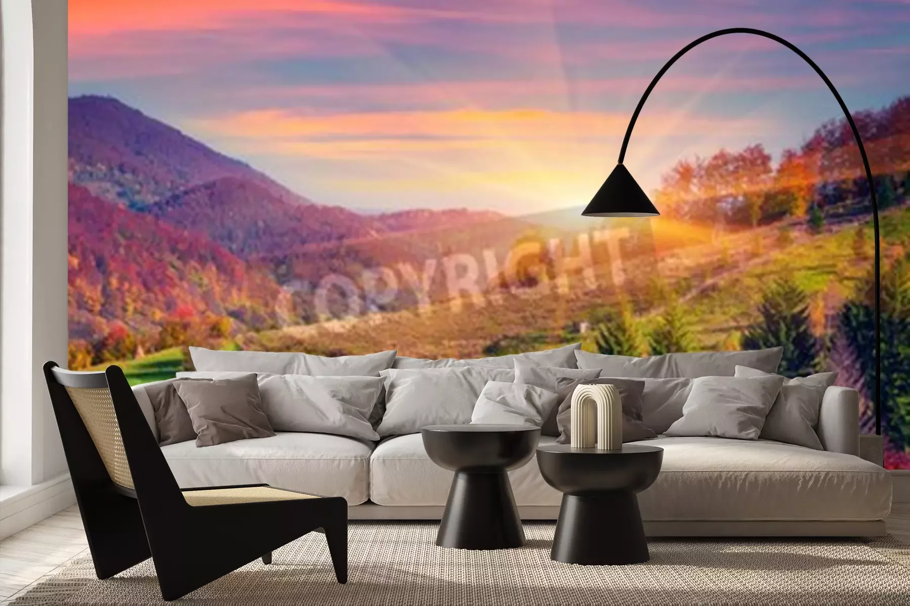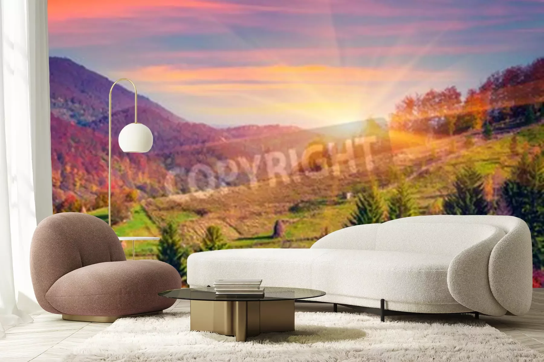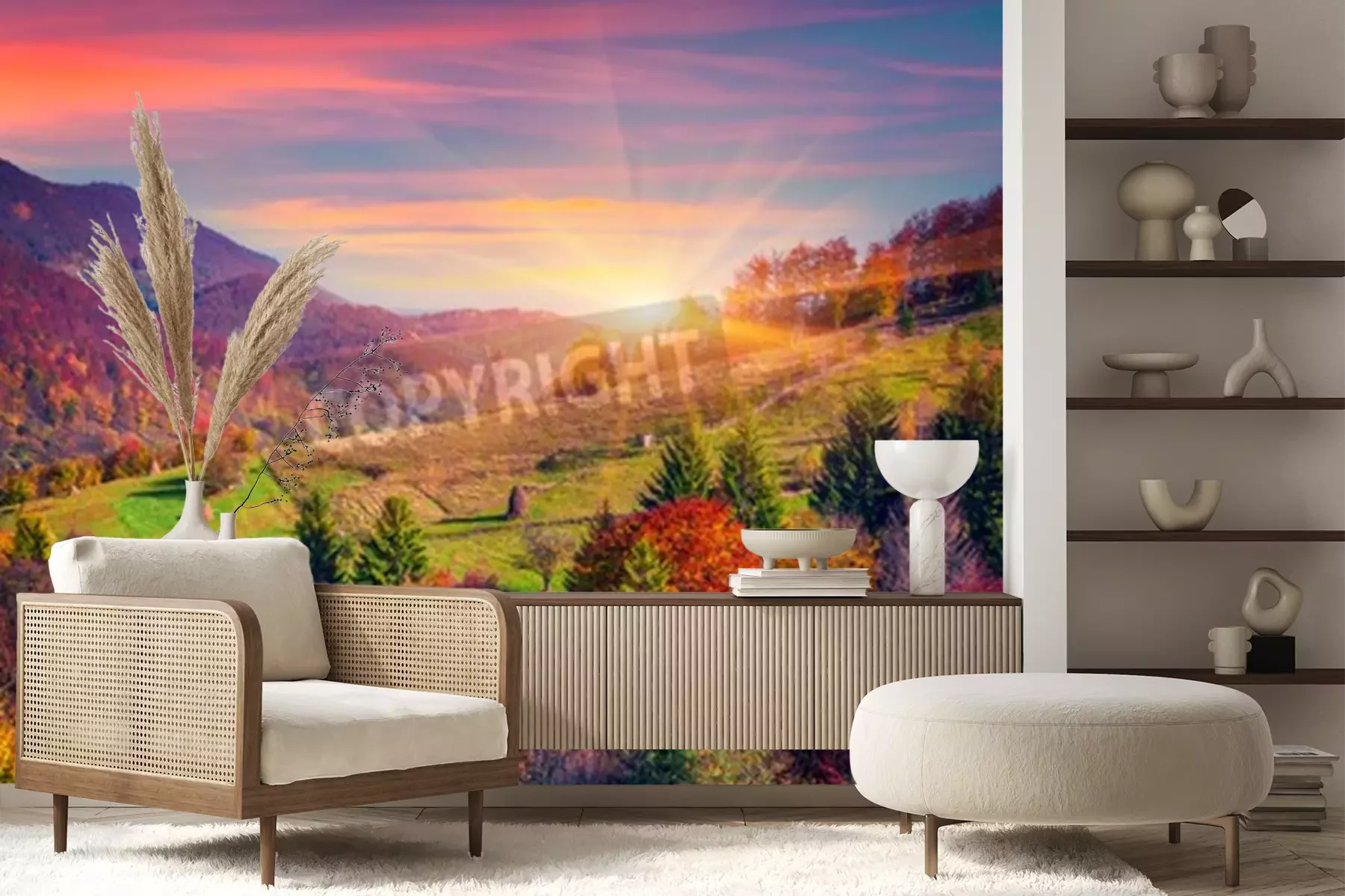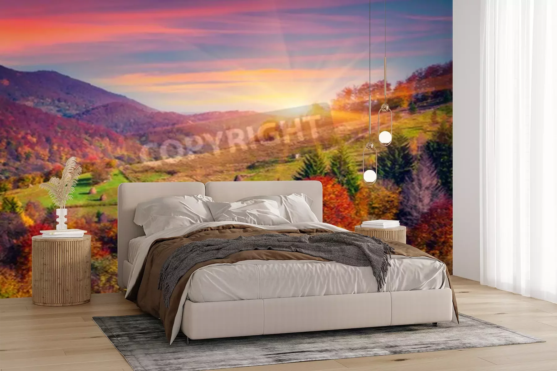 Fotobehang Zonsopgang en bomen in de herfst