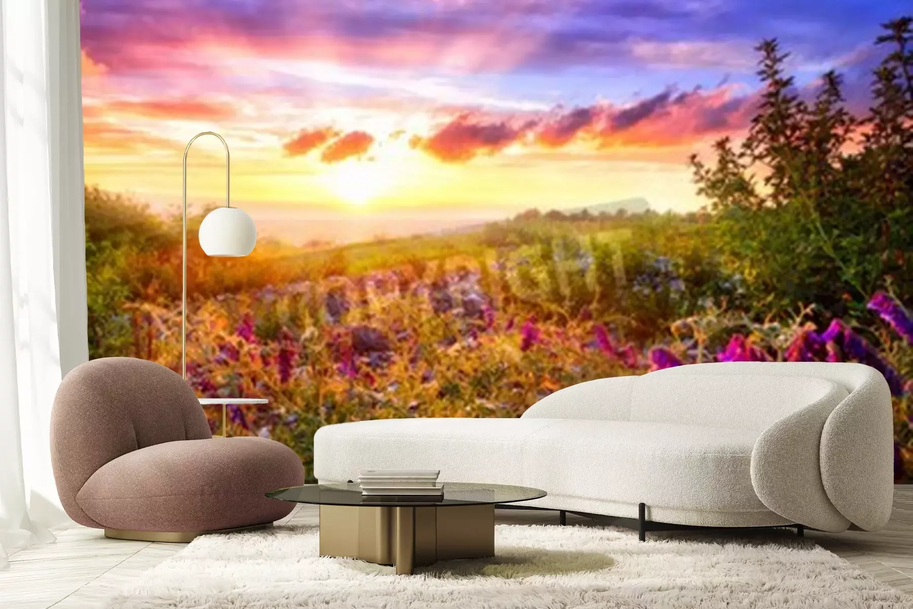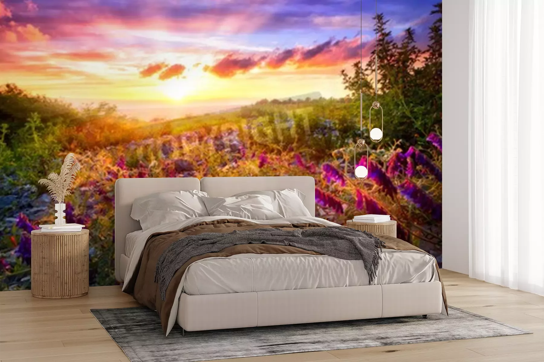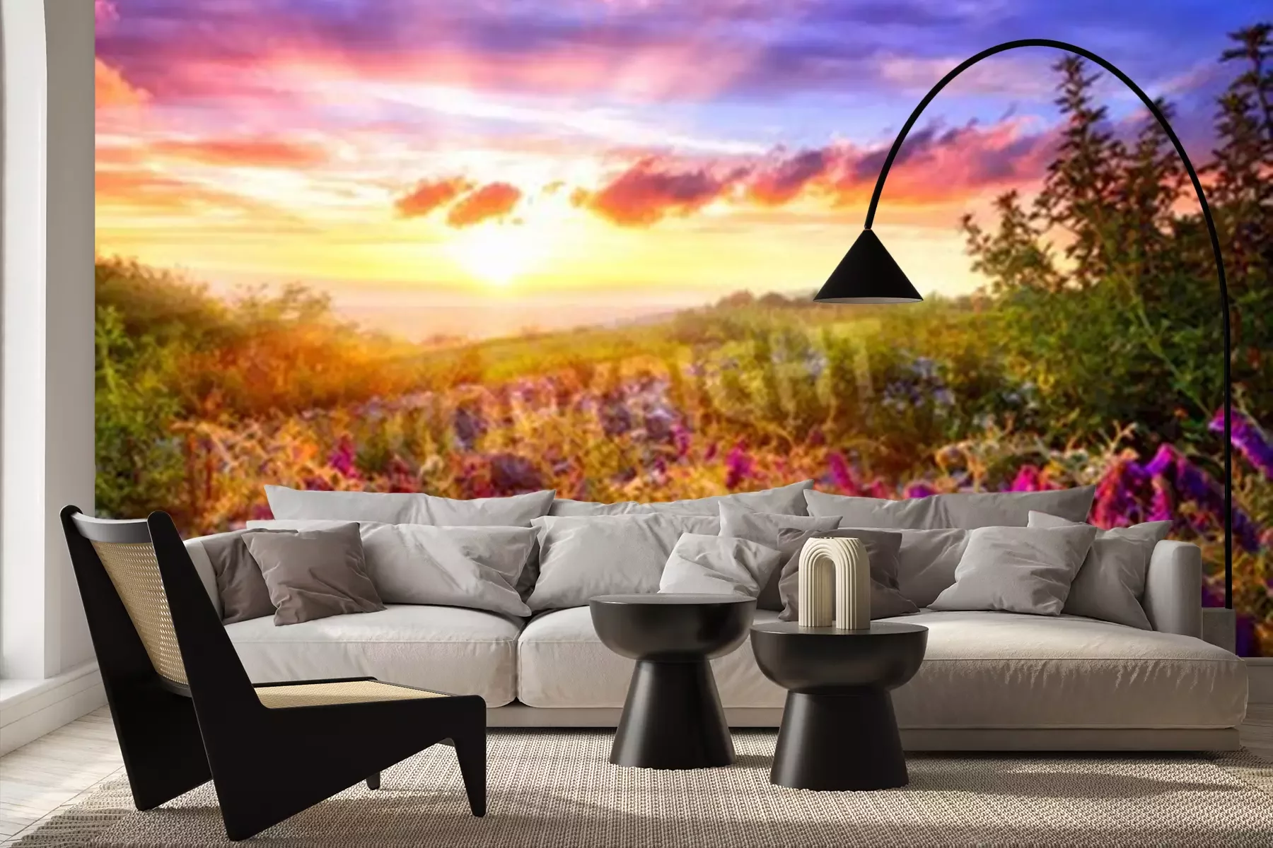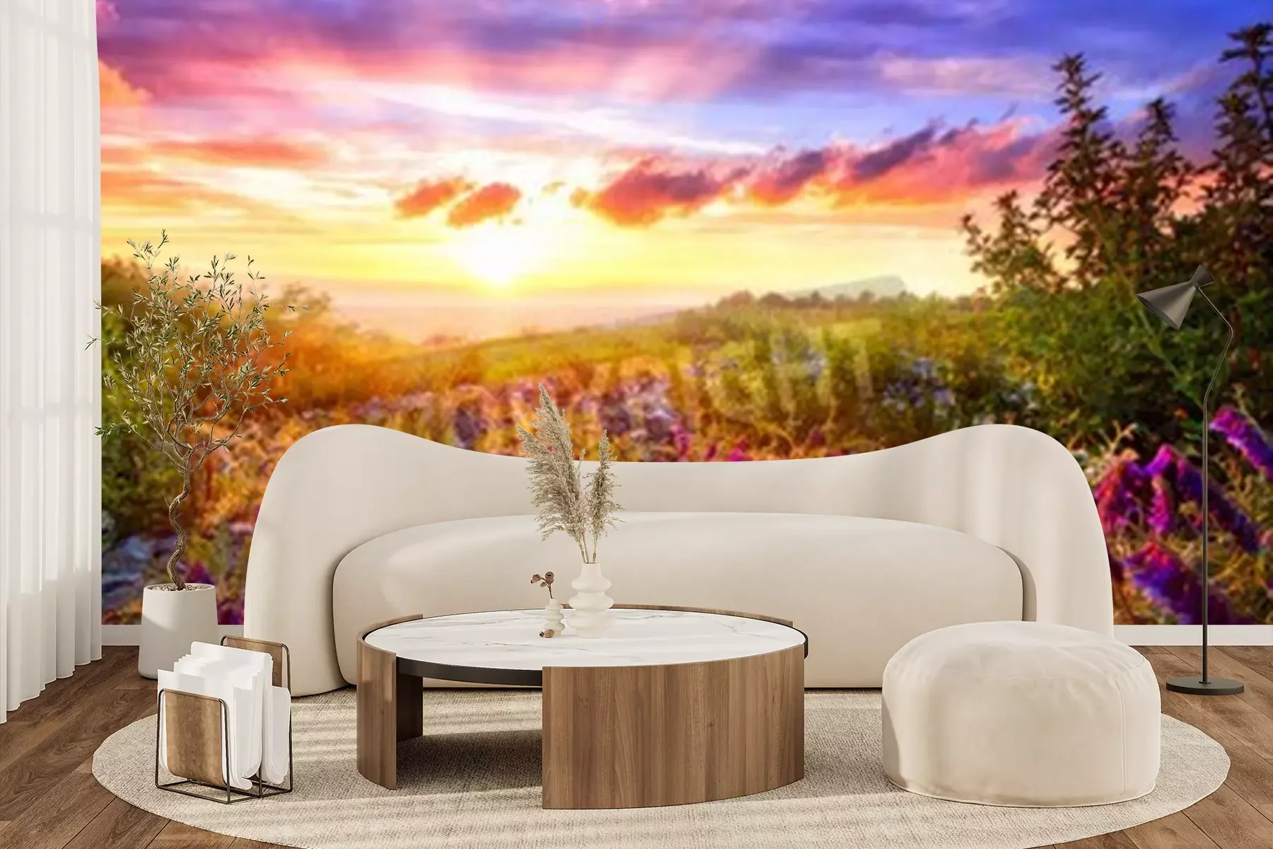 Fotobehang Zonsopgang en een veld vol bloemen