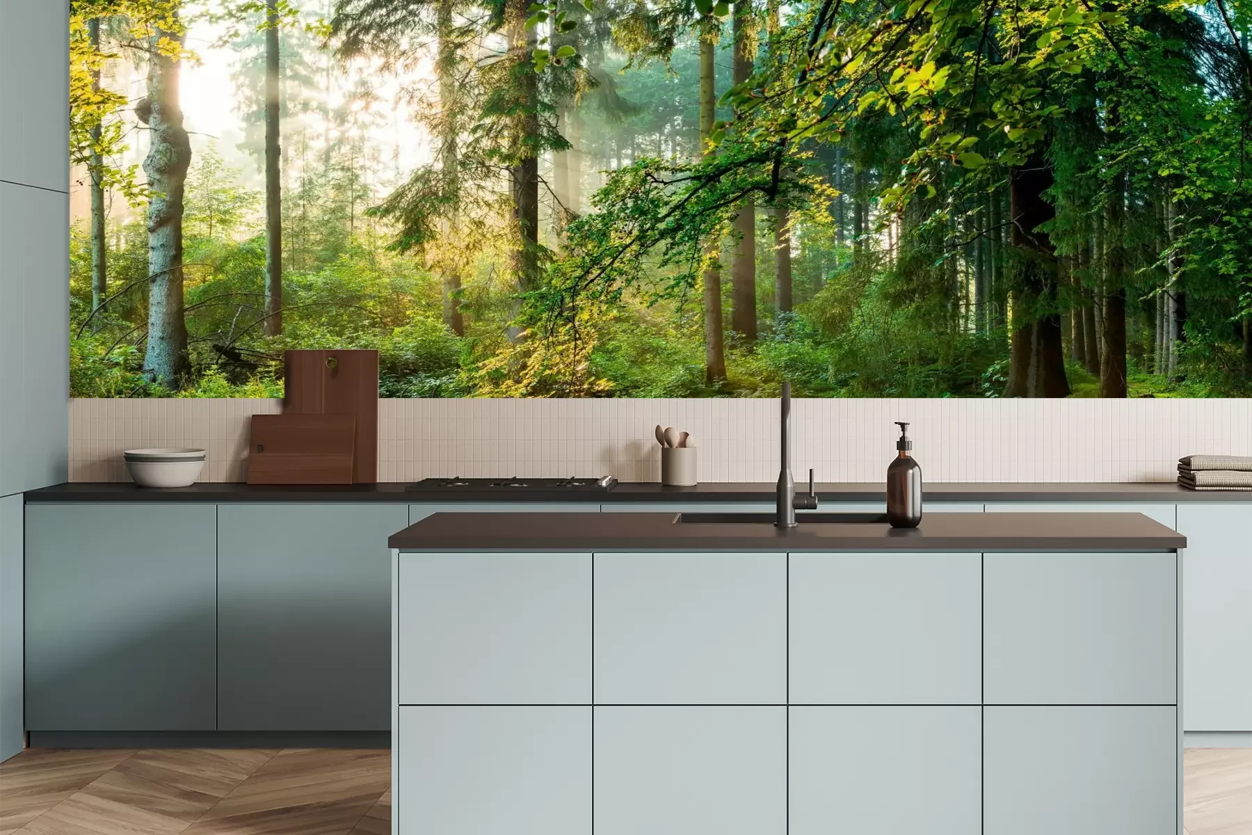 Het materiaal Premium is een glad vinyl op vlies, dat bestand is tegen uitrekken en vervorming. Het is dampdoorlatend – de muren kunnen vrij ademen – waardoor het geschikt is voor gebruik in de keuken en badkamer. Bij vervuiling kan het materiaal worden afgenomen met een vochtige doek. De maximale breedte van één baan bedraagt 95 of 105 cm, afhankelijk van de beschikbaarheid. Montage vindt plaats met de rand-aan-rand methode, wat een esthetisch resultaat zonder zichtbare naden oplevert. Omdat de lijm rechtstreeks op de muur wordt aangebracht, verloopt de installatie van het fotobehang snel en eenvoudig.