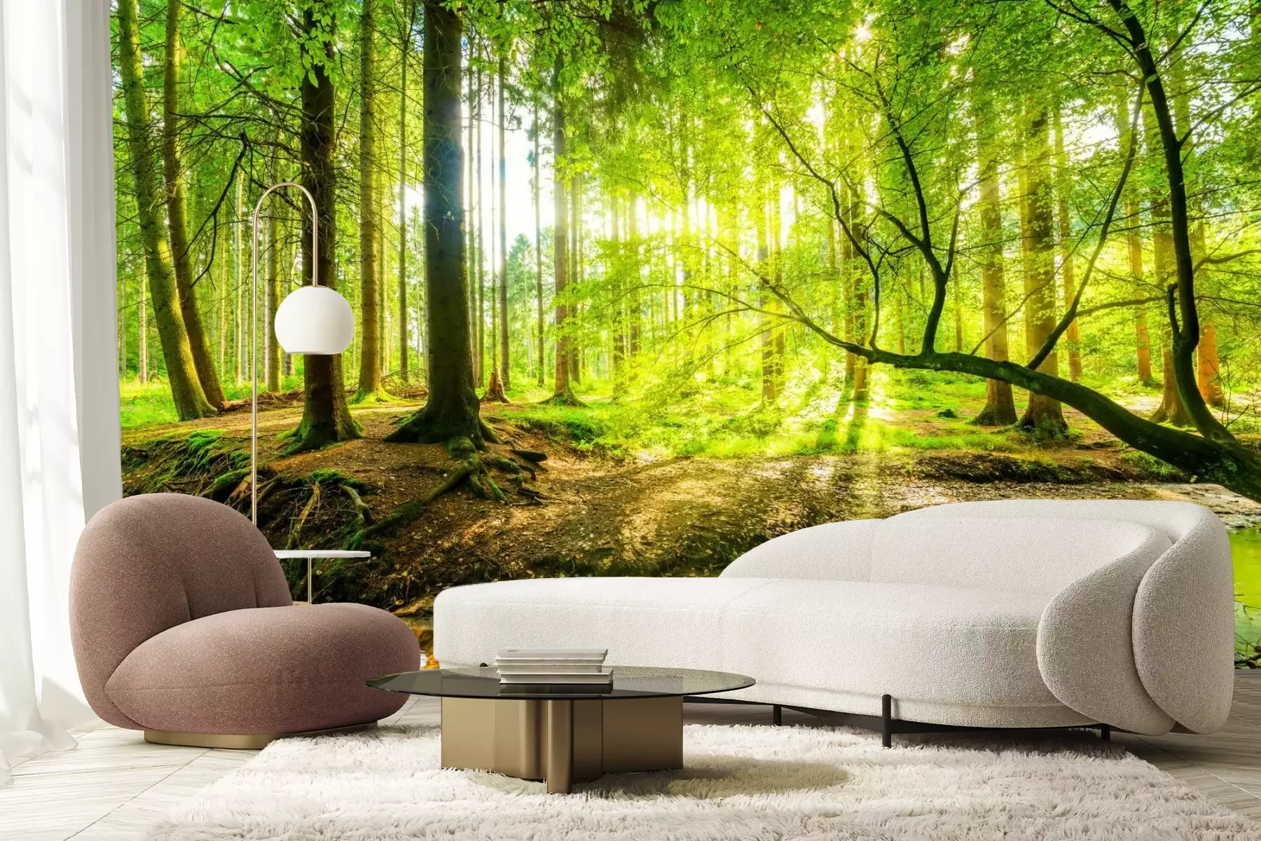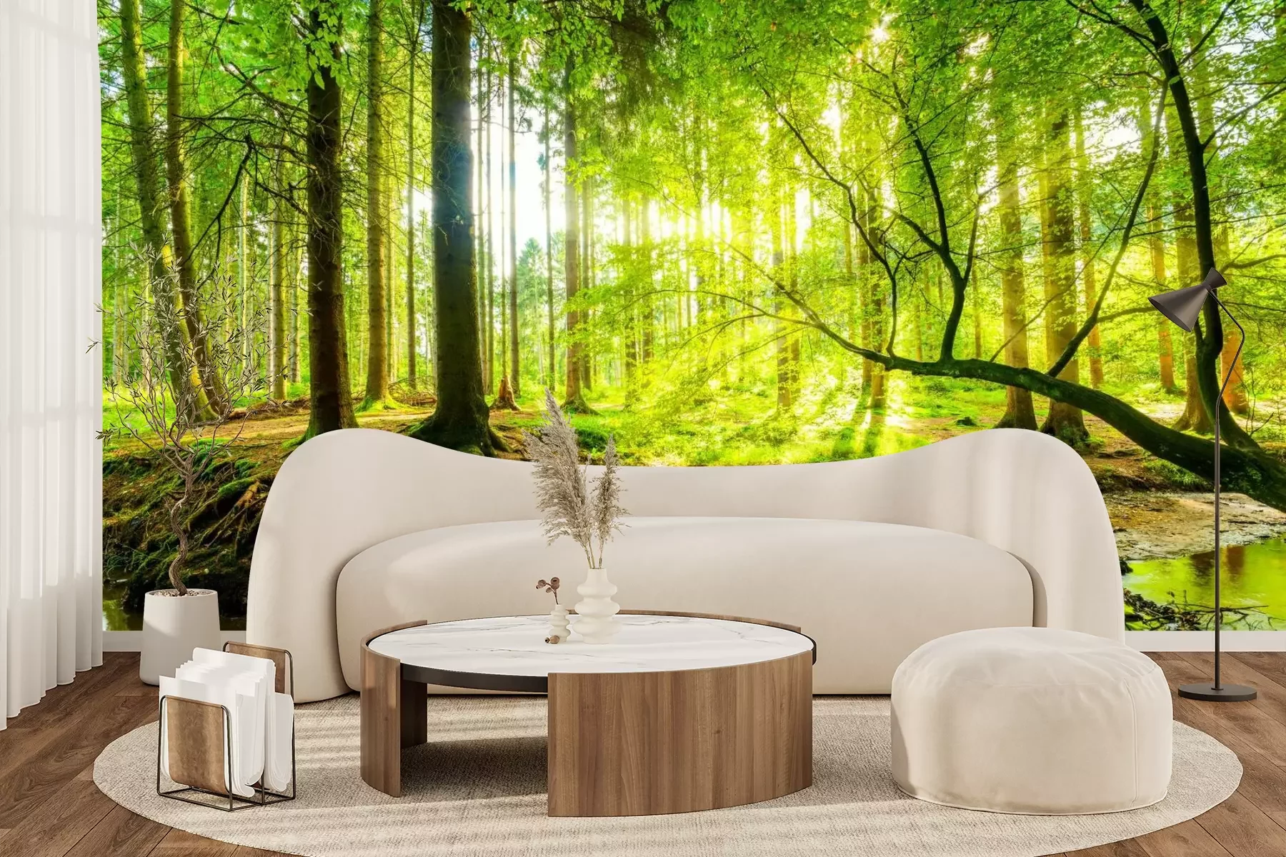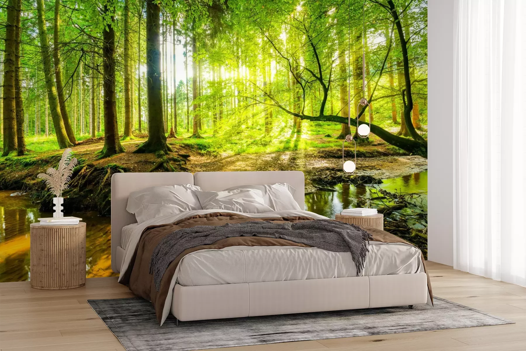 Zonnestralen in het bosDe nabijheid van groen en natuur brengt een gevoel van welzijn, kalmeert en ontspant. Ervaar het zelf door te kiezen voor een trendy wanddecoratie zoals een fotobehang. Bos, zon die door de bomen schijnt en een rustige rivier – zo’n beeld zal het interieur van je woning compleet transformeren. Gebruik deze moderne wanddecoratie, die perfect werkt als centraal element in de ruimte. Plaats het als achtergrond met bos meubels om een extra decoratief accent toe te voegen. Een grootformaat wanddecoratie verandert de sfeer van de kamer en trekt de aandacht, waardoor een fotobehang een uitstekende keuze is. Zonnig bos is ideaal voor degenen die dagelijks willen genieten van de aanwezigheid van een realistisch landschap in hun interieur. Dankzij de hoogwaardige printkwaliteit worden alle details perfect weergegeven – van de textuur van de boomschors tot de subtiele lichtreflecties op het wateroppervlak. De diepe, verzadigde kleuren zijn bestand tegen vervaging, waardoor het bos-motief jarenlang mooi blijft. Wij drukken elk fotobehang op maat, zodat het zowel in grote als in kleinere ruimtes past. De installatie is snel en eenvoudig – het materiaal hecht perfect aan de muur en zorgt voor een luchtbelvrije applicatie. Bovendien is het krasbestendig en gemakkelijk schoon te houden, waardoor het in veel verschillende ruimtes tot zijn recht komt. Het zal bijzonder goed staan op een muur in een moderne woonkamer, gecombineerd met bos eenvoudige meubels van natuurlijk hout en decoratieve rotan manden. Met deze decoratie kun je een bank met een tafel benadrukken, waardoor je een comfortabele ruimte creëert om tijd door te brengen met gasten en familie. Maar de woonkamer is niet de enige plek waar fotobehang tot zijn recht komt. Bos, zon en bomen in de slaapkamer passen perfect met bos plek waar enatuurlijke textielsoorten zoals katoen of linnen. Tegen zo’n achtergrond zullen het bed, de meubels, lampen en andere accessoires een harmonieus geheel vormen en een knusse oase van rust creëren. Als je van de natuur houdt, is het een goed idee om fotobehang bij je bureau te plaatsen. Rivier omringd door groen helpt het stressniveau te verlagen, waardoor deze wanddecoratie ideaal is voor mensen die thuiswerken. Met een schilderachtig uitzicht worden dagelijkse taken een stuk aangenamer. Een fotobehang met bos is echter niet alleen geschikt voor privéruimtes, maar past ook uitstekend in ontmoetingsplaatsen zoals restaurants of cafés die zijn ingericht in een eco- of eclectische stijl.