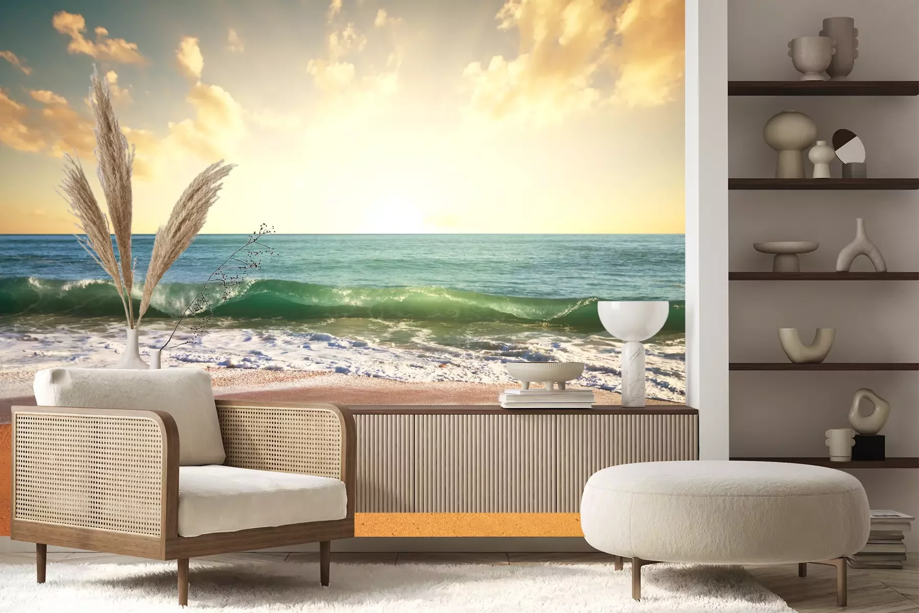 Het materiaal Premium+ is een gestructureerd vinyl op vlies met een gewicht van 255 g/m², dat kleine oneffenheden in de muur effectief camoufleert. De subtiele structuur van fijn zand geeft het oppervlak een exclusieve uitstraling, terwijl de halfmatte afwerking de diepte van de kleuren benadrukt. Het materiaal is dampdoorlatend, waardoor het ook in de keuken en badkamer kan worden gebruikt. De maximale breedte van één baan bedraagt 100 cm – bij grotere afmetingen wordt het fotobehang in meerdere gelijke banen verdeeld. De lijm wordt direct op de muur aangebracht en het behang wordt rand-aan-rand geplakt, wat zorgt voor een esthetisch resultaat zonder zichtbare naden. Het oppervlak kan gemakkelijk worden schoongemaakt door het voorzichtig af te nemen met een vochtige doek.