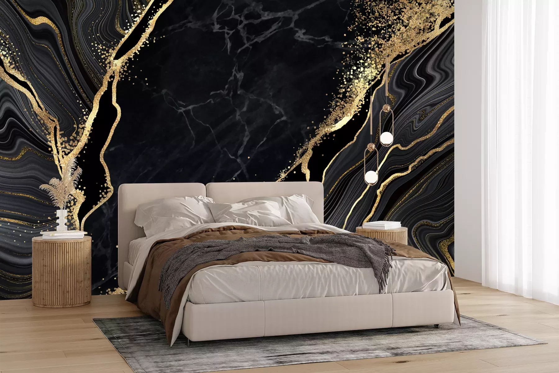 Het materiaal Premium+ is een gestructureerd vinyl op vlies met een gewicht van 255 g/m², dat kleine oneffenheden in de muur effectief camoufleert. De subtiele structuur van fijn zand geeft het oppervlak een exclusieve uitstraling, terwijl de halfmatte afwerking de diepte van de kleuren benadrukt. Het materiaal is dampdoorlatend, waardoor het ook in de keuken en badkamer kan worden gebruikt. De maximale breedte van één baan bedraagt 100 cm – bij grotere afmetingen wordt het fotobehang in meerdere gelijke banen verdeeld. De lijm wordt direct op de muur aangebracht en het behang wordt rand-aan-rand geplakt, wat zorgt voor een esthetisch resultaat zonder zichtbare naden. Het oppervlak kan gemakkelijk worden schoongemaakt door het voorzichtig af te nemen met een vochtige doek.