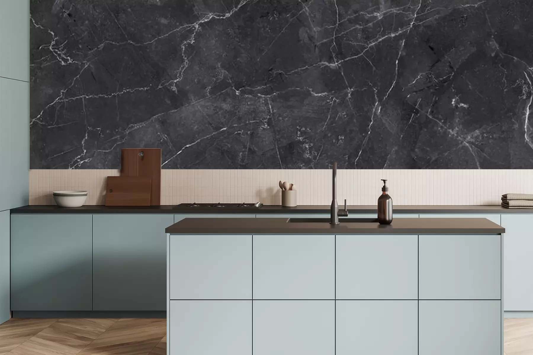 Het materiaal Premium is een glad vinyl op vlies, dat bestand is tegen uitrekken en vervorming. Het is dampdoorlatend – de muren kunnen vrij ademen – waardoor het geschikt is voor gebruik in de keuken en badkamer. Bij vervuiling kan het materiaal worden afgenomen met een vochtige doek. De maximale breedte van één baan bedraagt 95 of 105 cm, afhankelijk van de beschikbaarheid. Montage vindt plaats met de rand-aan-rand methode, wat een esthetisch resultaat zonder zichtbare naden oplevert. Omdat de lijm rechtstreeks op de muur wordt aangebracht, verloopt de installatie van het fotobehang snel en eenvoudig.