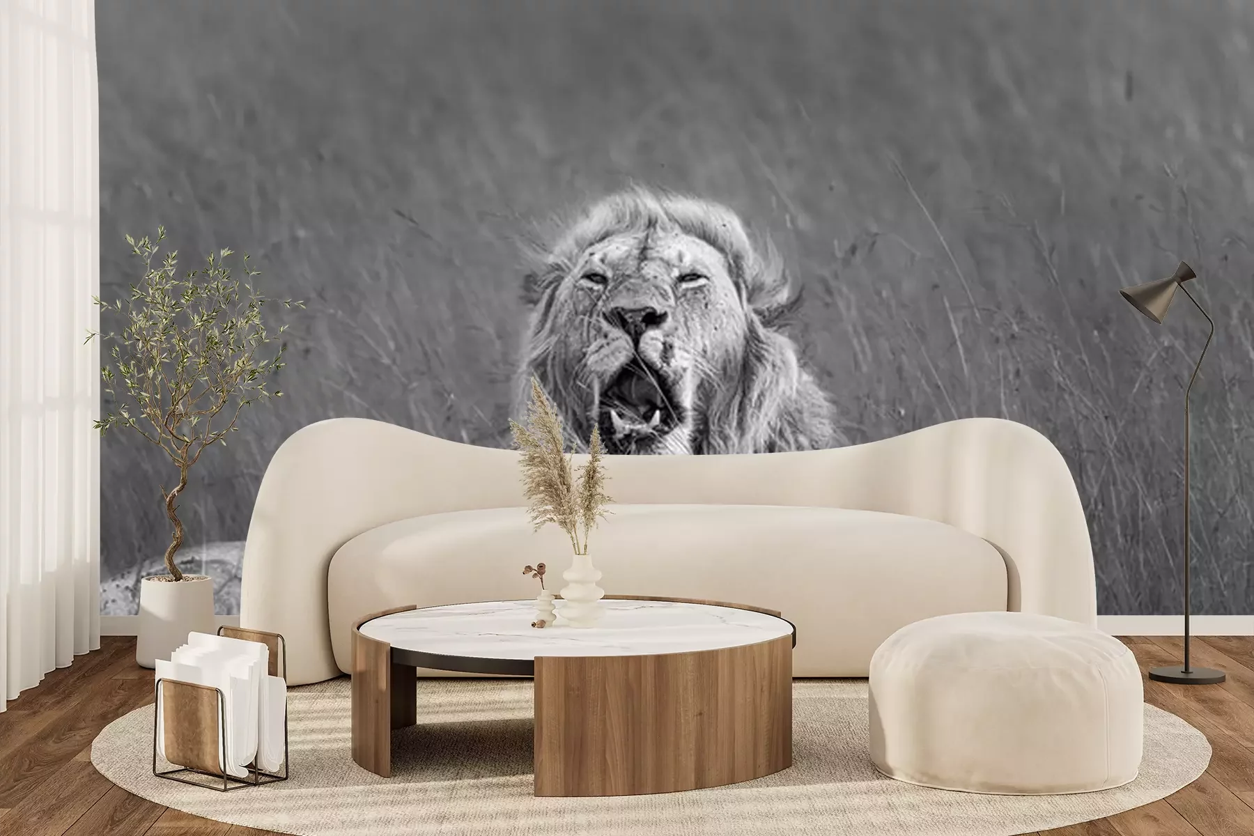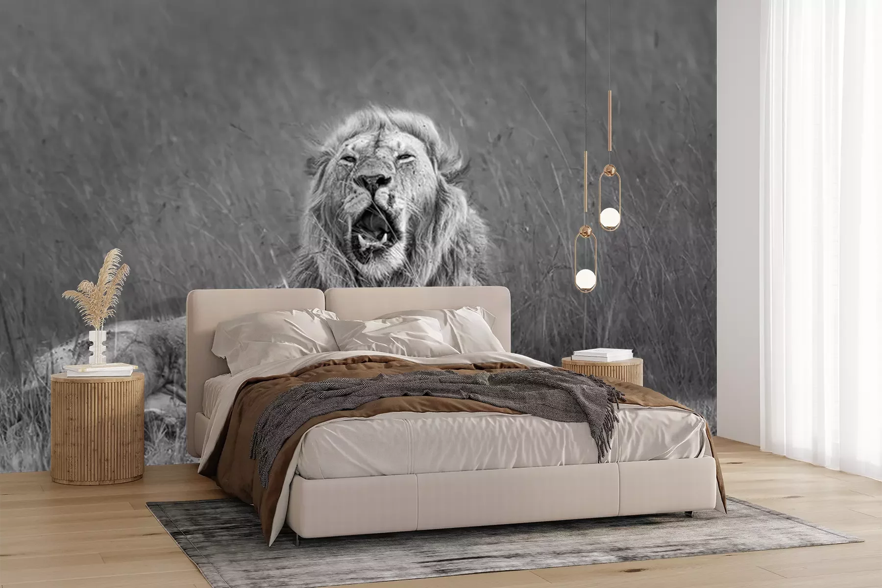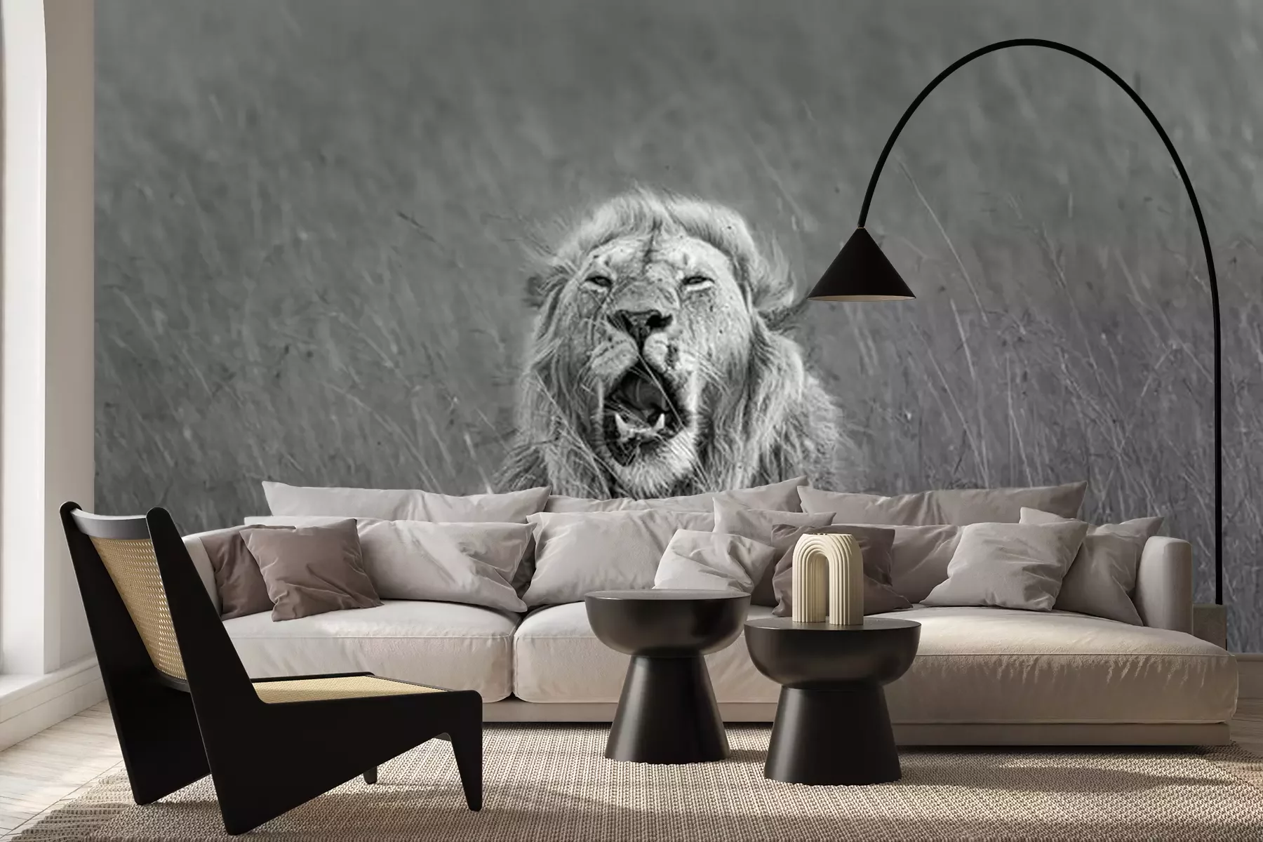 Fotobehang Zwart-wit concept van een leeuw die in het gras ligt