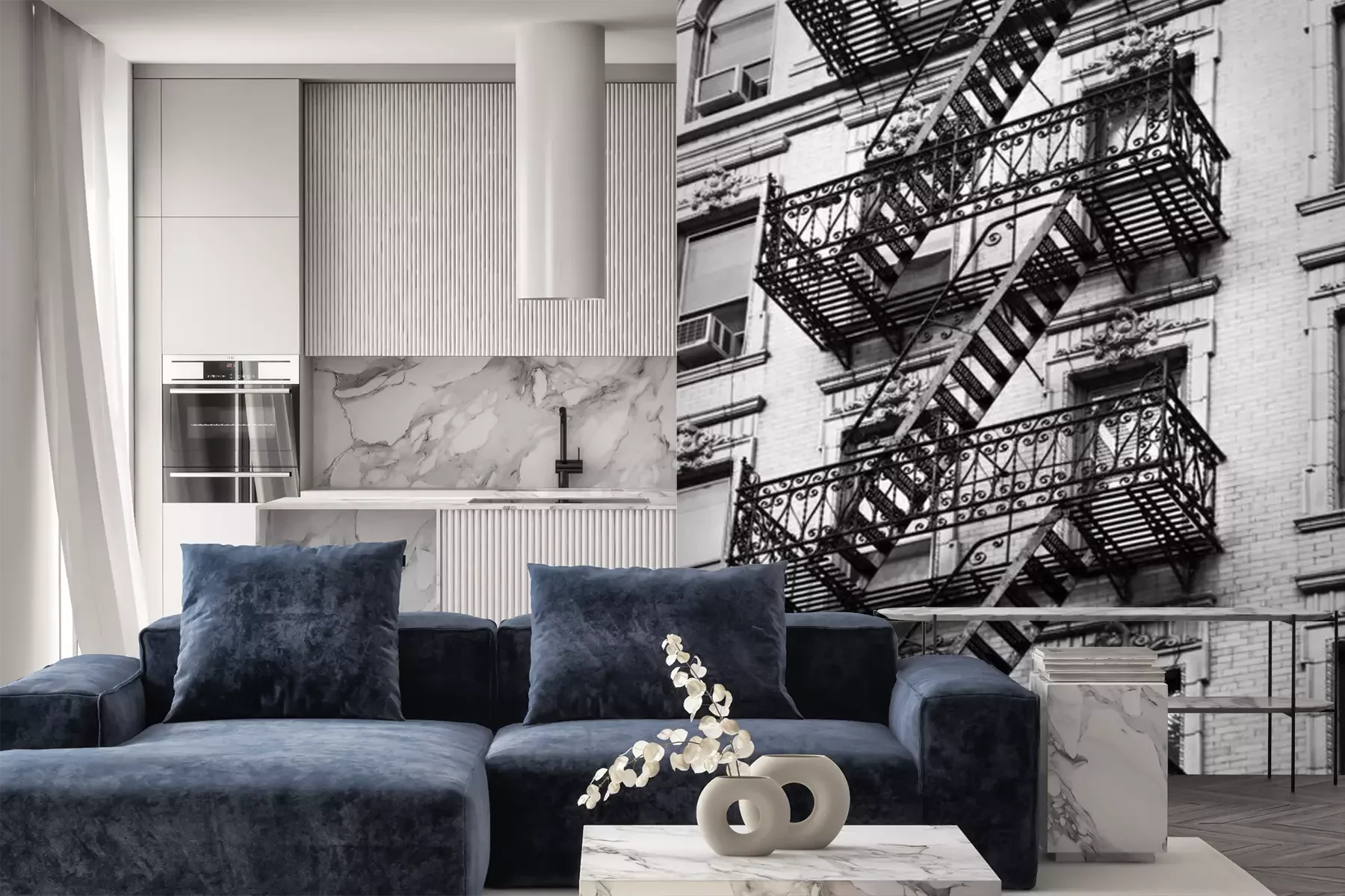 Het materiaal Premium is een glad vinyl op vlies, dat bestand is tegen uitrekken en vervorming. Het is dampdoorlatend – de muren kunnen vrij ademen – waardoor het geschikt is voor gebruik in de keuken en badkamer. Bij vervuiling kan het materiaal worden afgenomen met een vochtige doek. De maximale breedte van één baan bedraagt 95 of 105 cm, afhankelijk van de beschikbaarheid. Montage vindt plaats met de rand-aan-rand methode, wat een esthetisch resultaat zonder zichtbare naden oplevert. Omdat de lijm rechtstreeks op de muur wordt aangebracht, verloopt de installatie van het fotobehang snel en eenvoudig.