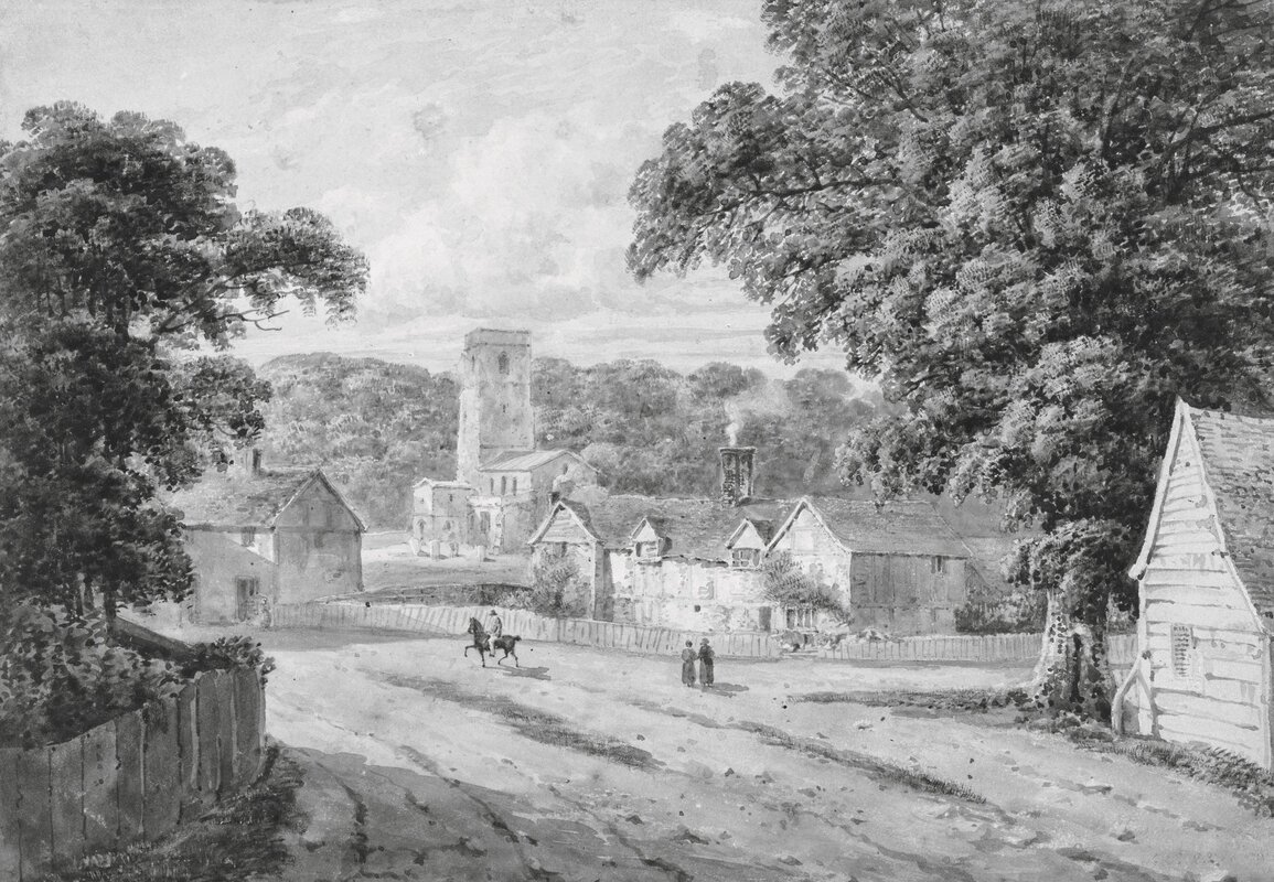 Fotobehang: Zwart-wit landelijk landschap met een nederzetting