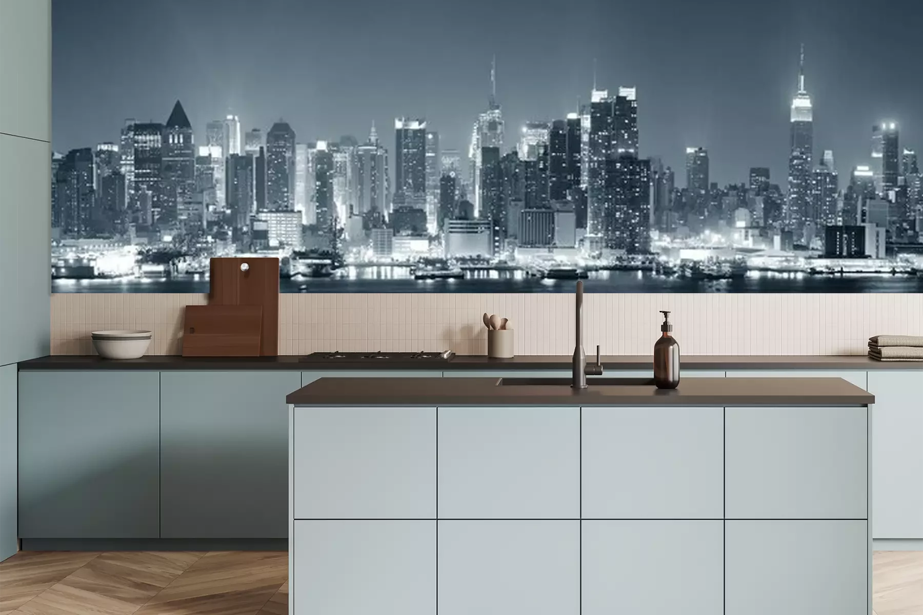 Het materiaal Premium is een glad vinyl op vlies, dat bestand is tegen uitrekken en vervorming. Het is dampdoorlatend – de muren kunnen vrij ademen – waardoor het geschikt is voor gebruik in de keuken en badkamer. Bij vervuiling kan het materiaal worden afgenomen met een vochtige doek. De maximale breedte van één baan bedraagt 95 of 105 cm, afhankelijk van de beschikbaarheid. Montage vindt plaats met de rand-aan-rand methode, wat een esthetisch resultaat zonder zichtbare naden oplevert. Omdat de lijm rechtstreeks op de muur wordt aangebracht, verloopt de installatie van het fotobehang snel en eenvoudig.