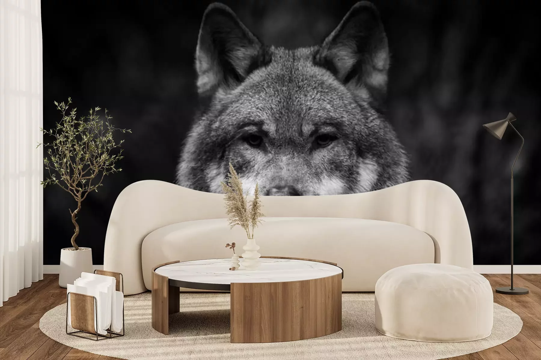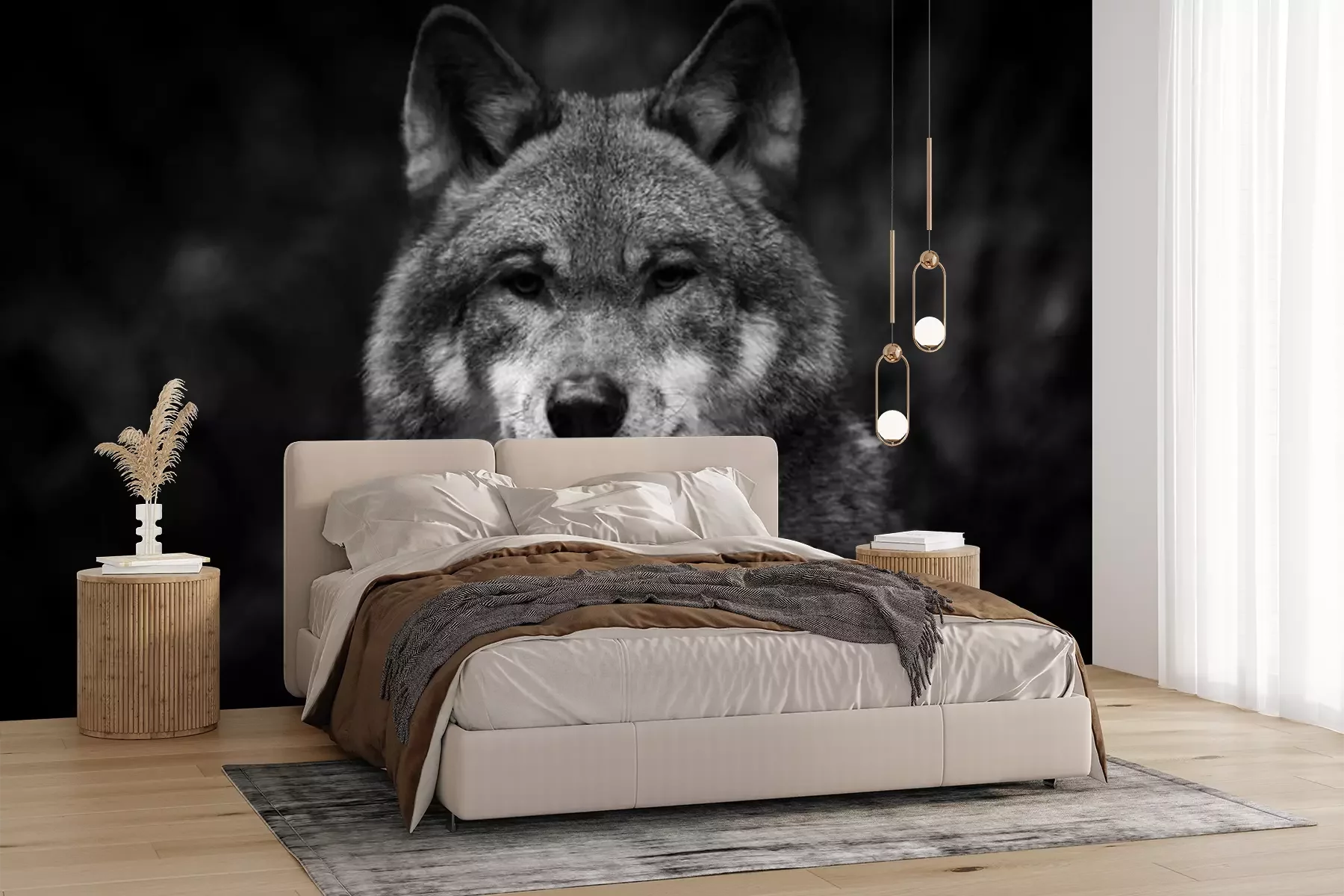 Fotobehang Zwart-wit portret van een wolf in het bos