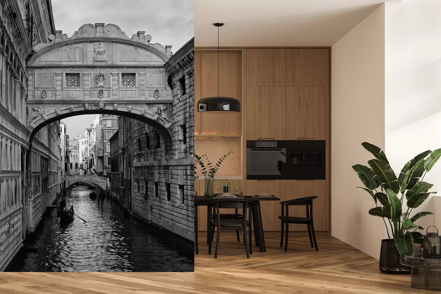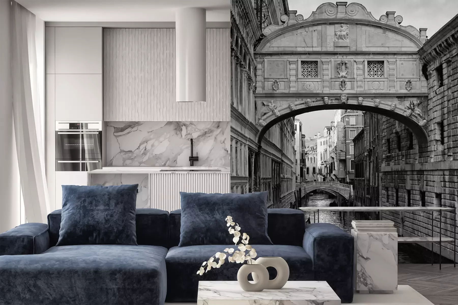 Het materiaal Premium is een glad vinyl op vlies, dat bestand is tegen uitrekken en vervorming. Het is dampdoorlatend – de muren kunnen vrij ademen – waardoor het geschikt is voor gebruik in de keuken en badkamer. Bij vervuiling kan het materiaal worden afgenomen met een vochtige doek. De maximale breedte van één baan bedraagt 95 of 105 cm, afhankelijk van de beschikbaarheid. Montage vindt plaats met de rand-aan-rand methode, wat een esthetisch resultaat zonder zichtbare naden oplevert. Omdat de lijm rechtstreeks op de muur wordt aangebracht, verloopt de installatie van het fotobehang snel en eenvoudig.