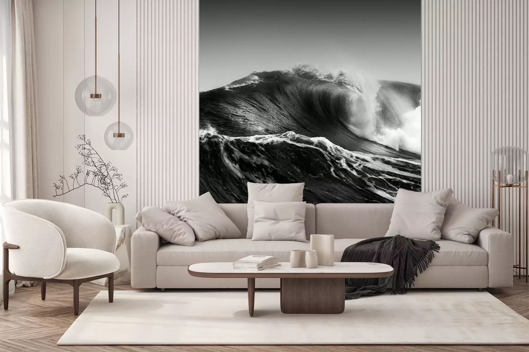 Het materiaal Premium+ is een gestructureerd vinyl op vlies met een gewicht van 255 g/m², dat kleine oneffenheden in de muur effectief camoufleert. De subtiele structuur van fijn zand geeft het oppervlak een exclusieve uitstraling, terwijl de halfmatte afwerking de diepte van de kleuren benadrukt. Het materiaal is dampdoorlatend, waardoor het ook in de keuken en badkamer kan worden gebruikt. De maximale breedte van één baan bedraagt 100 cm – bij grotere afmetingen wordt het fotobehang in meerdere gelijke banen verdeeld. De lijm wordt direct op de muur aangebracht en het behang wordt rand-aan-rand geplakt, wat zorgt voor een esthetisch resultaat zonder zichtbare naden. Het oppervlak kan gemakkelijk worden schoongemaakt door het voorzichtig af te nemen met een vochtige doek.