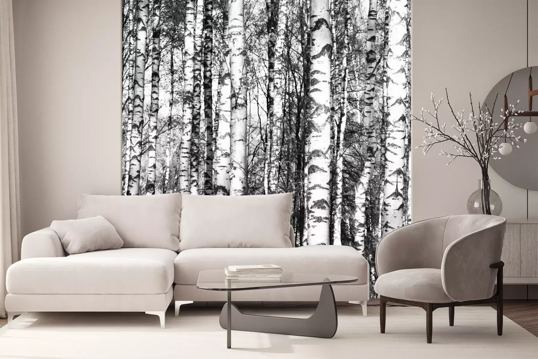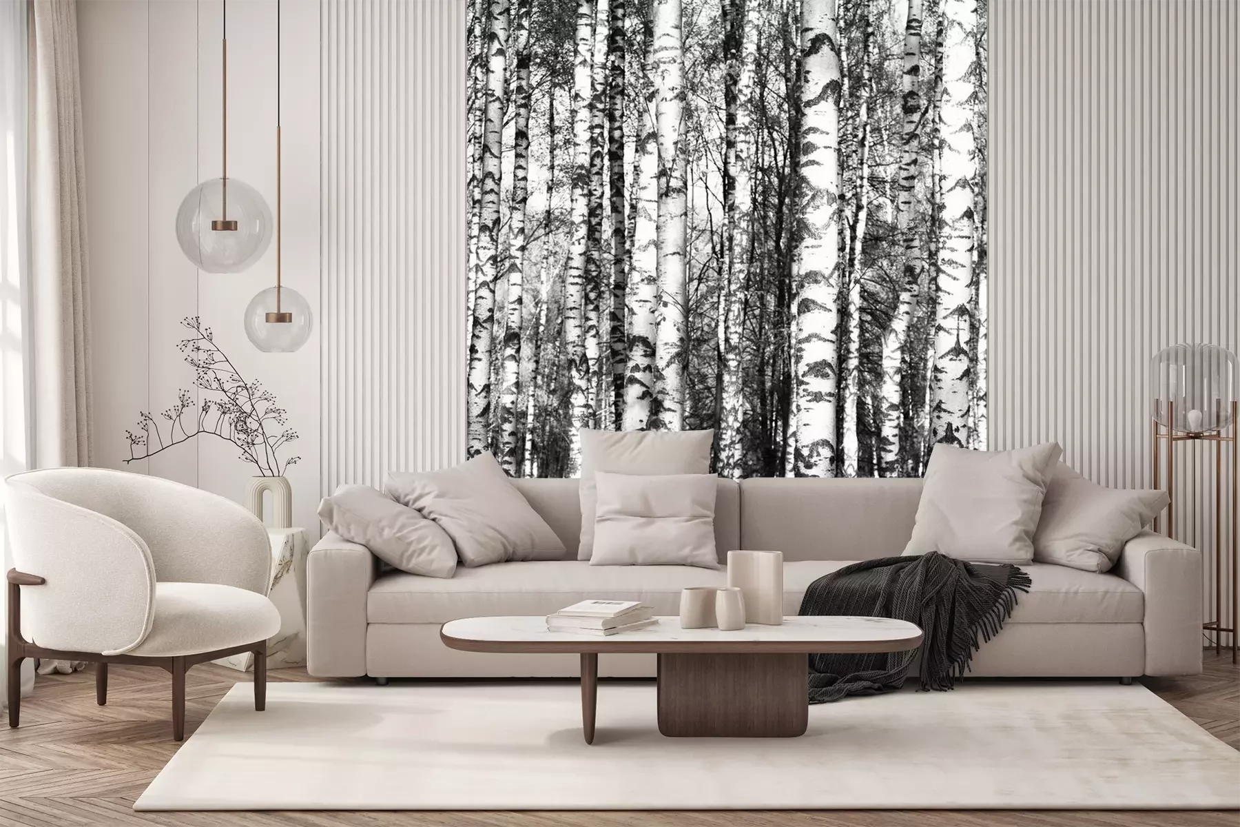 Lente zwart-witte berkenstammenFotobehang