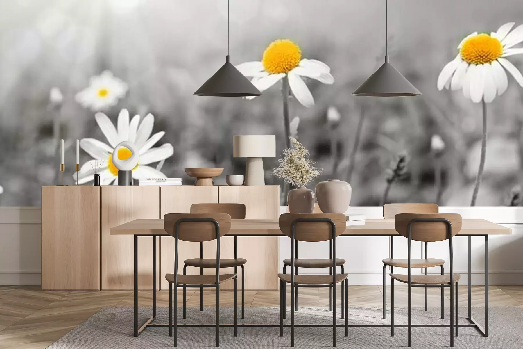 Fotobehang Zwart-witte madeliefjes met geel accent