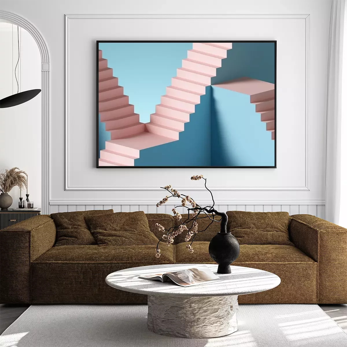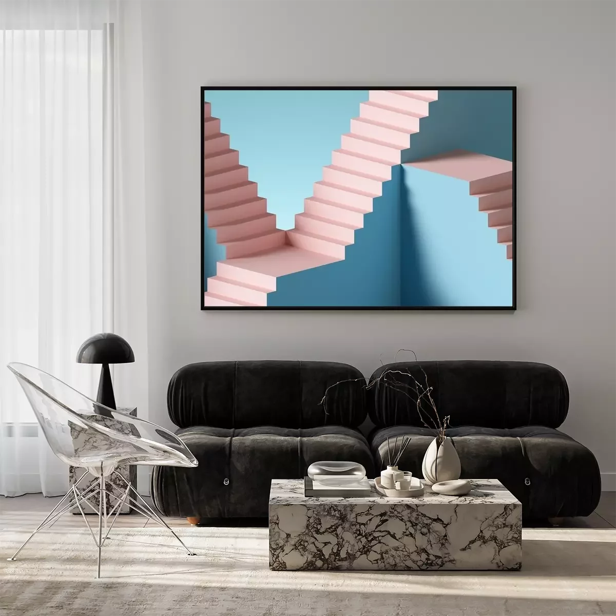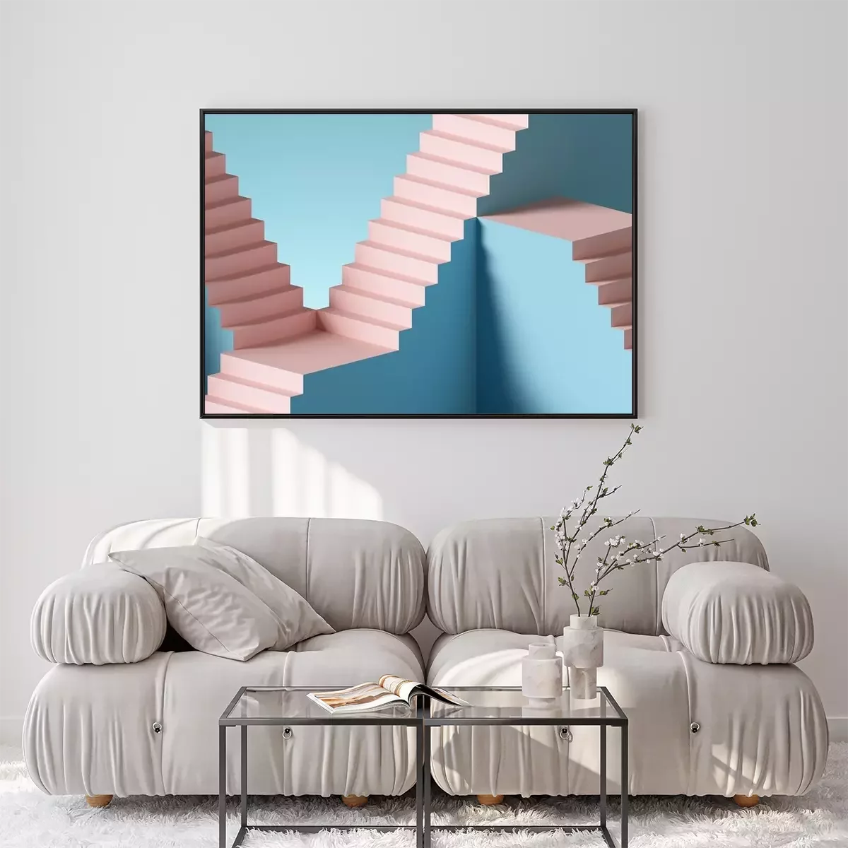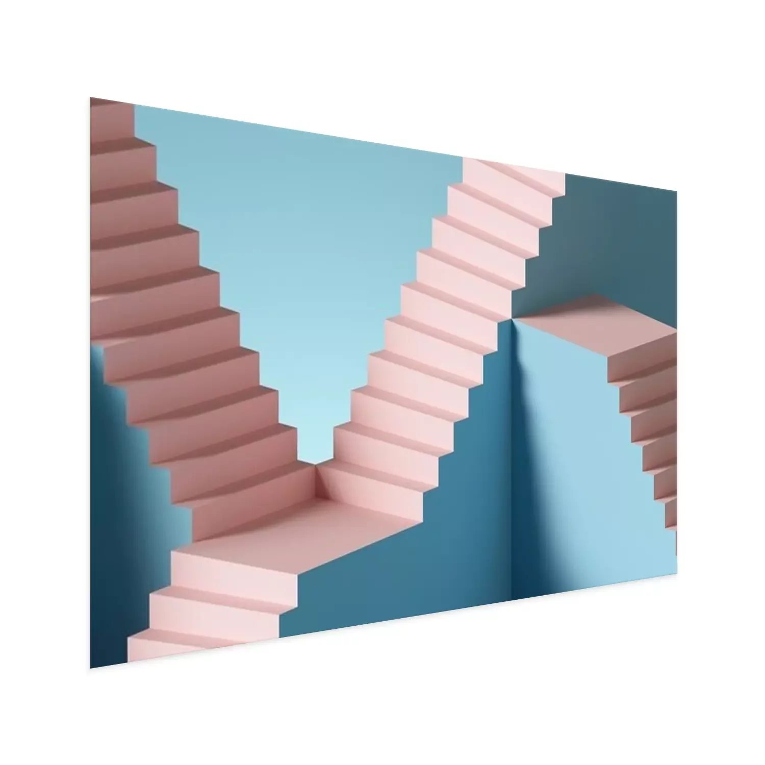 Poster: 3d render, abstract background with steps and staircase, in pink and blue pastel colors. Architectural design elements.