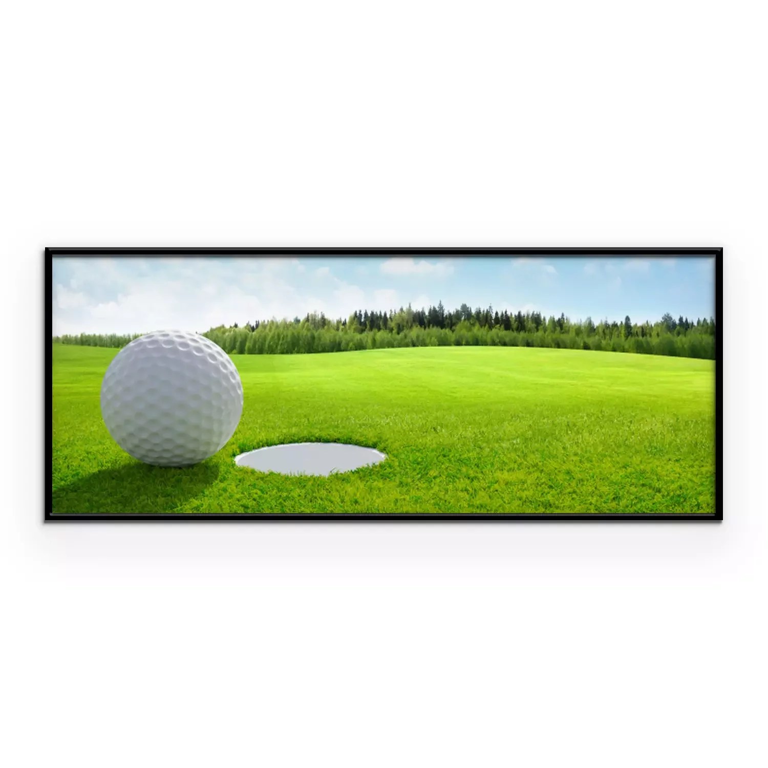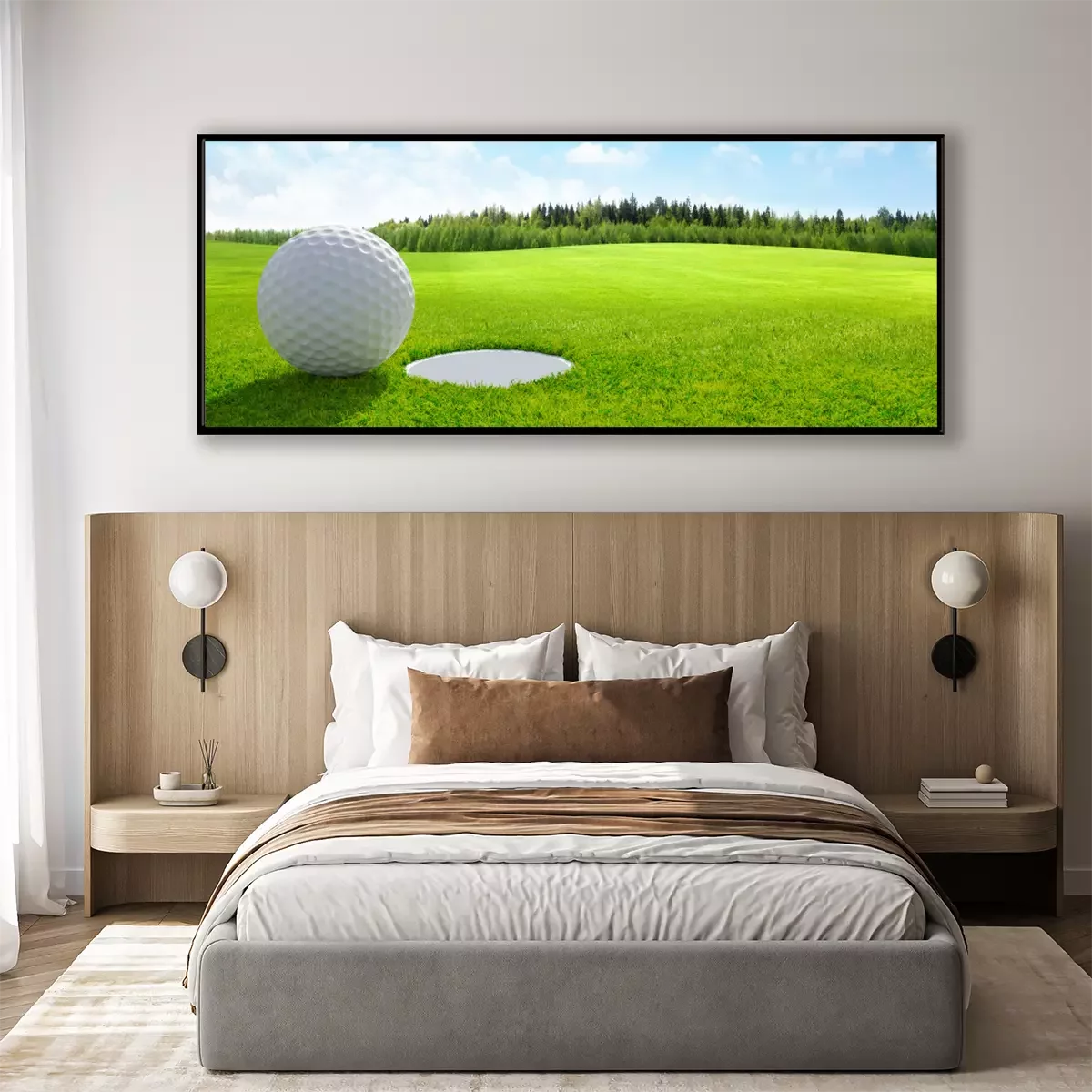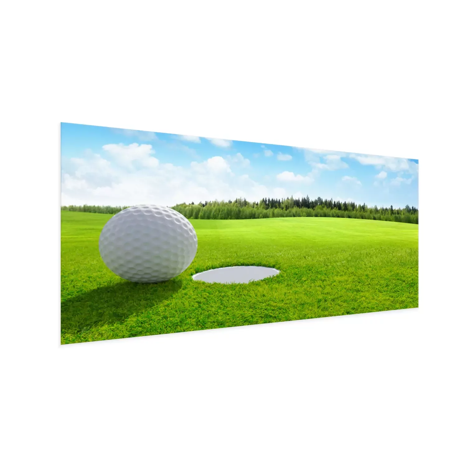 Poster: 3d render Close up of golf ball on green in golf course. sport background.