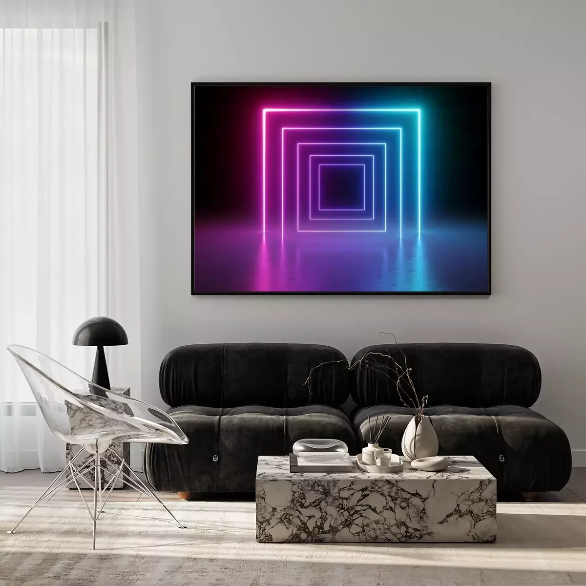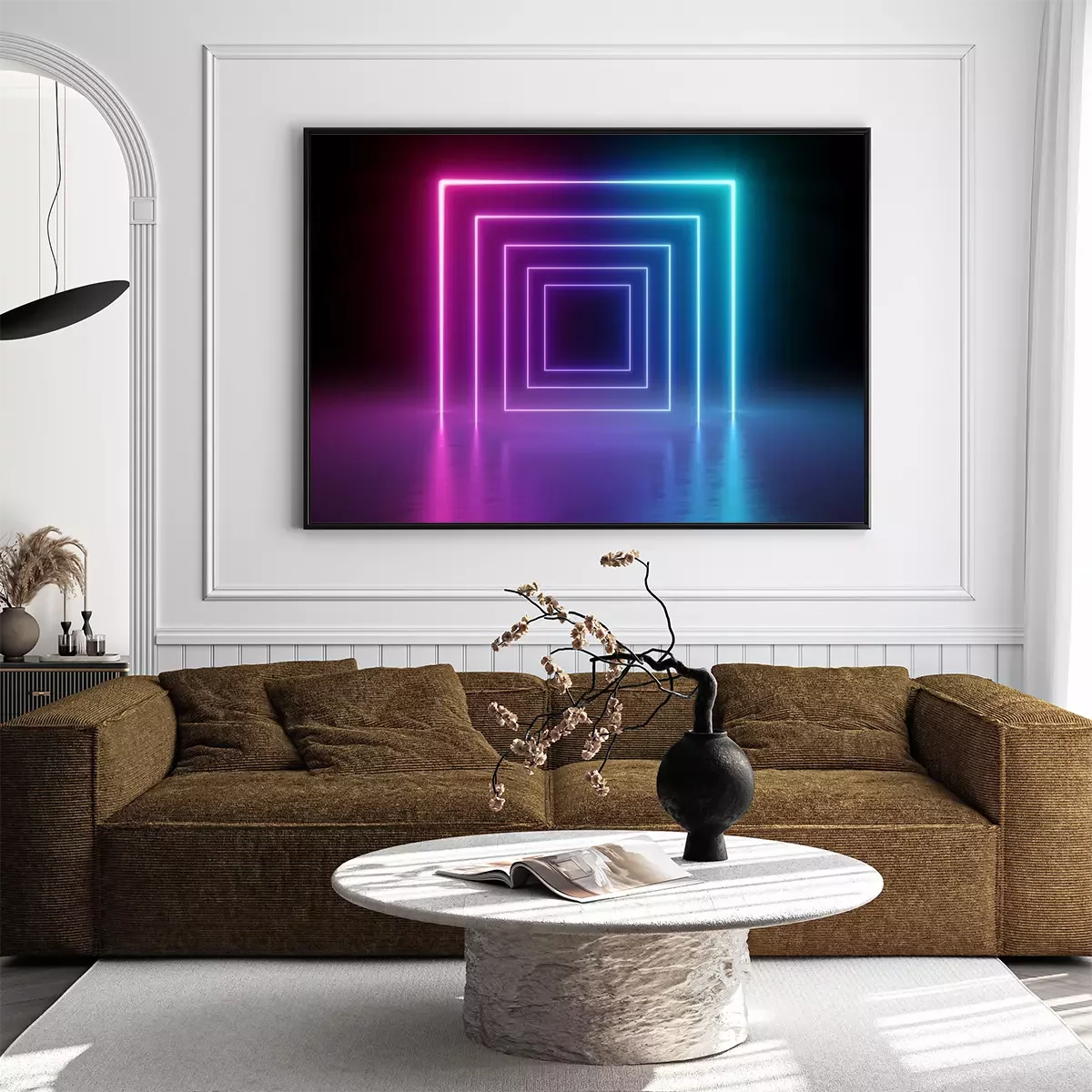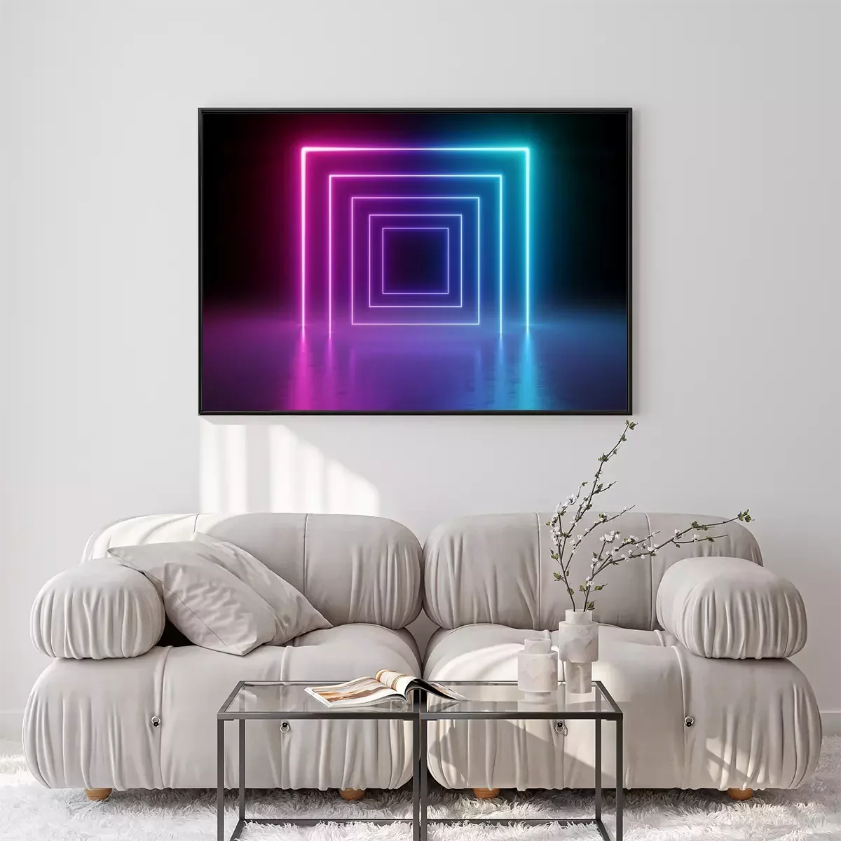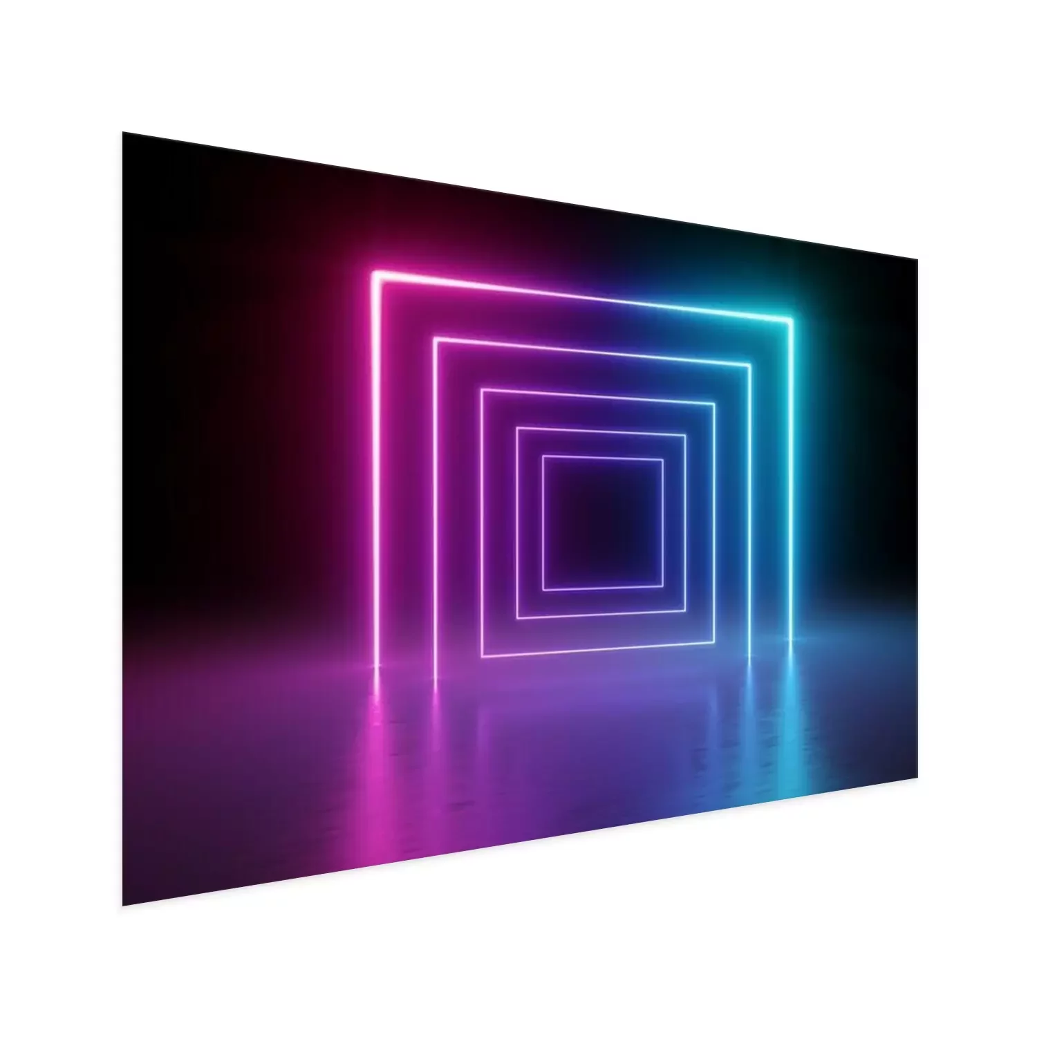 Poster: 3d render, gloeiende lijnen, tunnel, neonlichten, virtual reality, abstracte achtergrond, vierkante portal, boog, roze blauw spectrum levendige kleuren, laser show