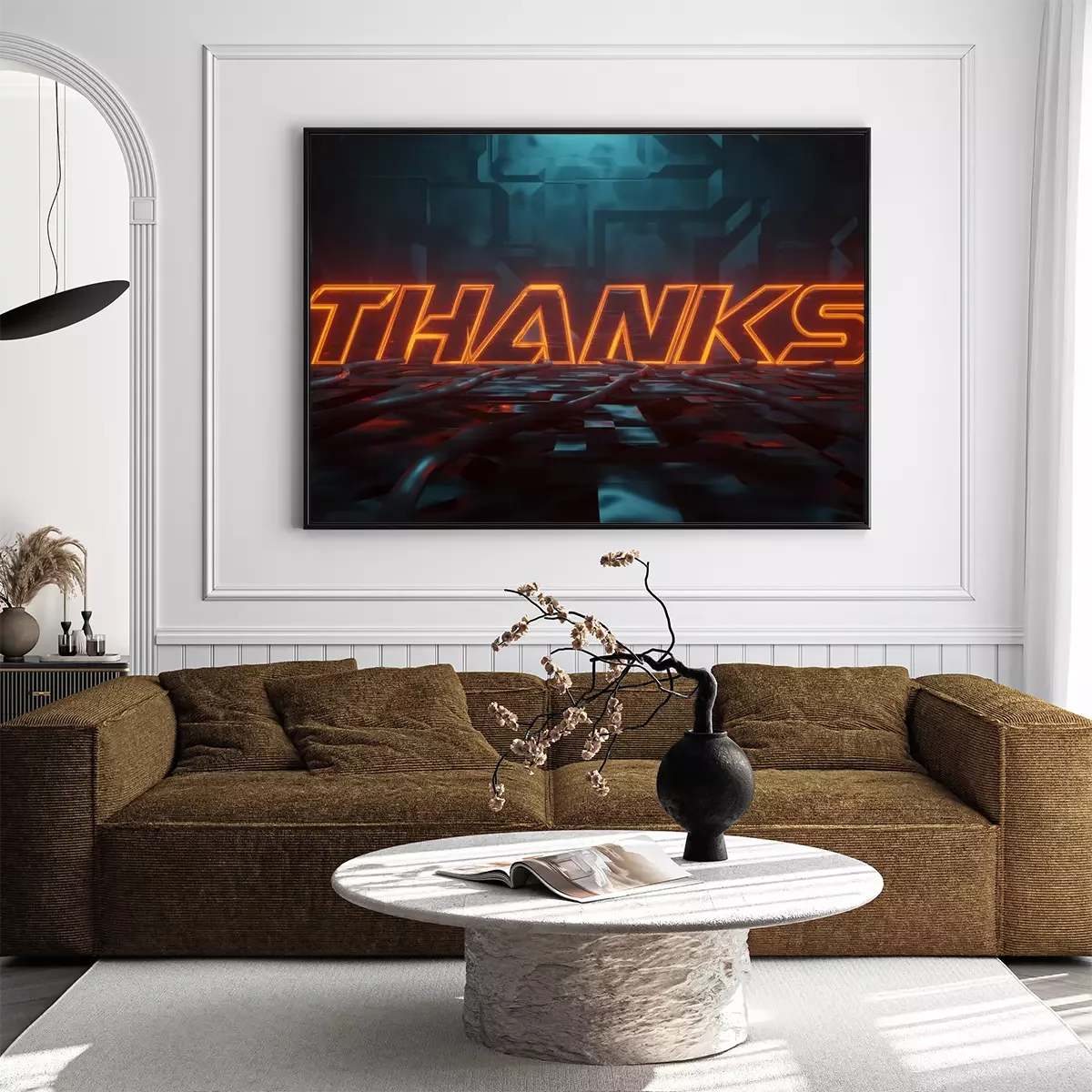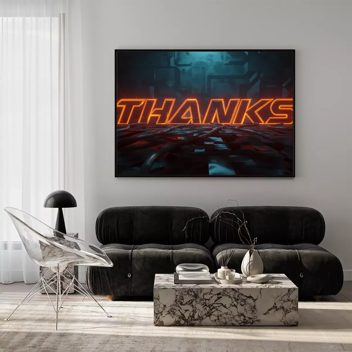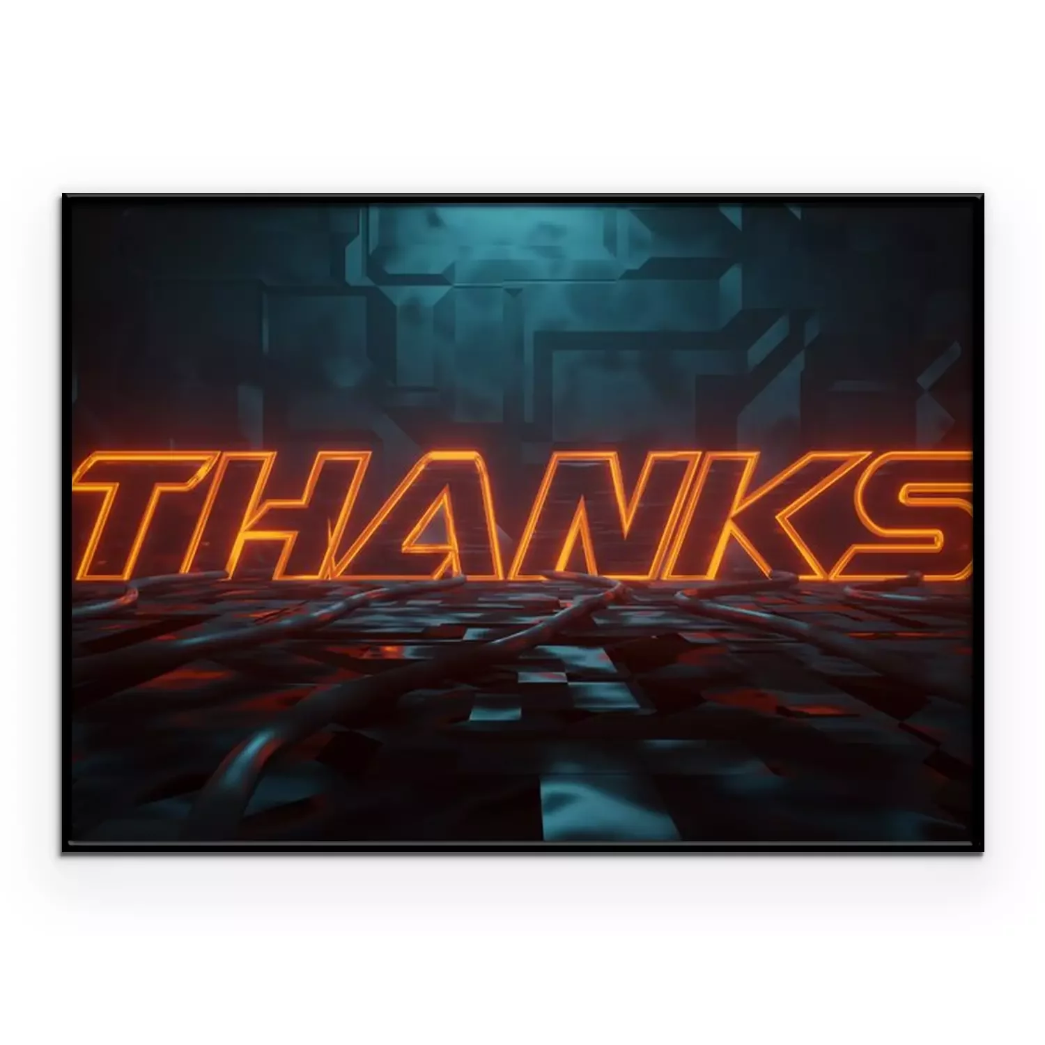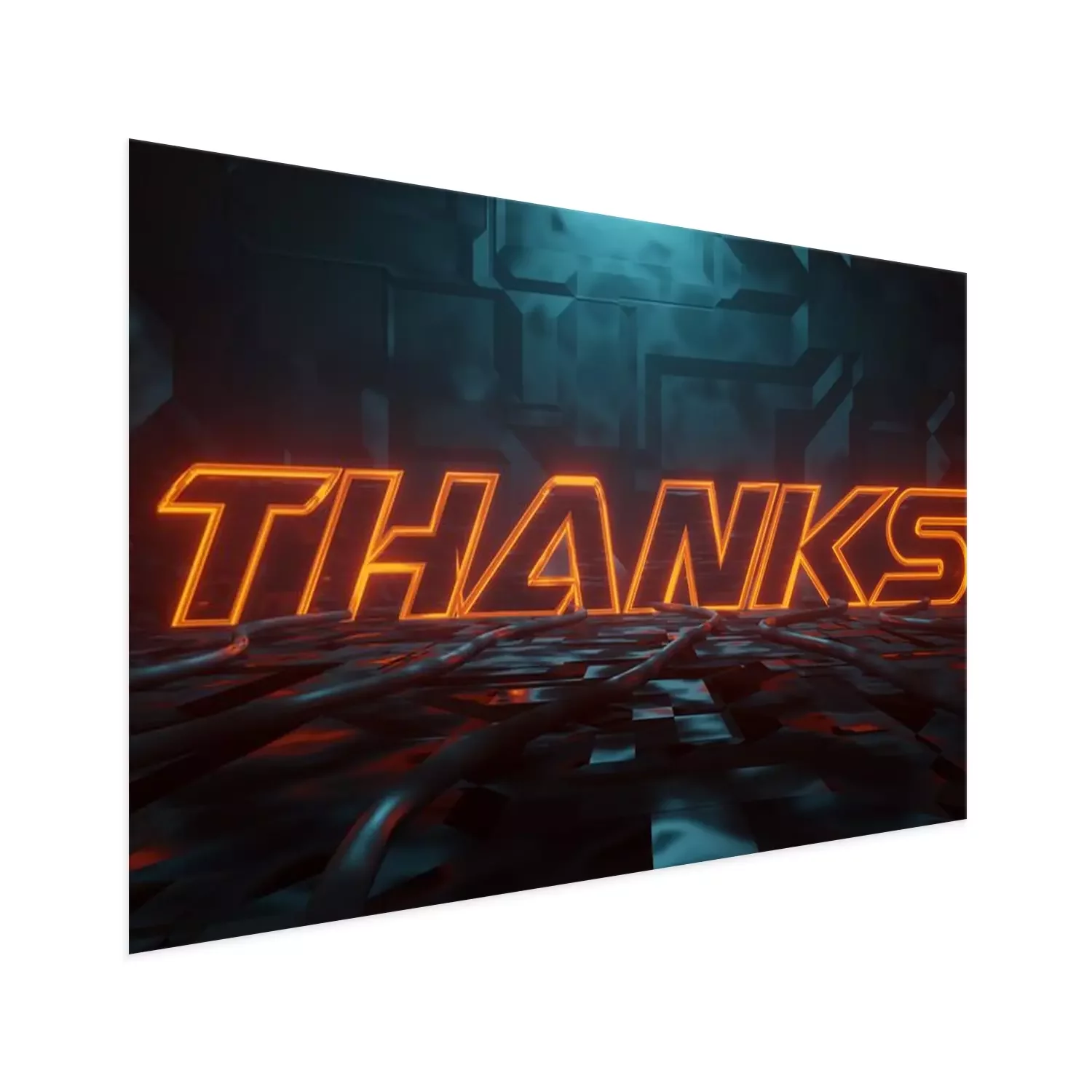 Poster 3D rendering of Cyberpunk word thanks illuminated in orange in metal background. Artificially illuminated presentation words with blue light