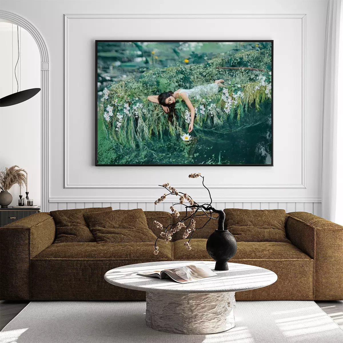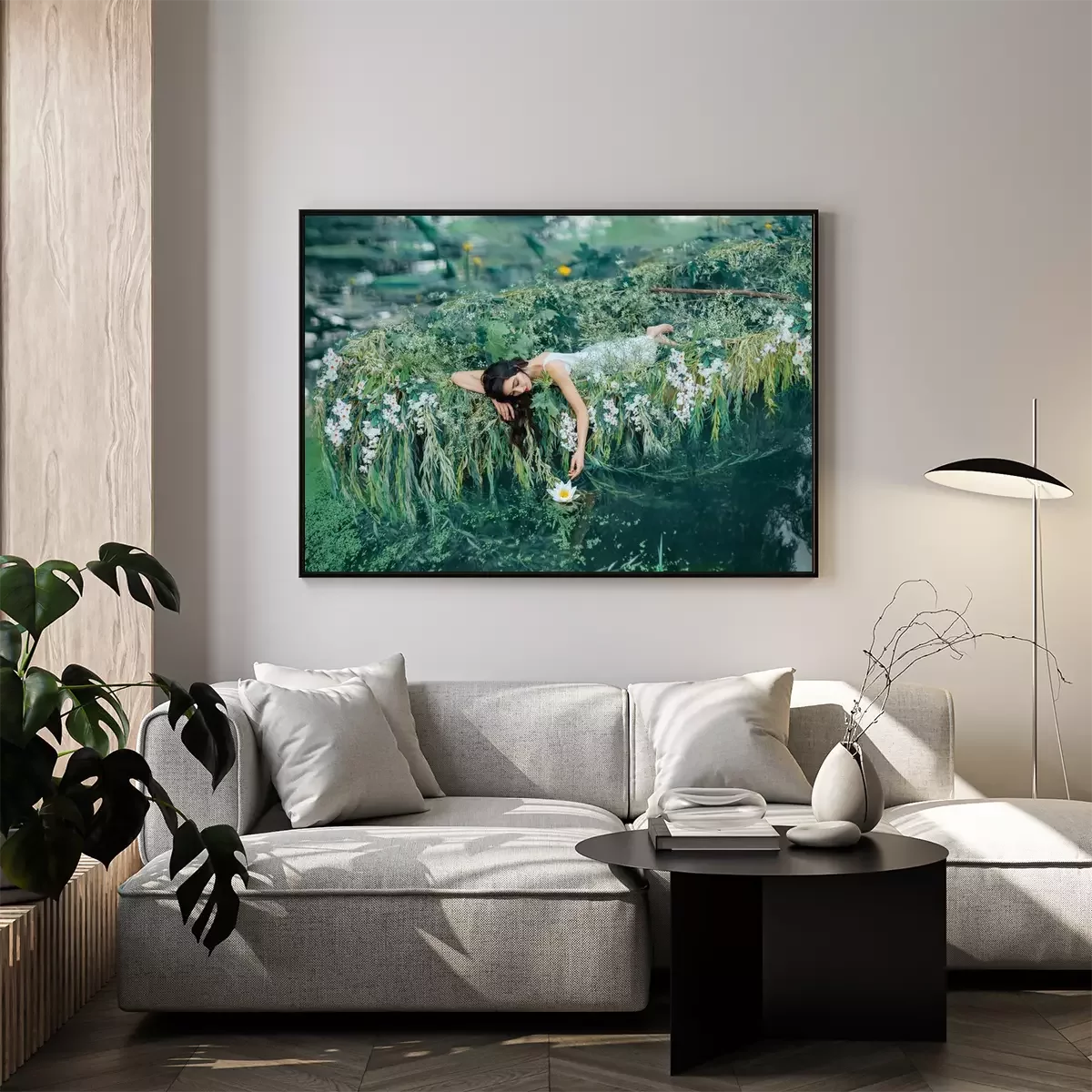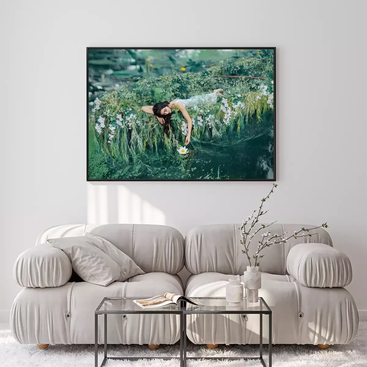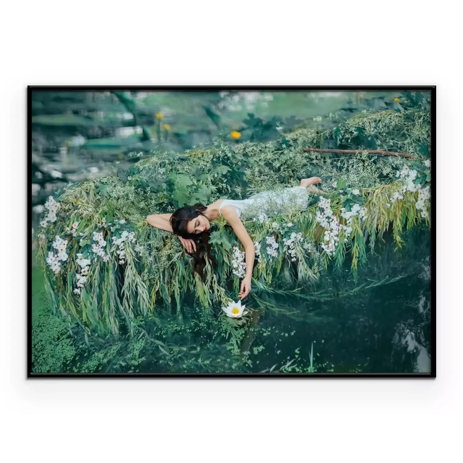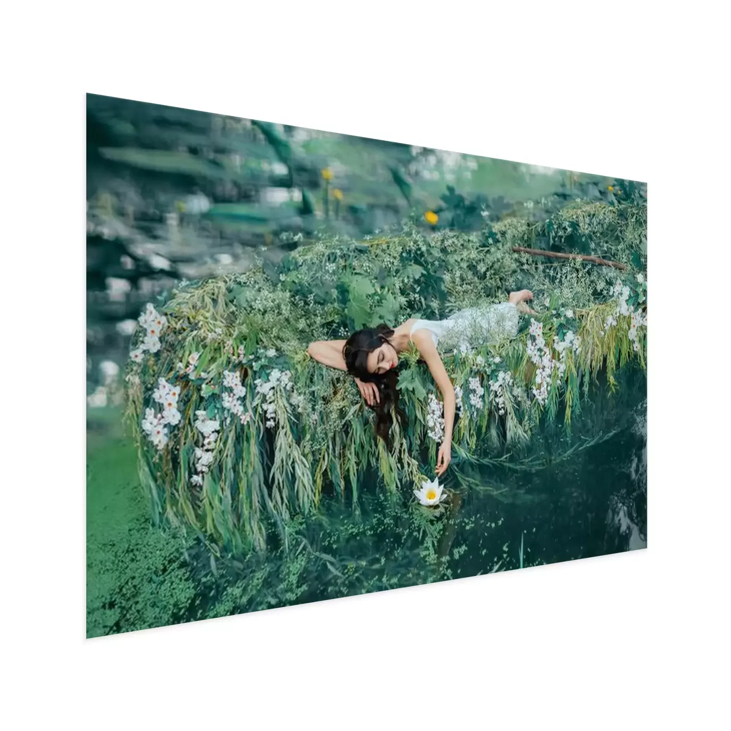 Poster A brunette woman with long hair lies in a boat and gently touches a water lily her hand. The princess in a white dress floats on the lake. Friday, relaxation and enjoyment. Creative wedding decor