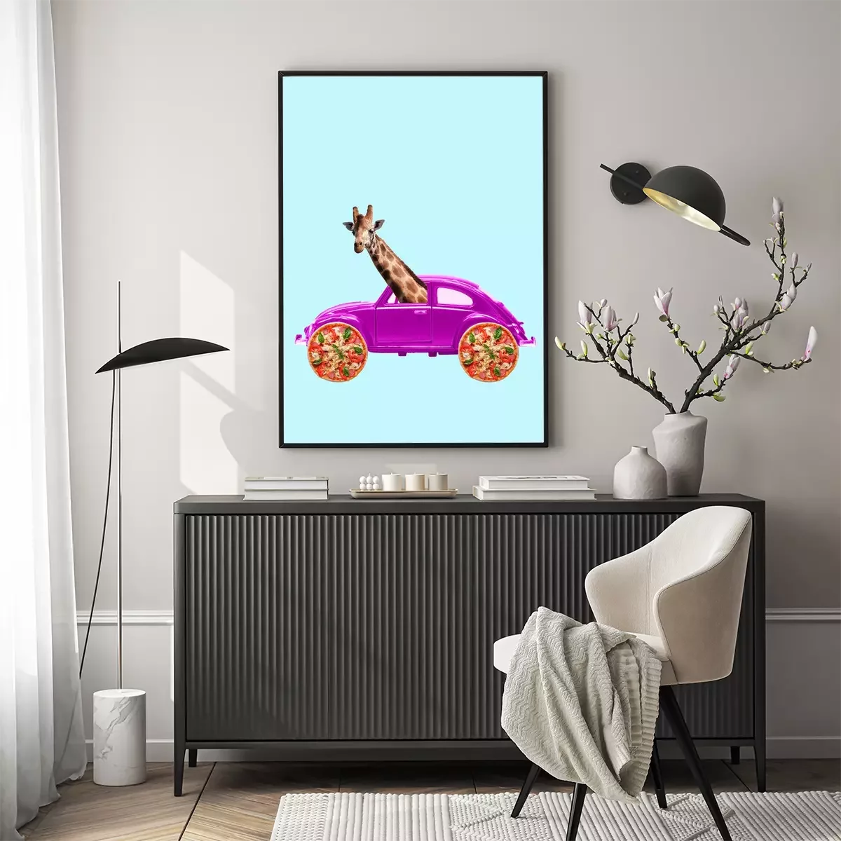 Poster: A dream about weekend. Retro pink car with wheels as a tasty pizza and giraffe's head inside. Let's have journey, enjoy your trip in holiday. Negative space. Modern design. Contemporary art collage.