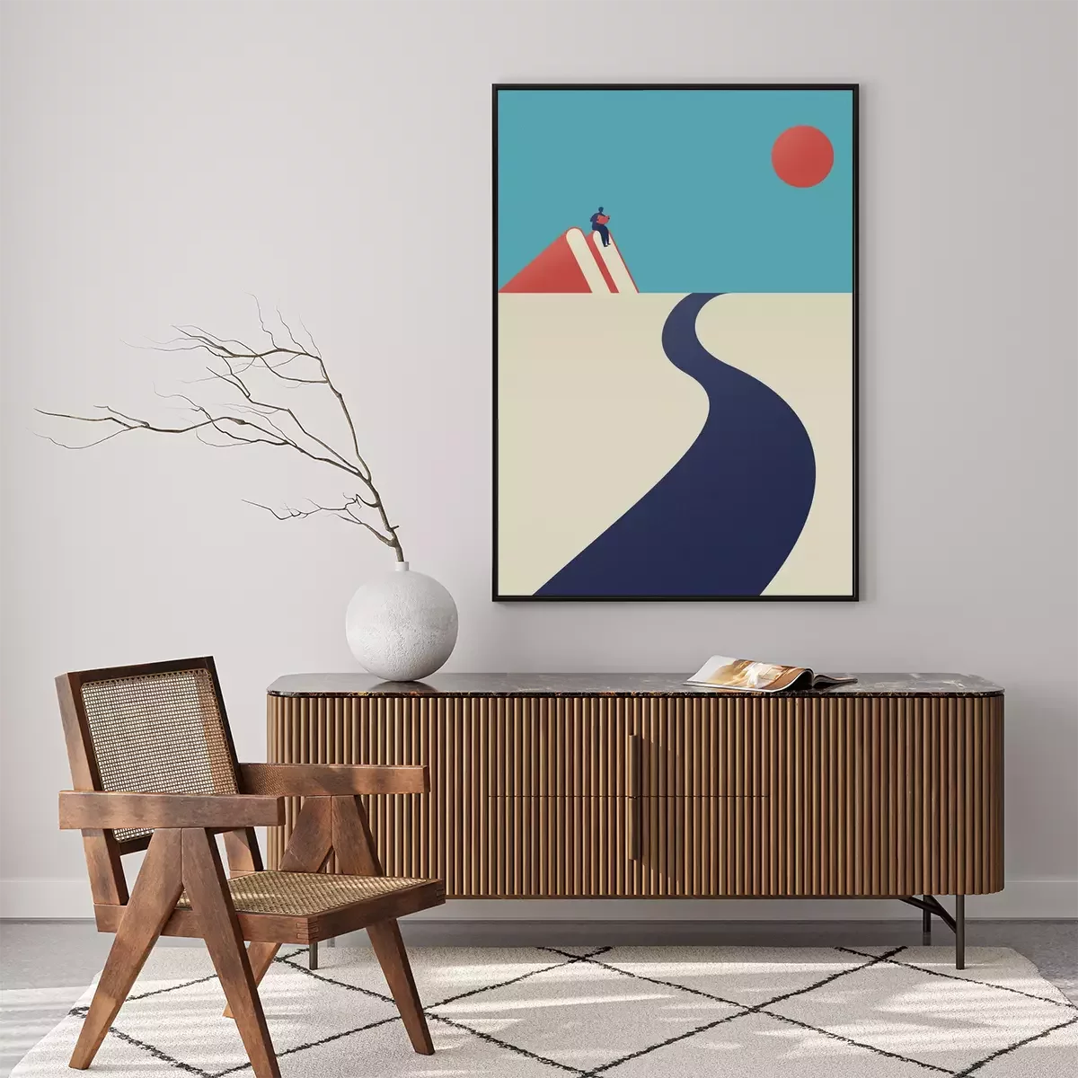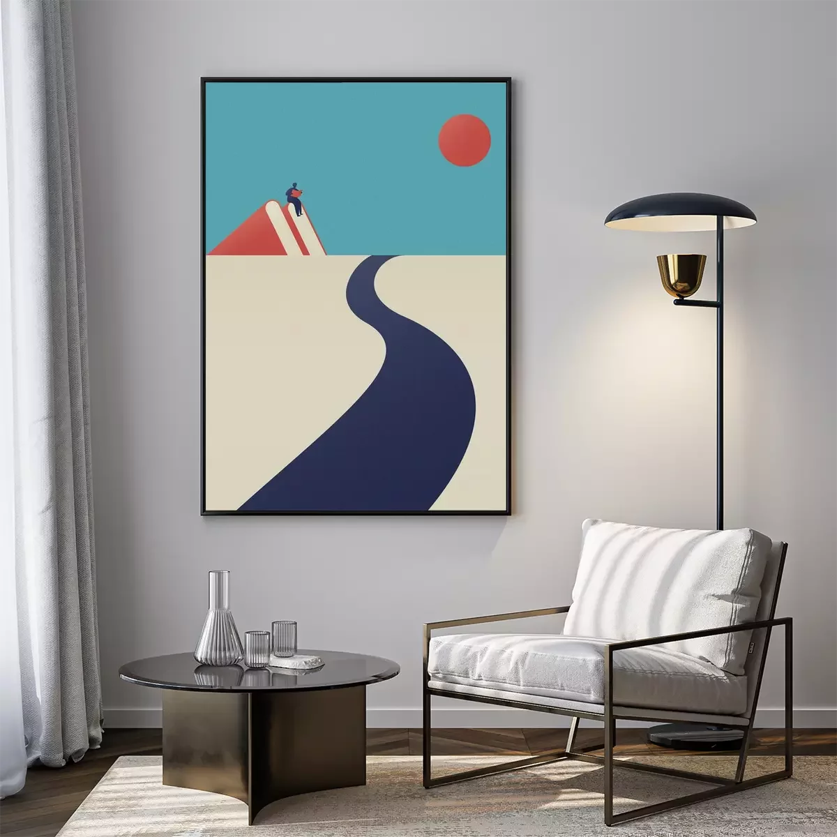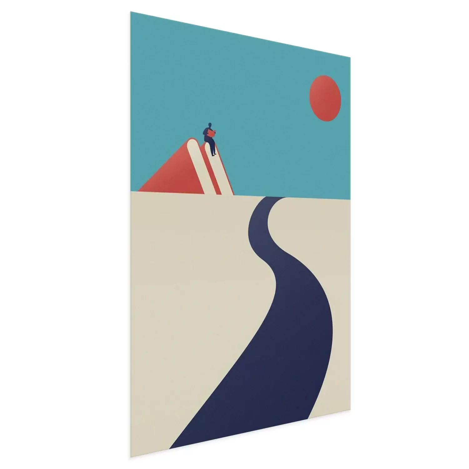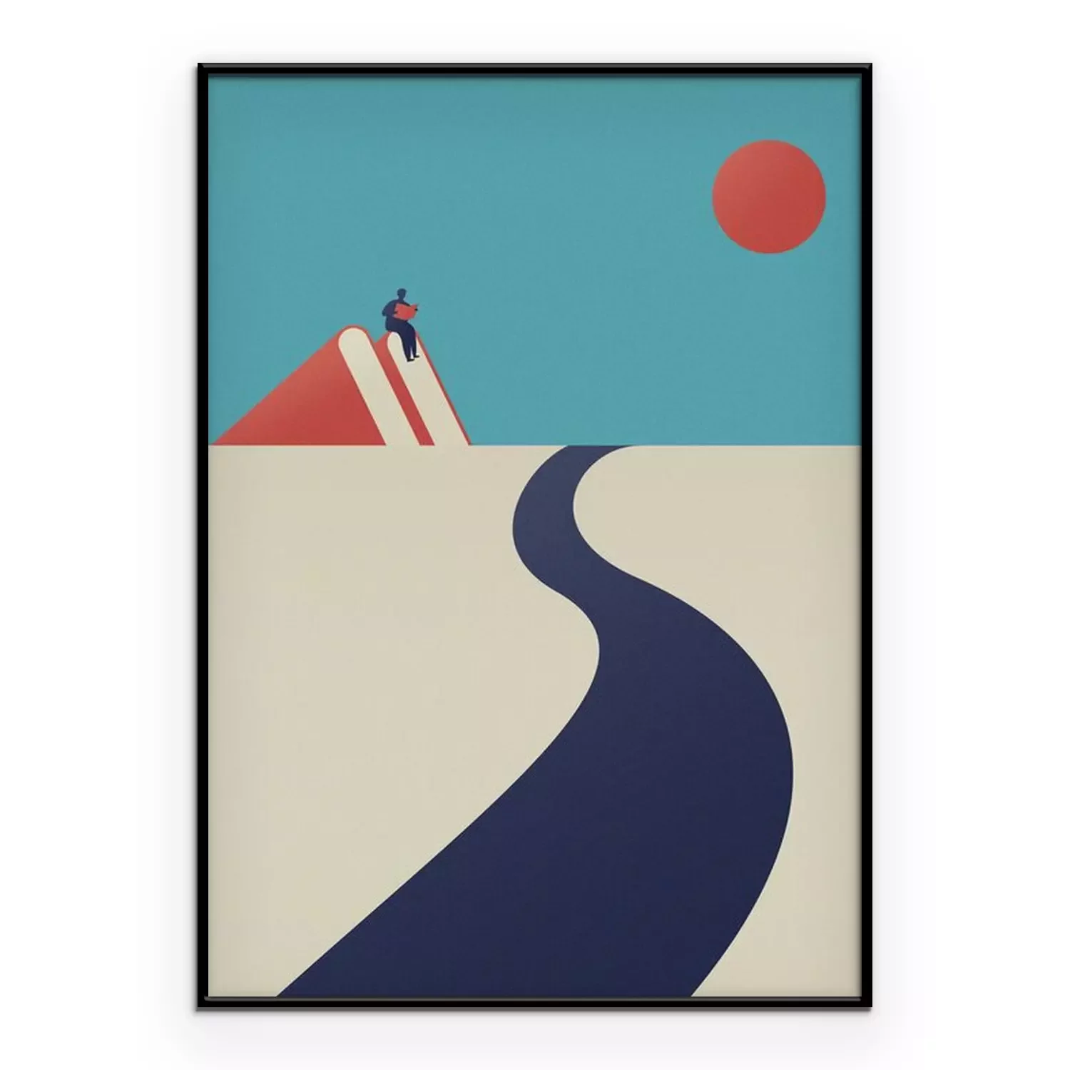 Poster a man is reading on the mountain and a road towards the sky