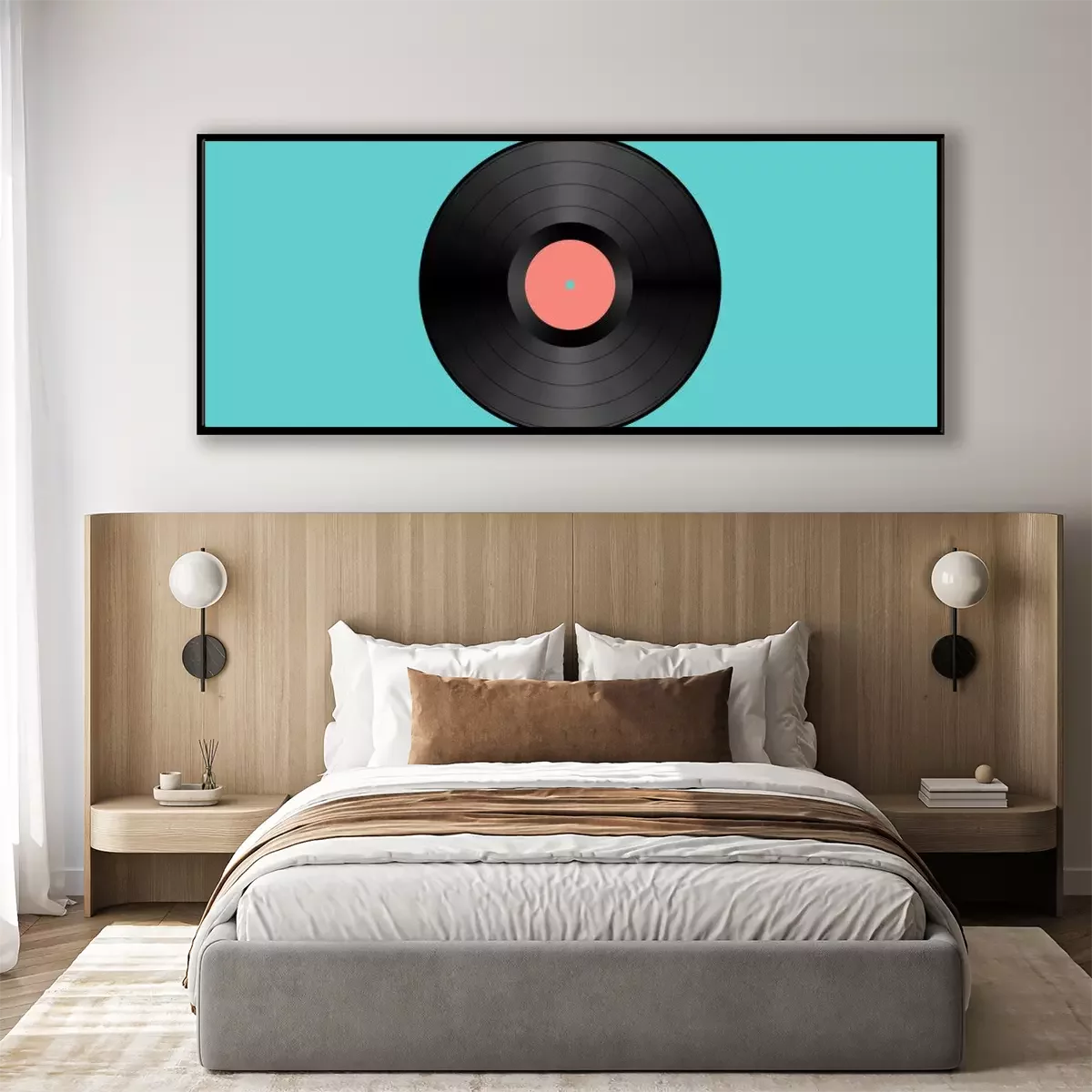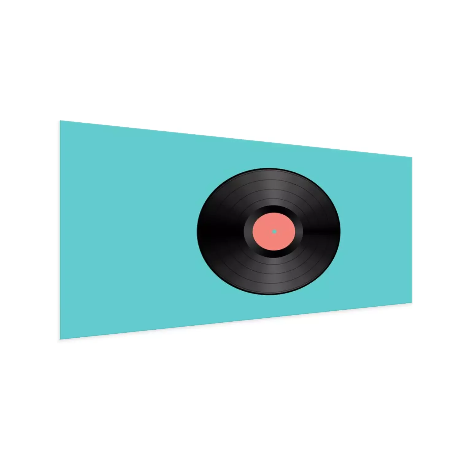 Poster A single black retro vinyl record with a coral label against a bright teal background