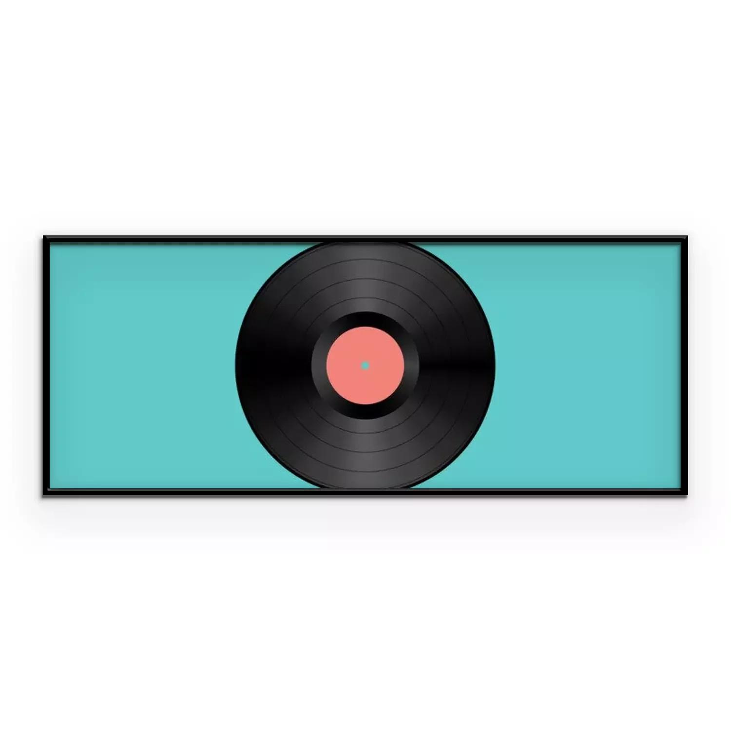 Poster: A single black retro vinyl record with a coral label against a bright teal background
