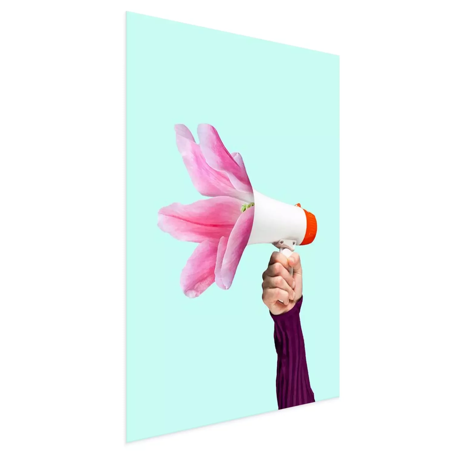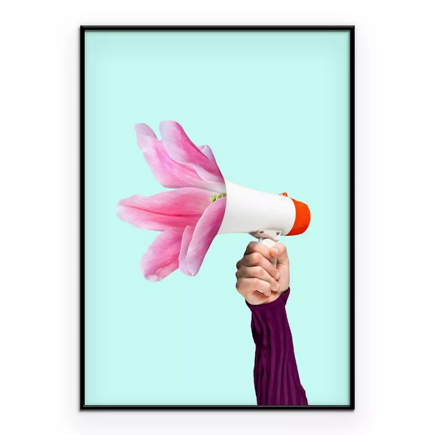 Poster: A tender reminder. Social talks may grow into useful things. Males hand holding bullhorn with blossoming light pink flower. Negative space to insert your text. Modern design. Contemporary art collage.