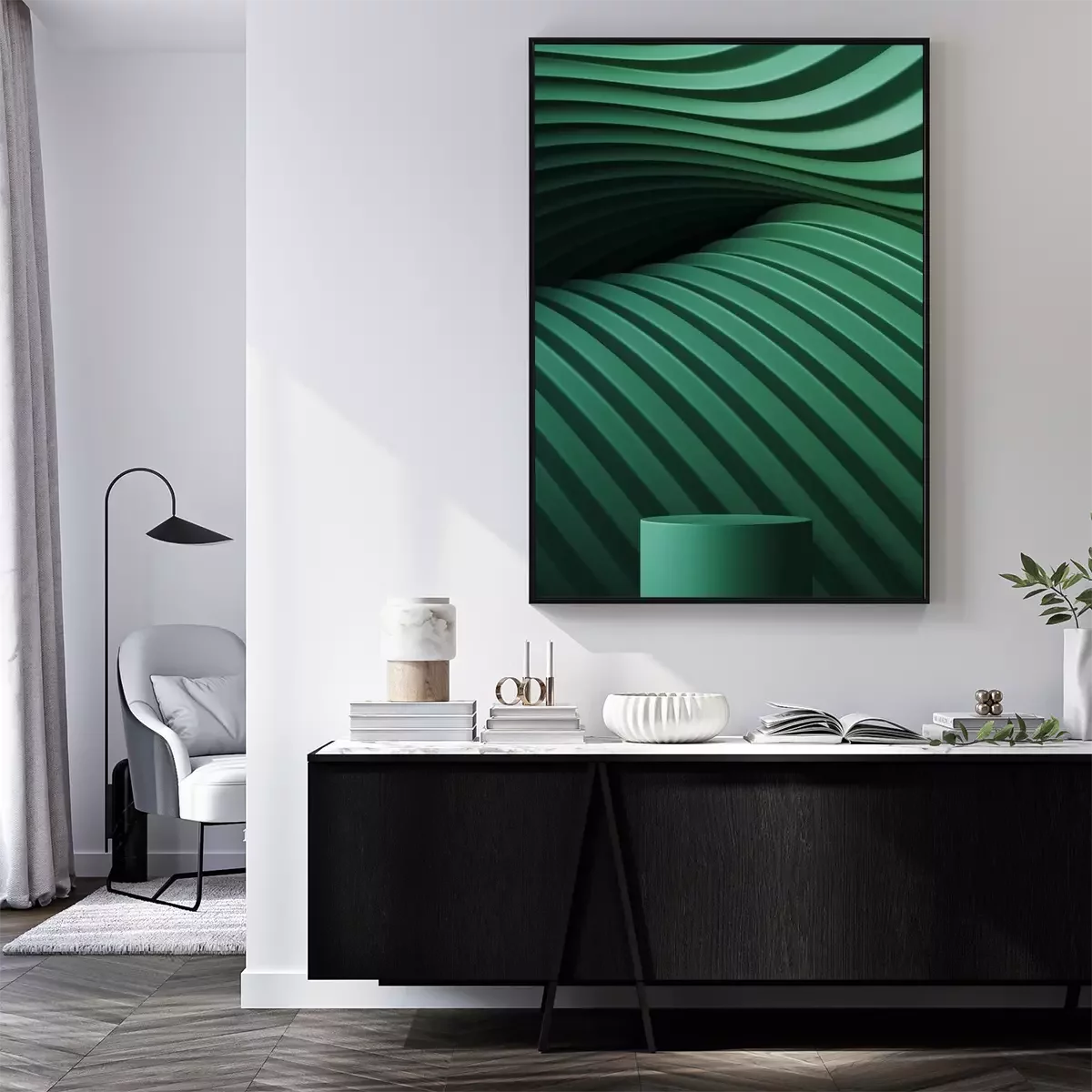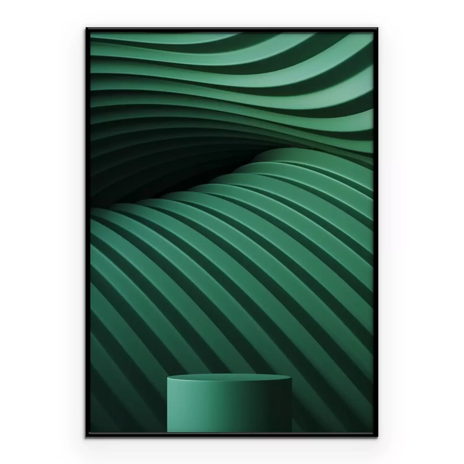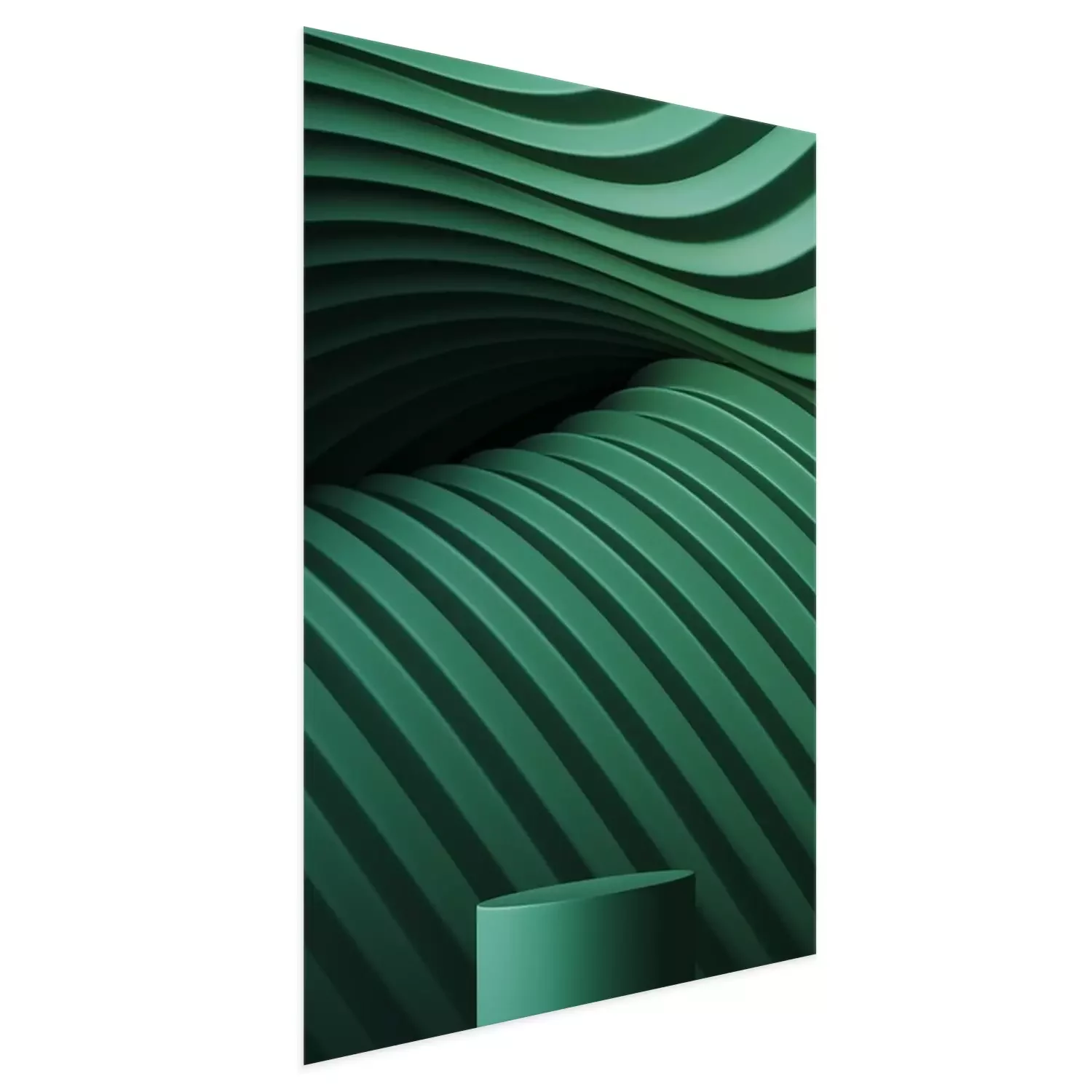Poster: Abstract background for branding and minimal presentation. Green podium on folding paper pleated geometric background. 3d rendering illustration.