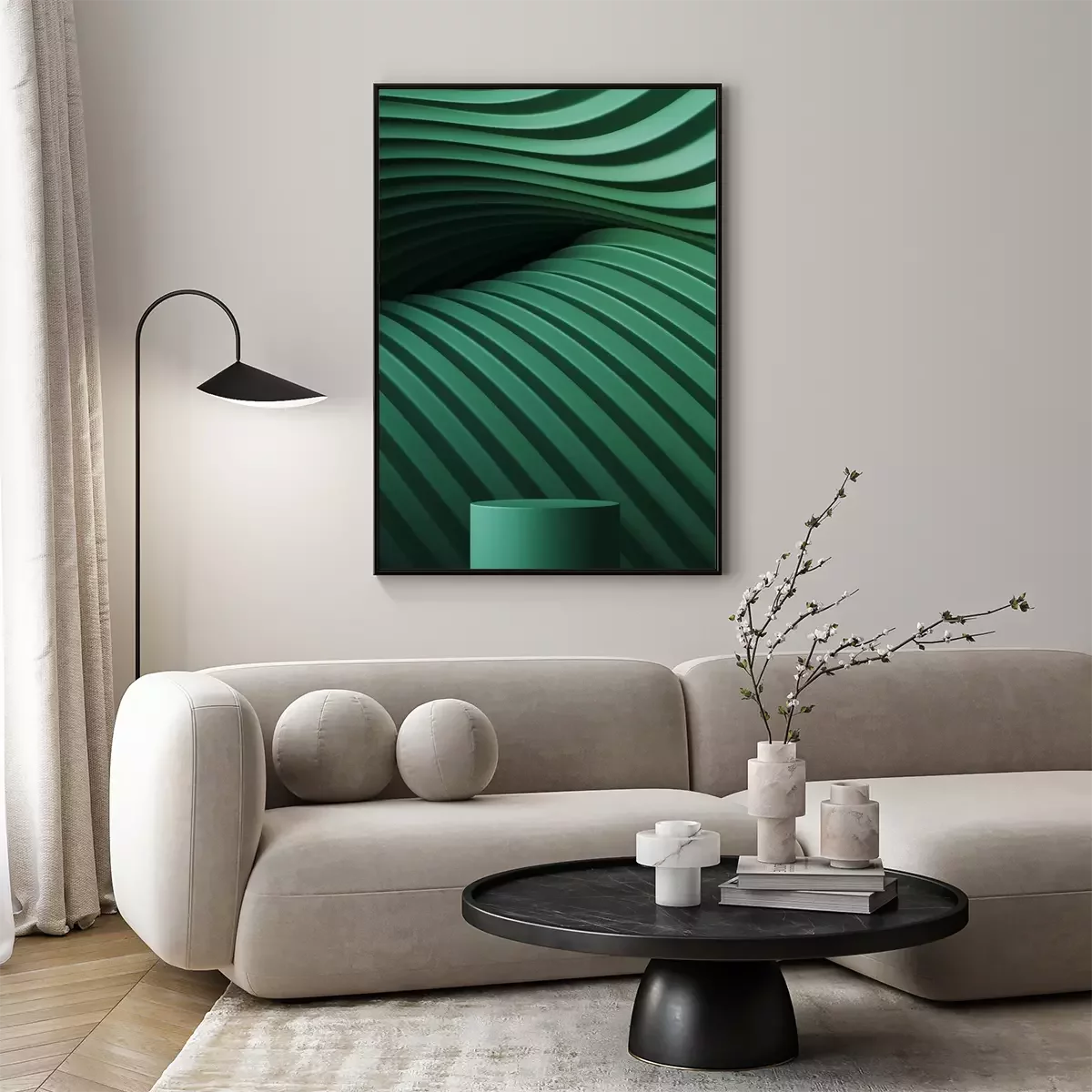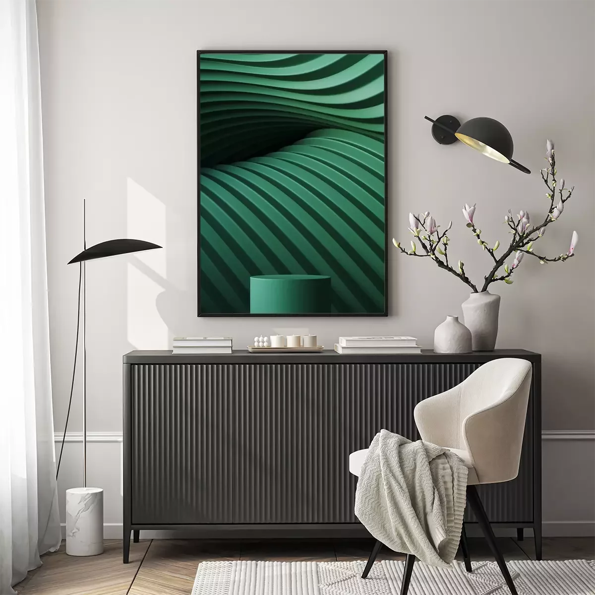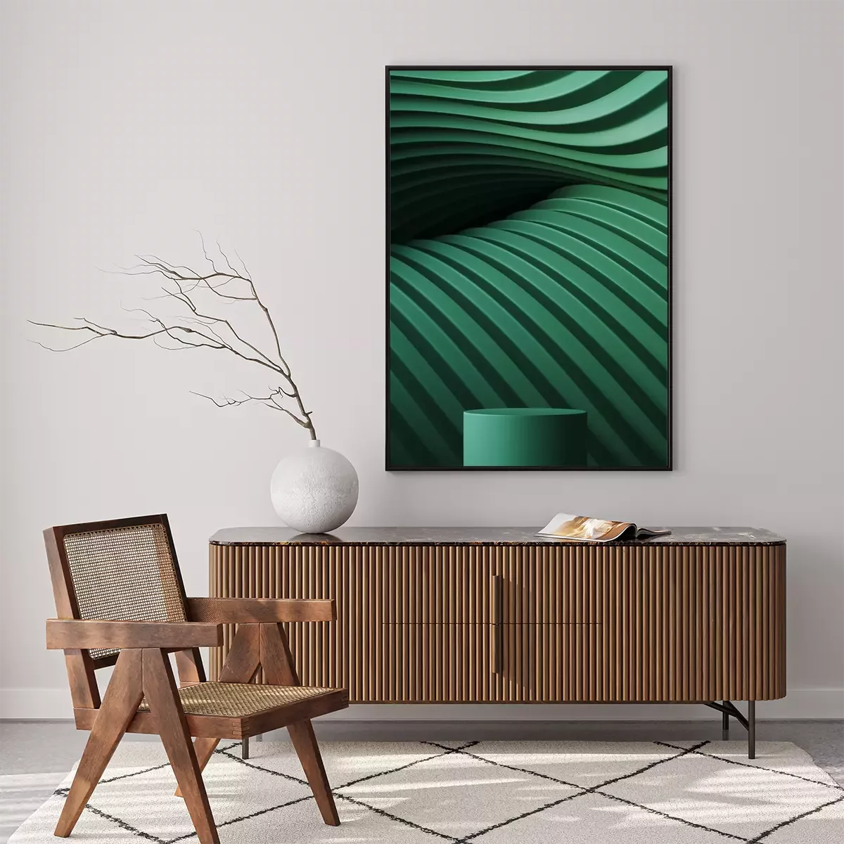 Poster: Abstract background for branding and minimal presentation. Green podium on folding paper pleated geometric background. 3d rendering illustration.