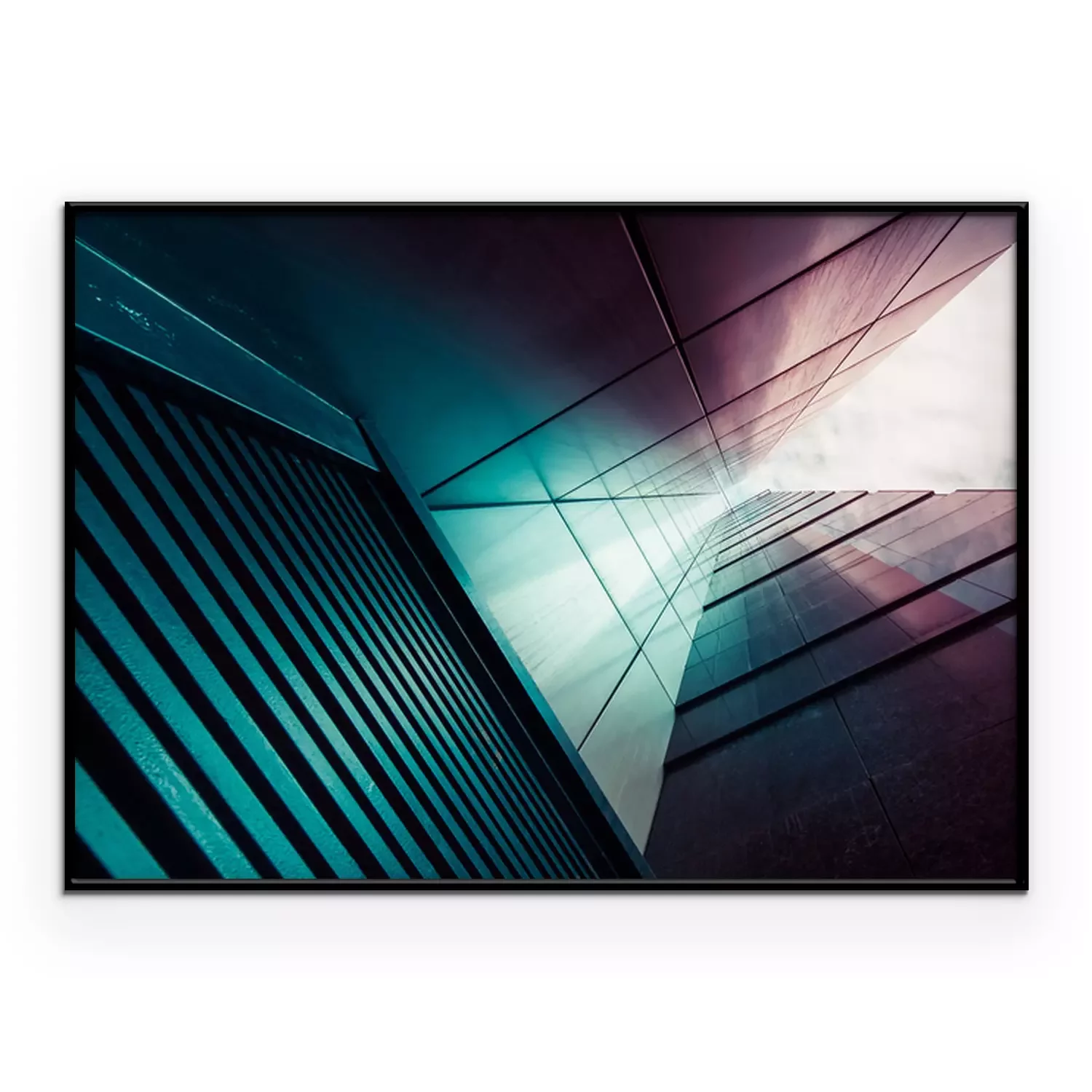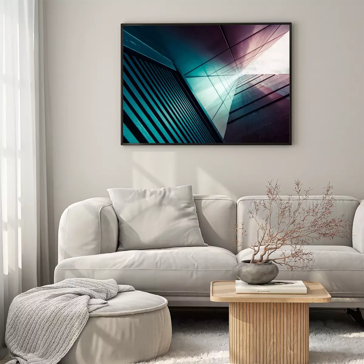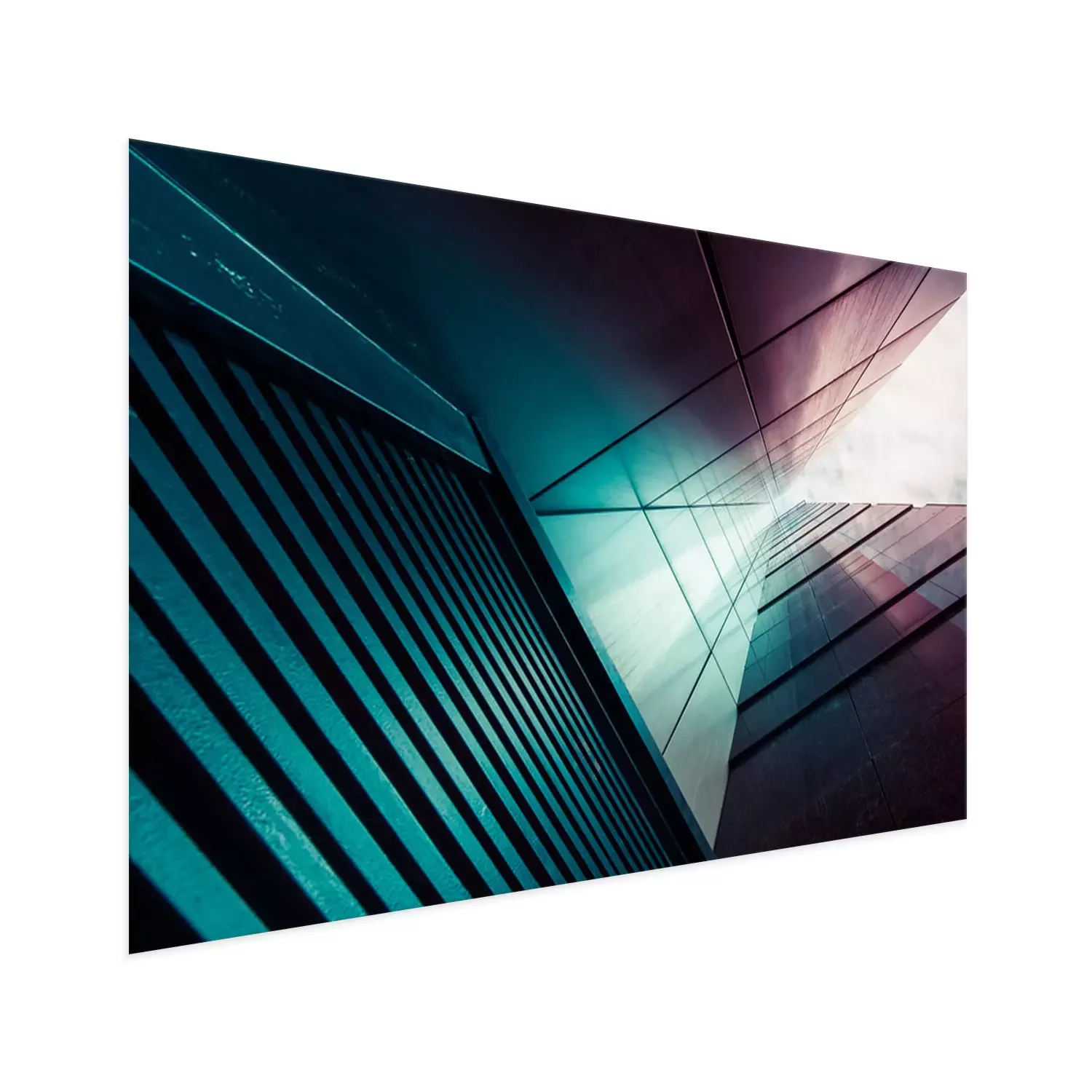 Poster: Abstract background. View through modern high rising skyscraper chimney upwards to blue sky with white clouds - abstract architecture detail background in turquoise teal blue to burgundy purple colors