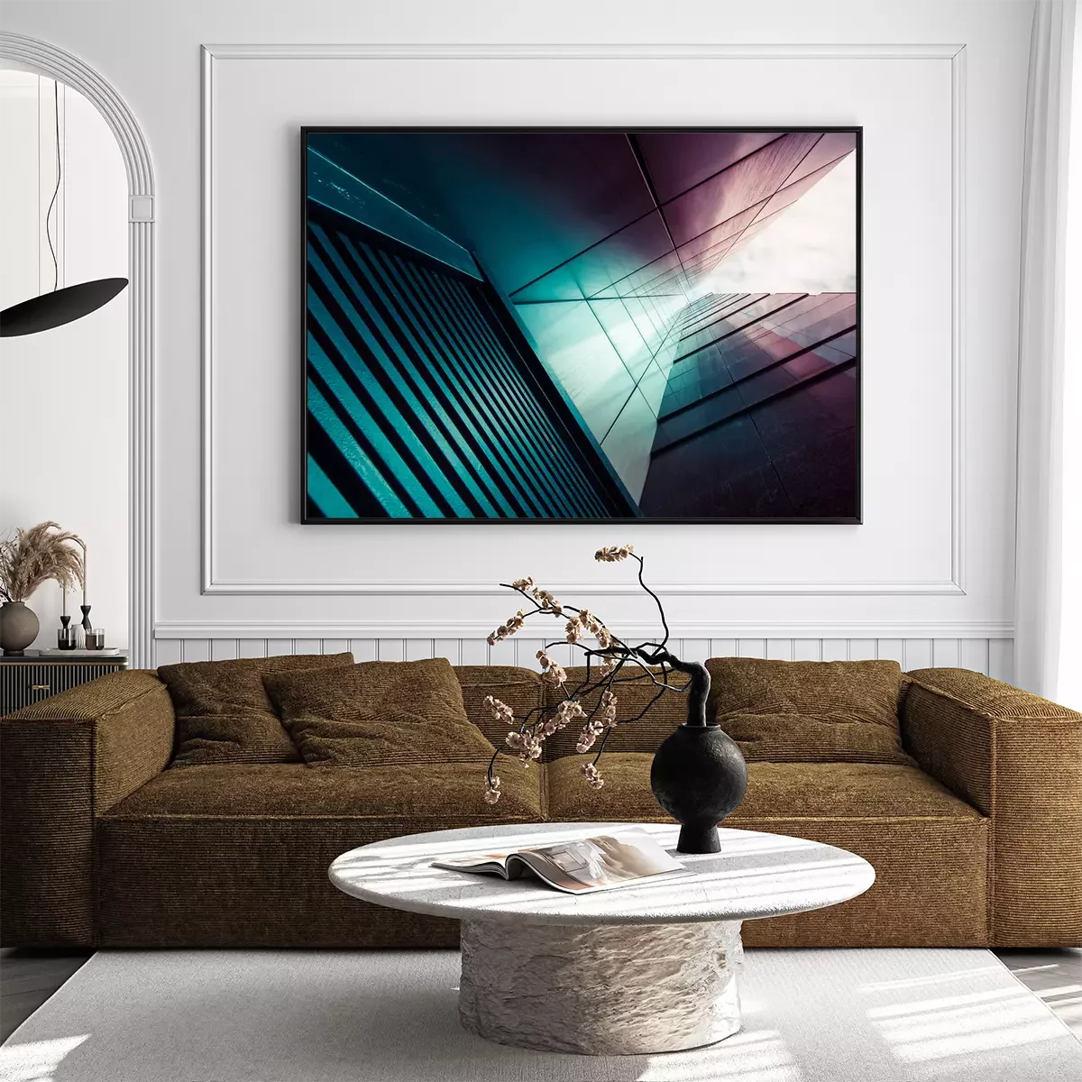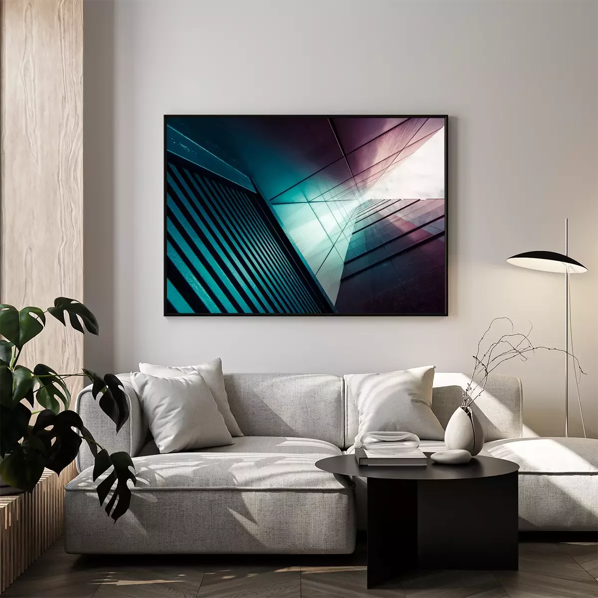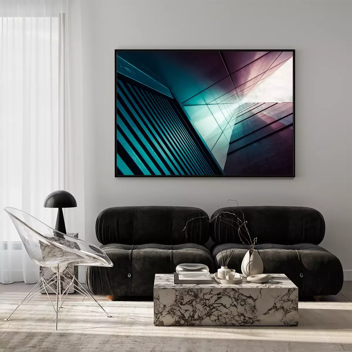 Poster: Abstract background. View through modern high rising skyscraper chimney upwards to blue sky with white clouds - abstract architecture detail background in turquoise teal blue to burgundy purple colors