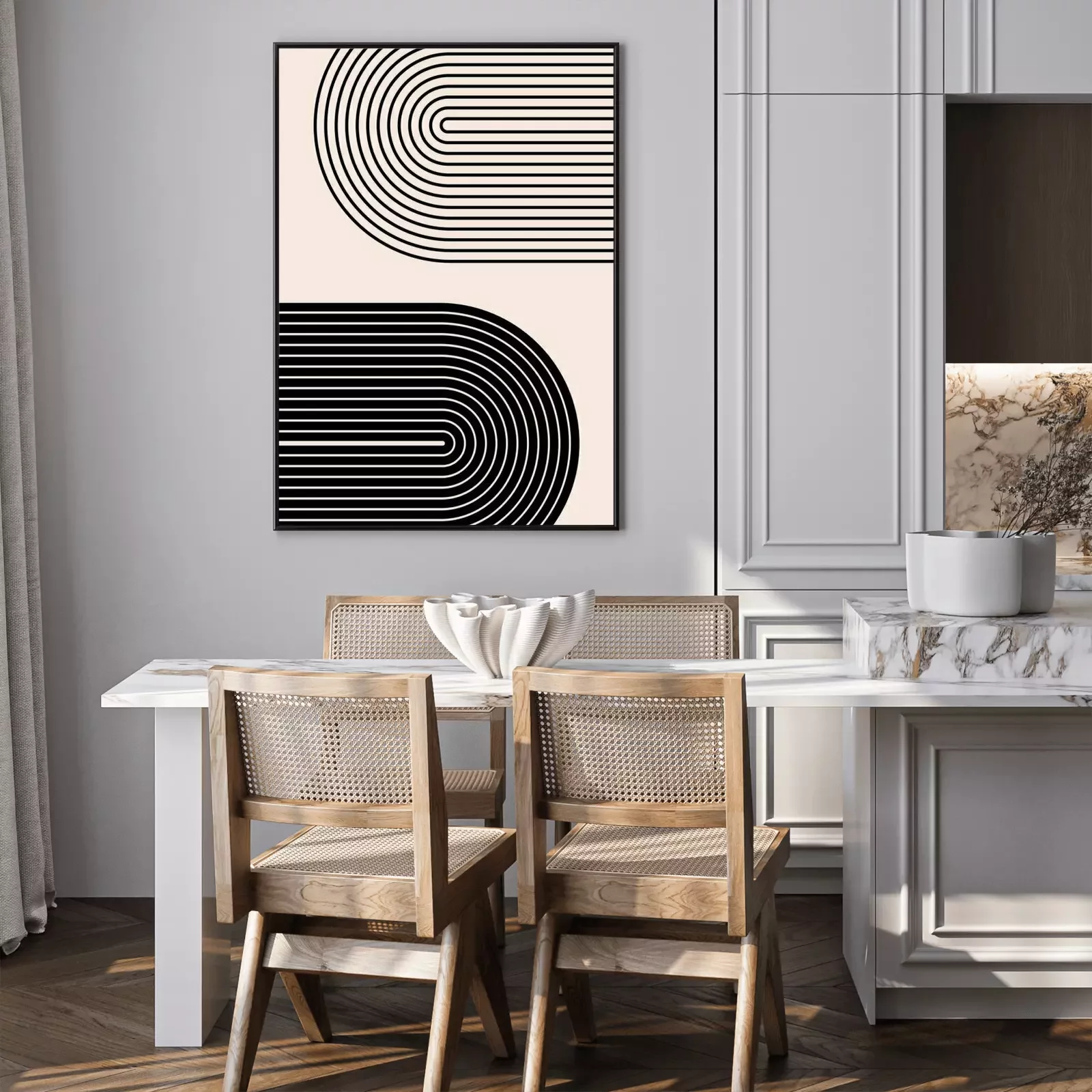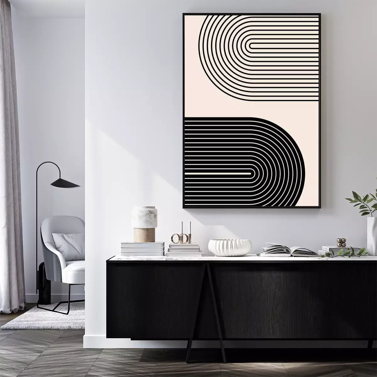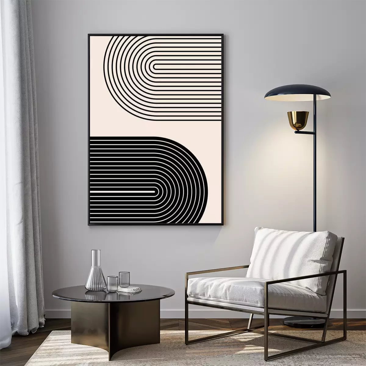 Poster: Abstract contemporary aesthetic background with geometric balance shapes, rainbow gates. Boho wall decor. Mid century modern minimalist print. Neutral Geometric art. Organic shape.