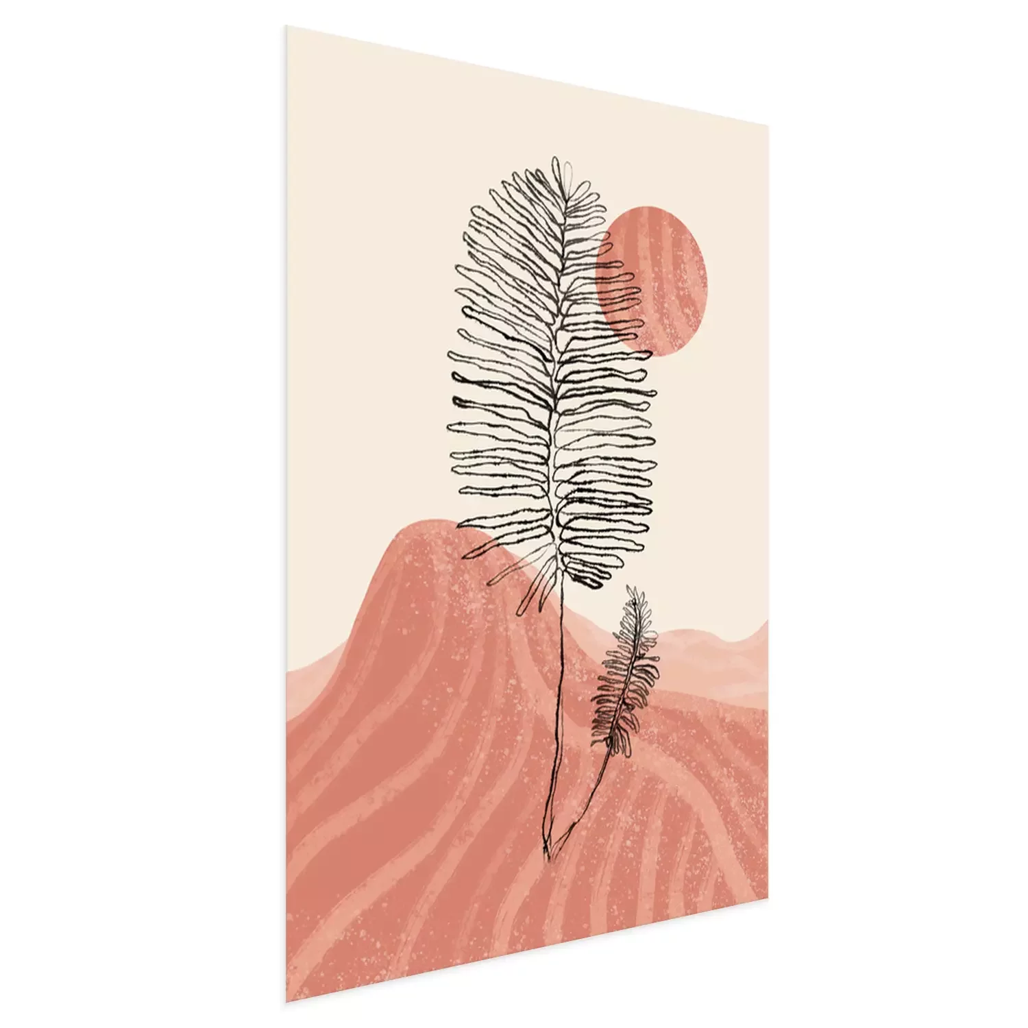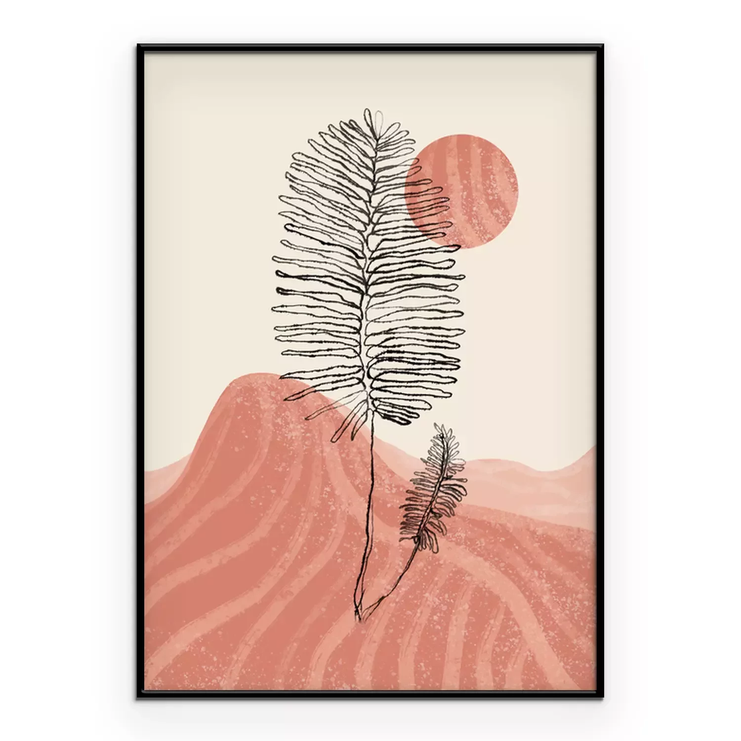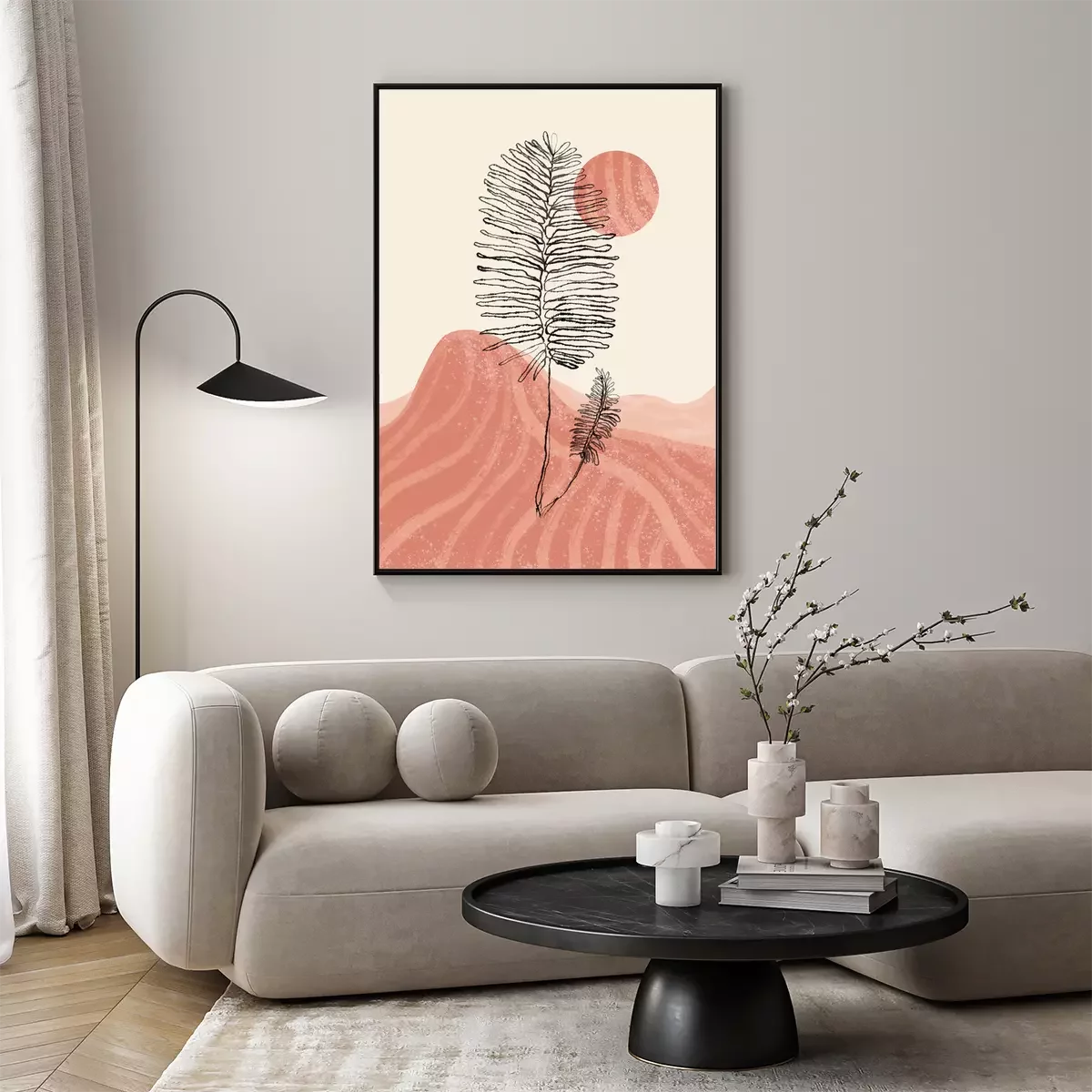 Poster: Abstract contemporary aesthetic background with mountains and sun. One line plant on boho background. Boho wall decor. Mid century modern minimalist print. Neutral Geometric art. Organic shape.