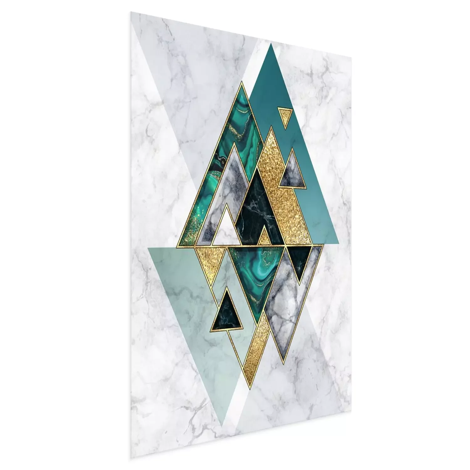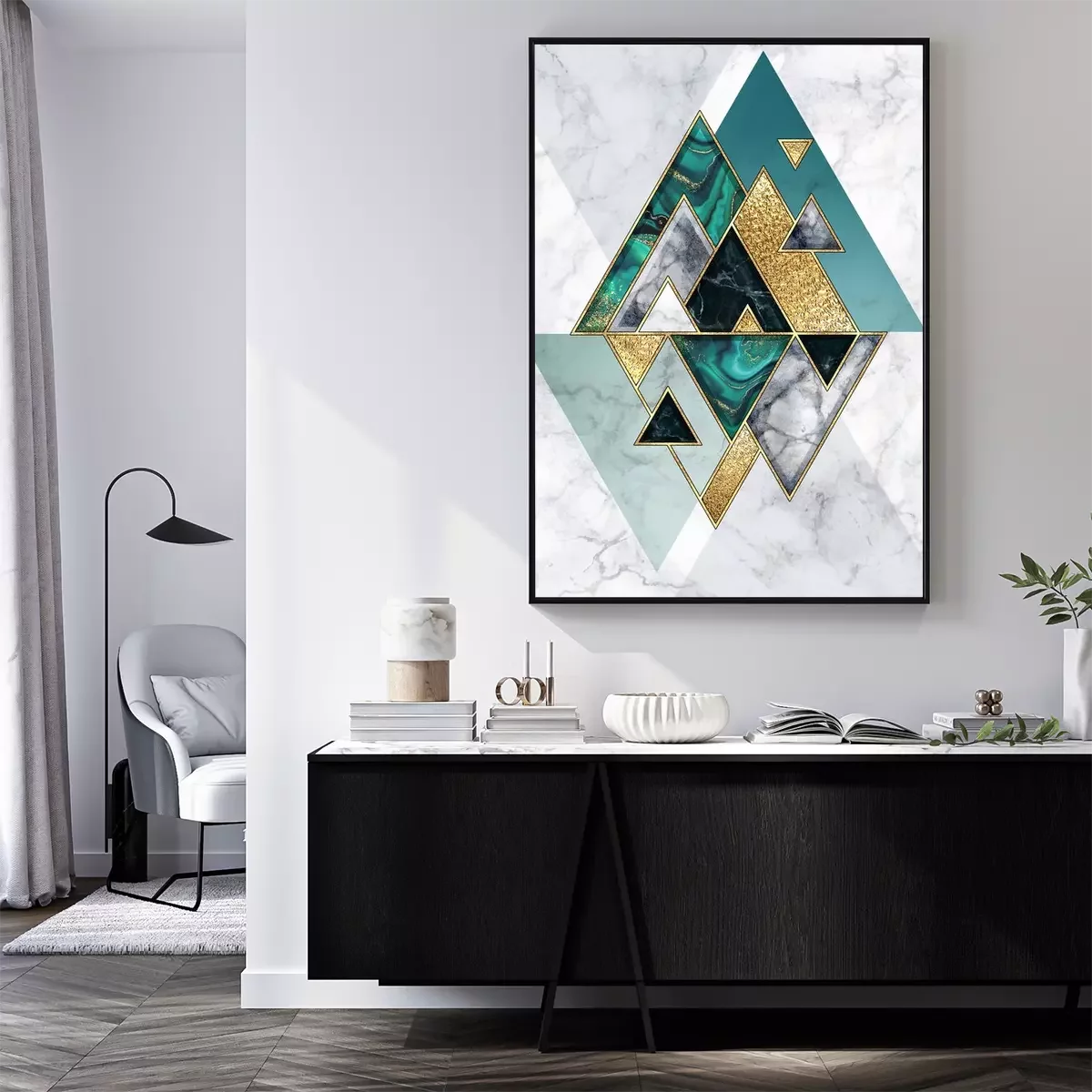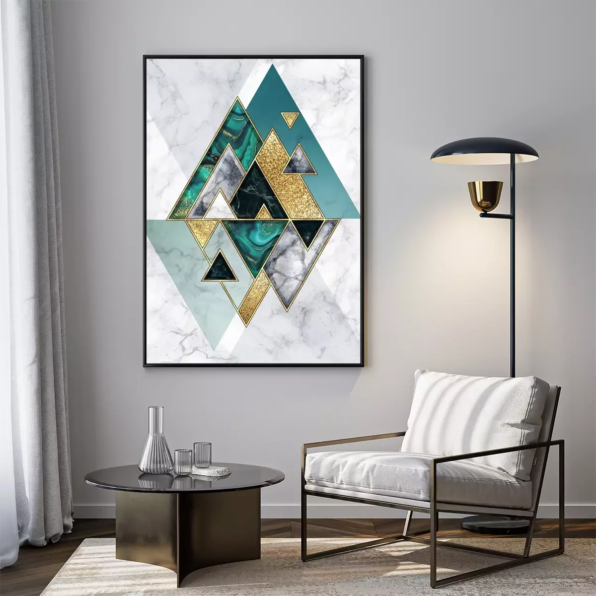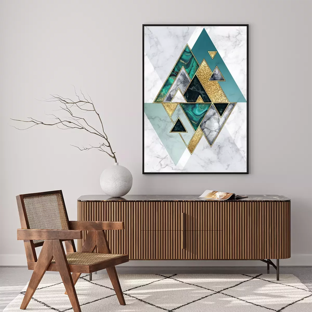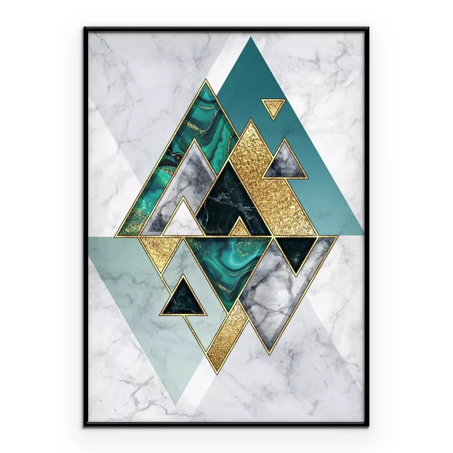 Poster: abstract geometric background, modern marble mosaic inlay, malachite green triangles, black white stone textures, golden foil. Fashion marbling illustration, art deco wallpaper