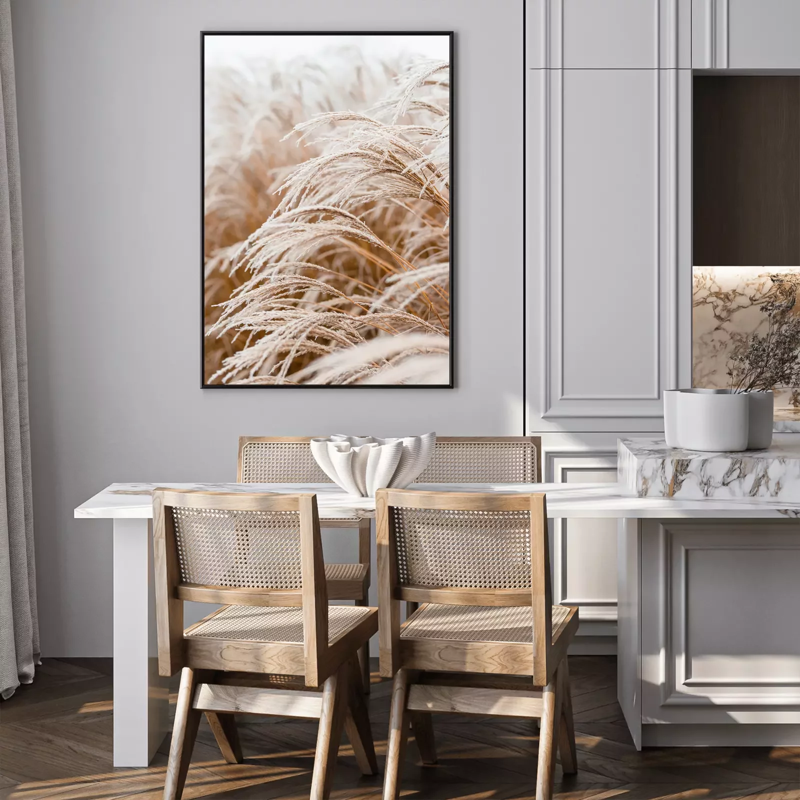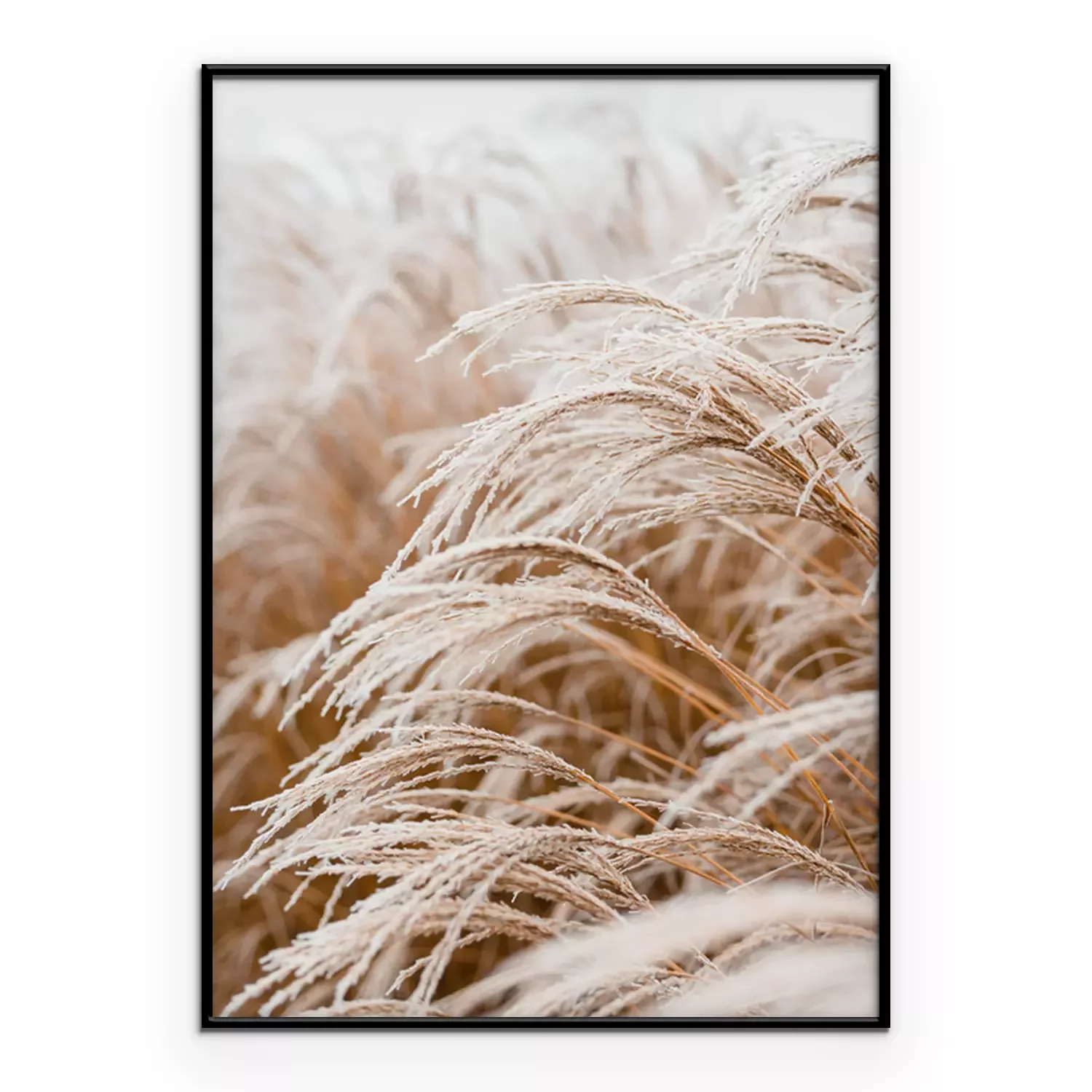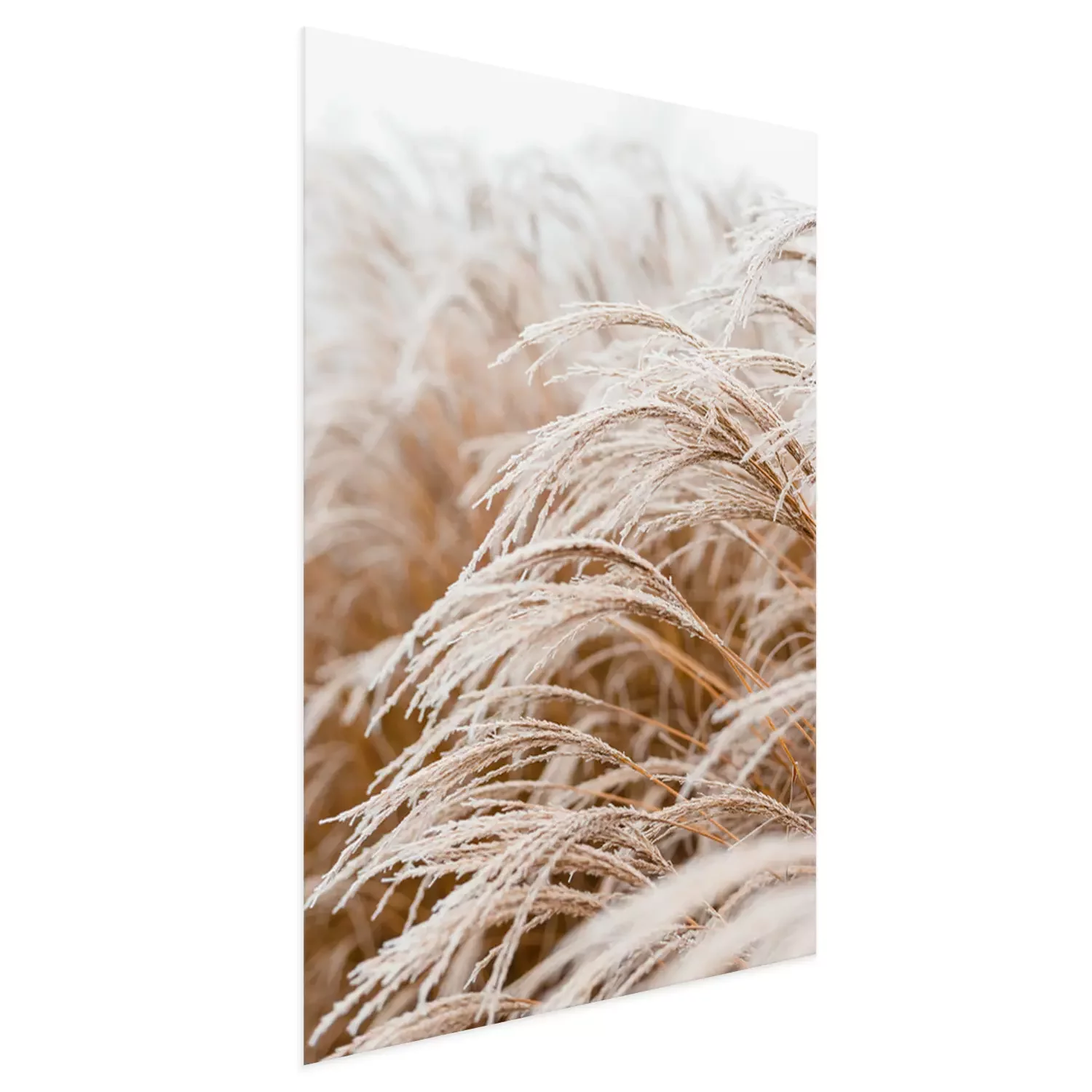 Poster: Abstract natural background of soft plants Cortaderia selloana. Frosted pampas grass on a blurry bokeh, Dry reeds boho style. Patterns on the first ice. Earth watching