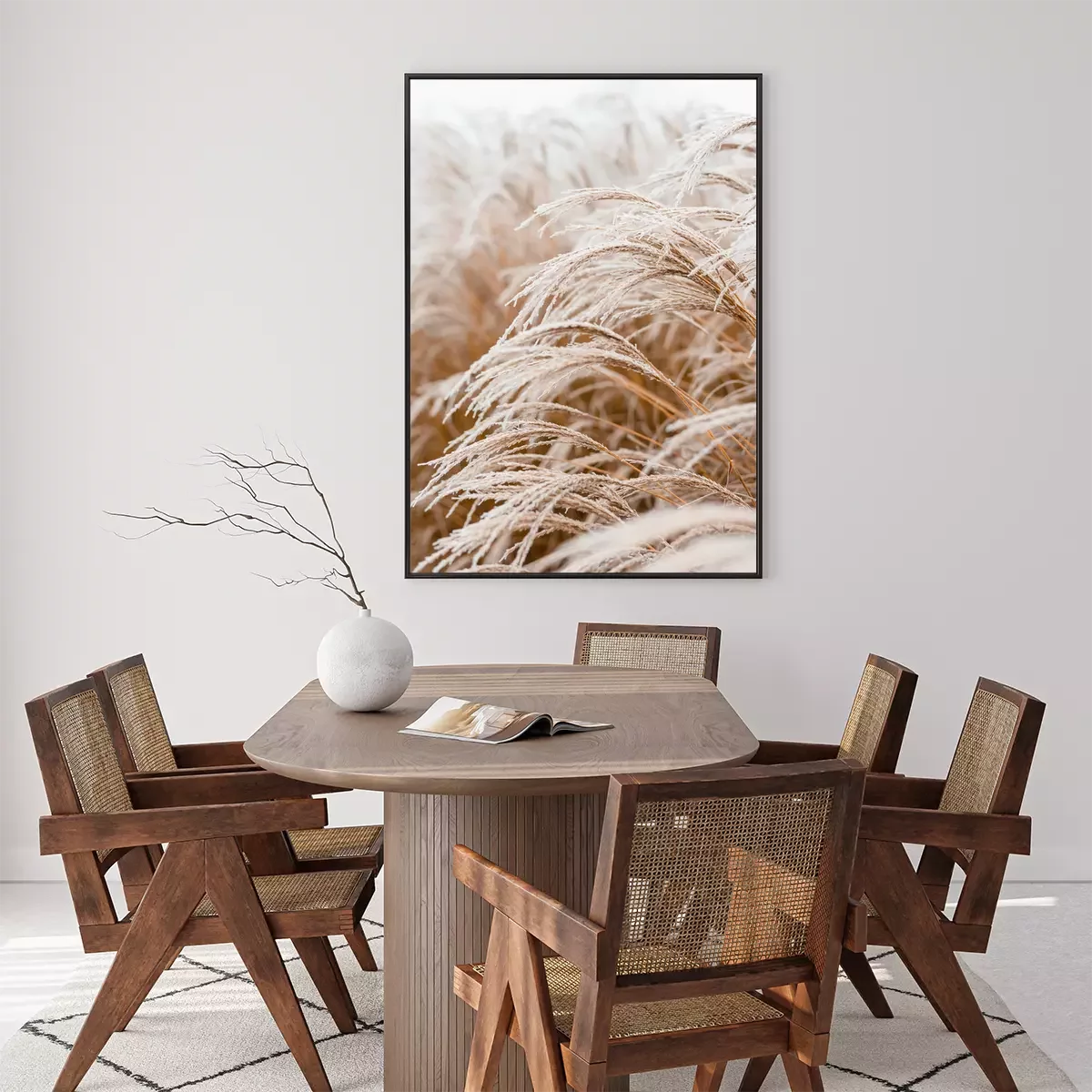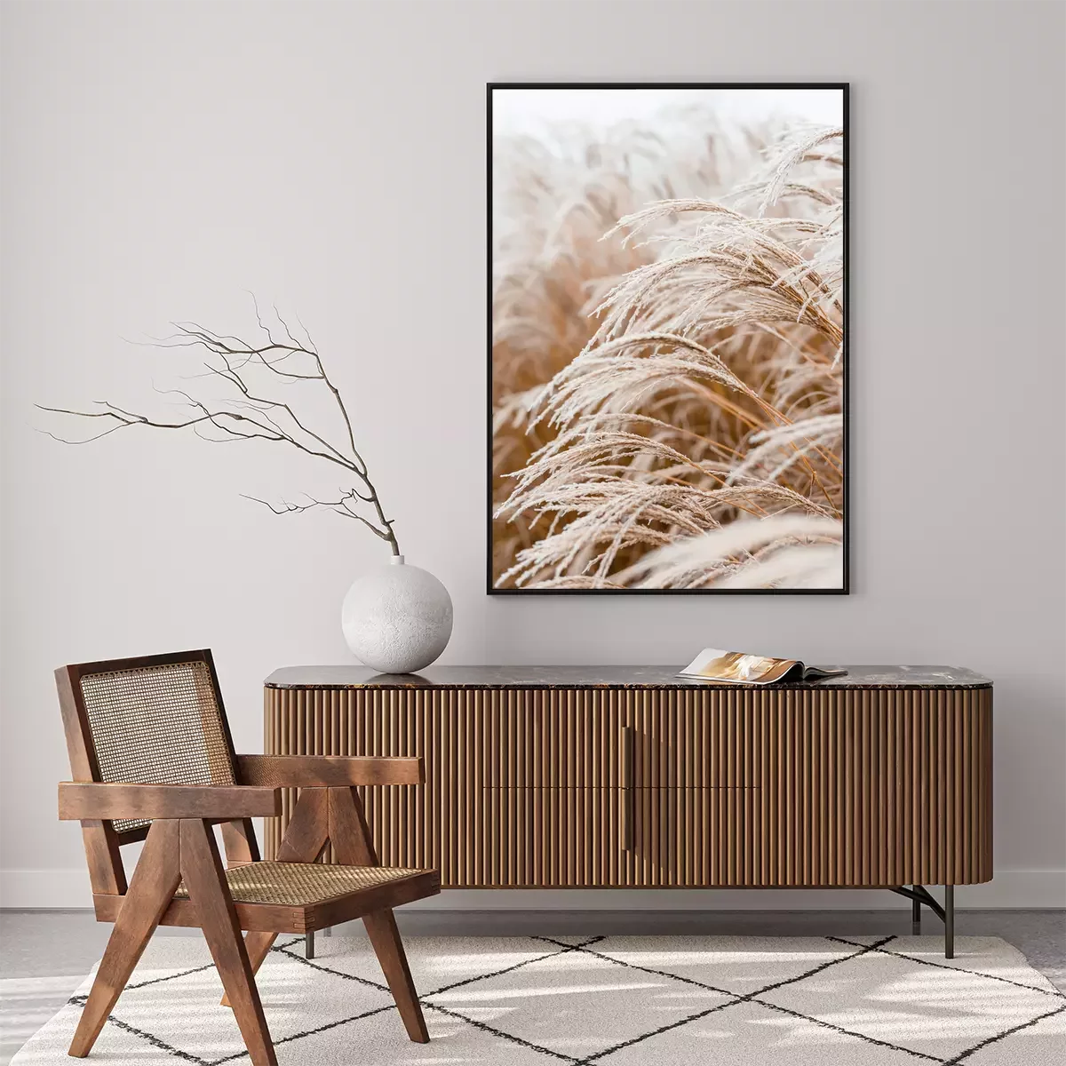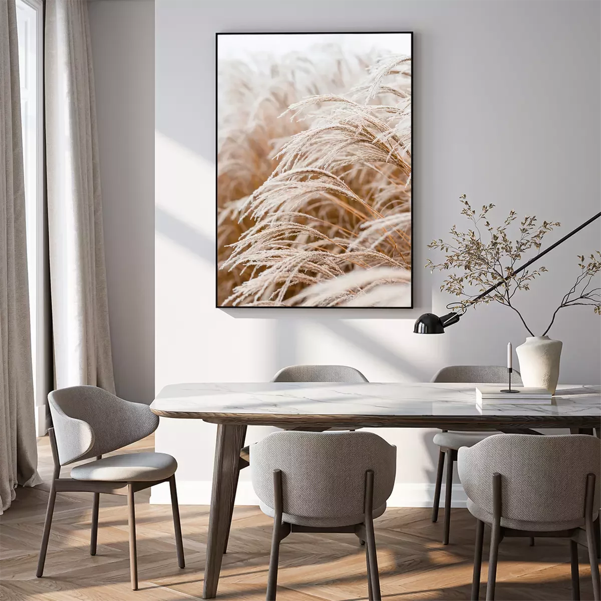 Poster: Abstract natural background of soft plants Cortaderia selloana. Frosted pampas grass on a blurry bokeh, Dry reeds boho style. Patterns on the first ice. Earth watching