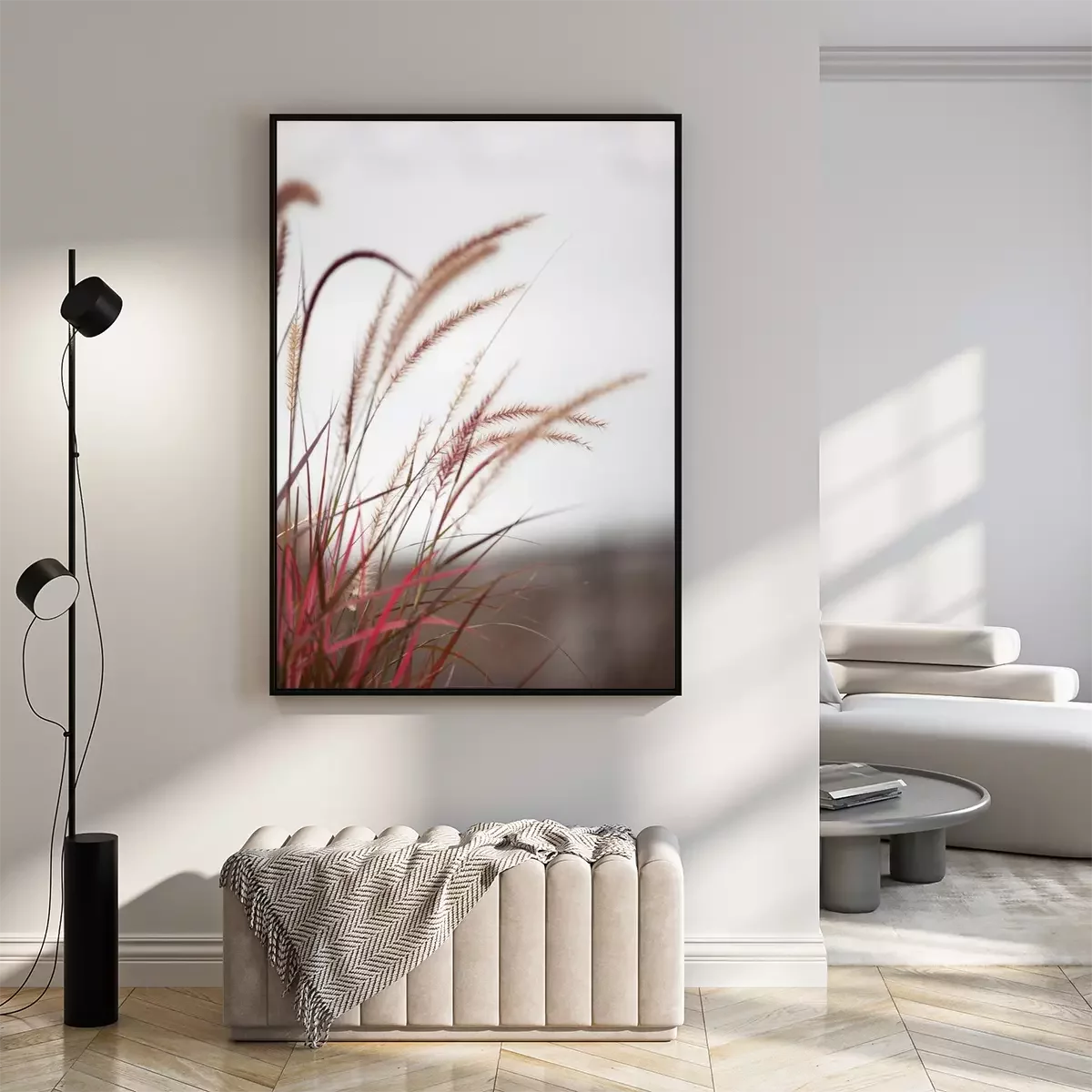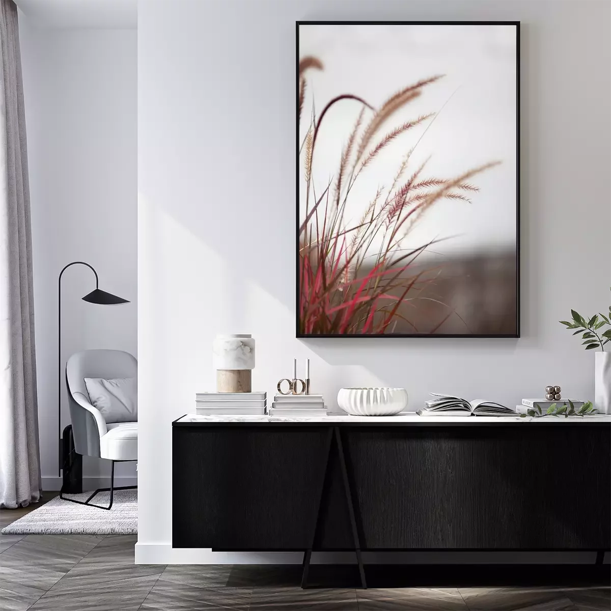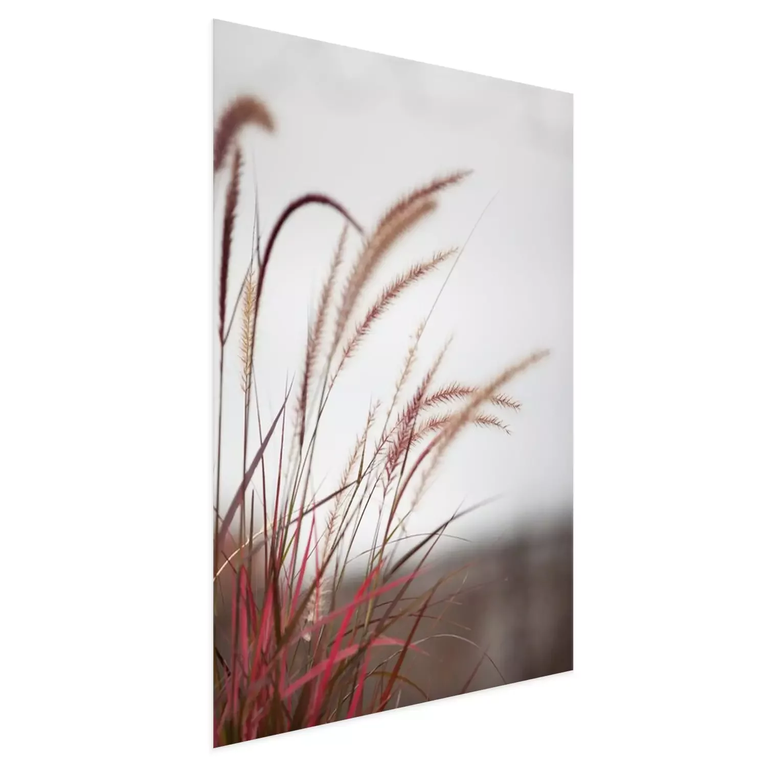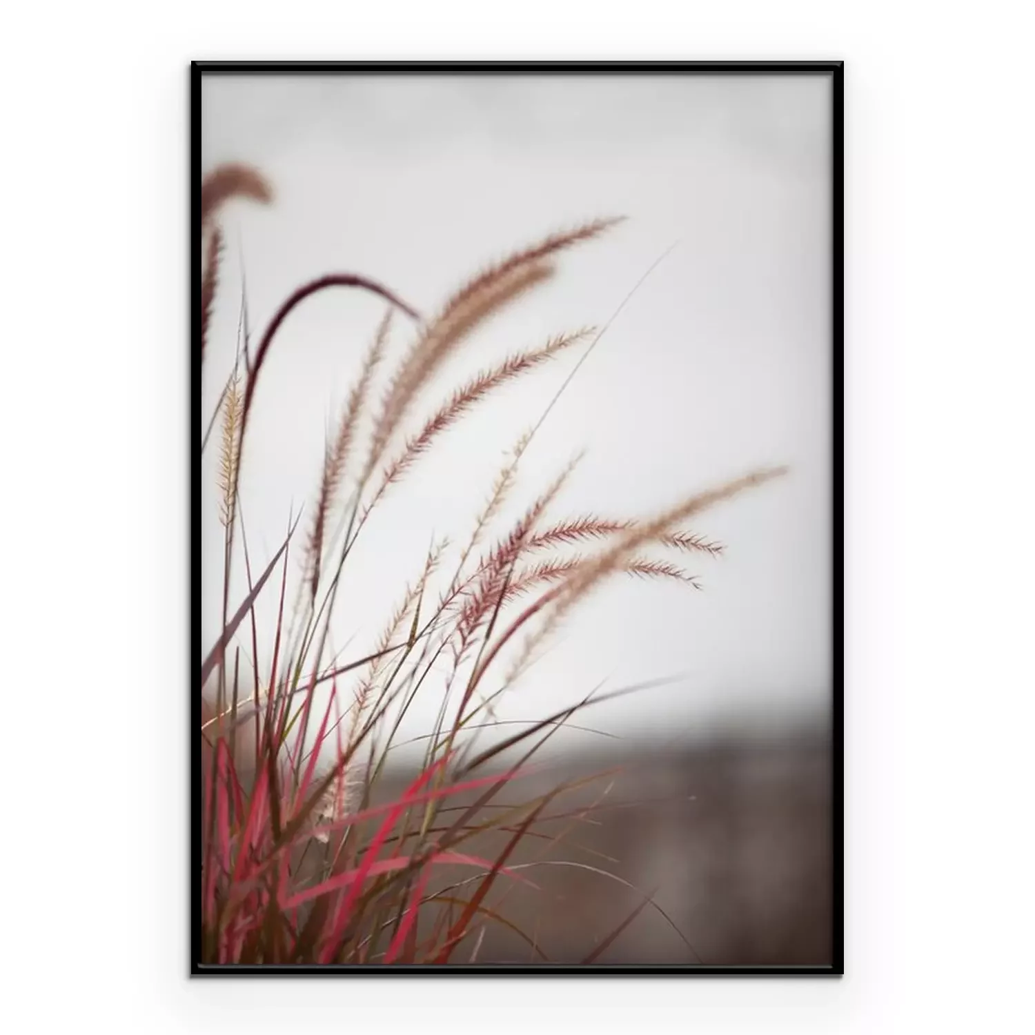 Poster: Abstract red and brown aquatic marshland grass pictured with the gray sky as a backdrop