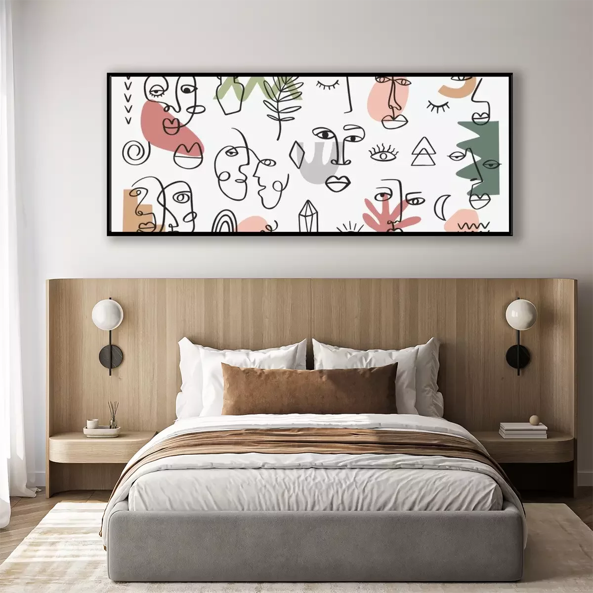 Poster: Abstract tribal woman portrait set in continuous line art. Fashion contemporary elements with ethnic female faces, leaves, flowers, shapes in modern Ink painting style. Minimalistic aesthetic concept