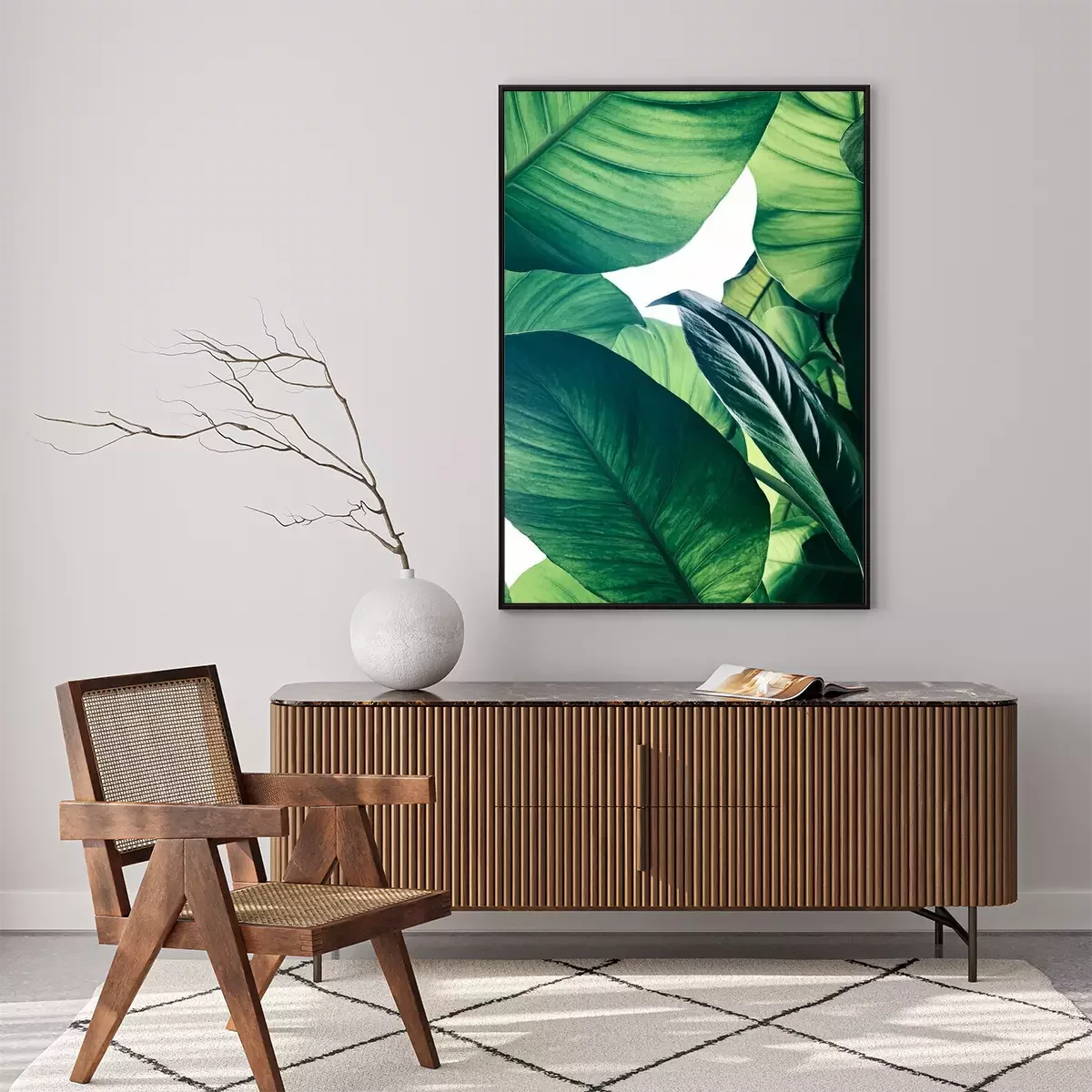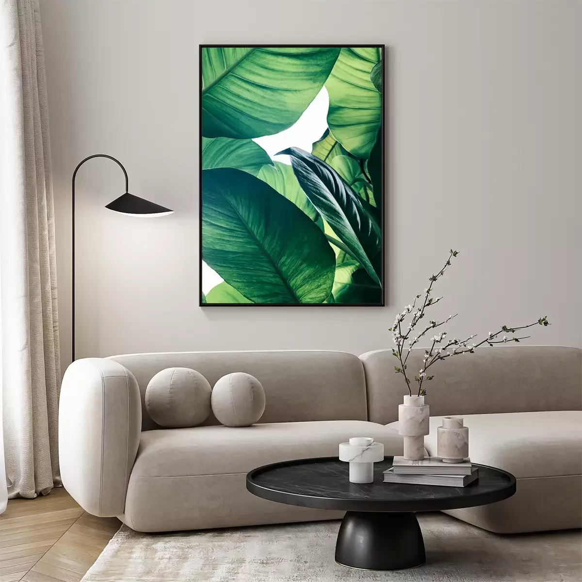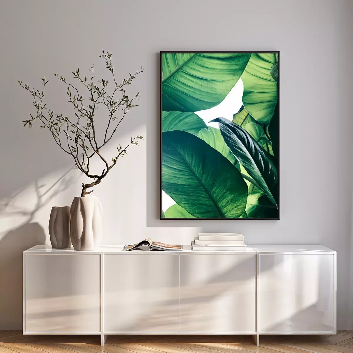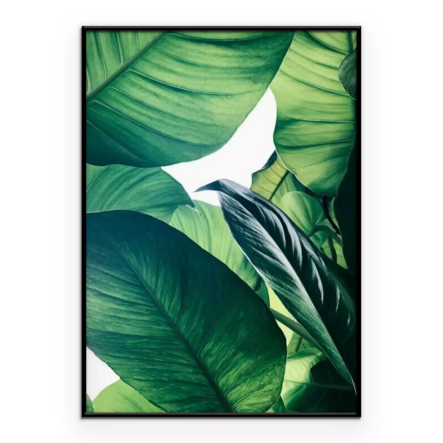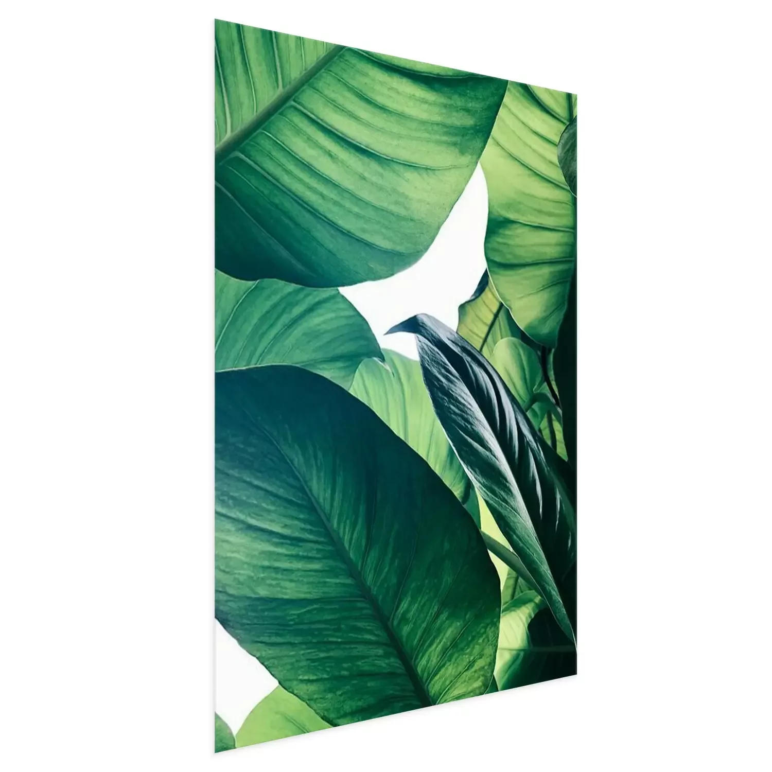 Poster: Abstract tropical green leaves pattern on white background, lush foliage of giant golden pothos or Devil’s ivy (Epipremnum aureum) the tropic plant.