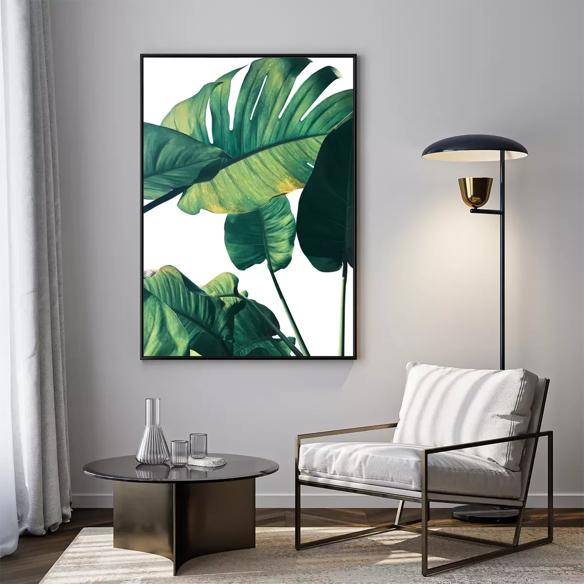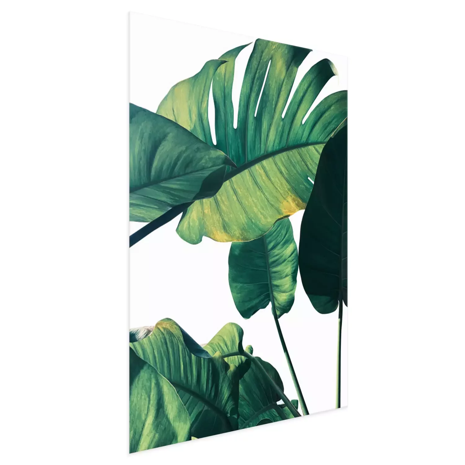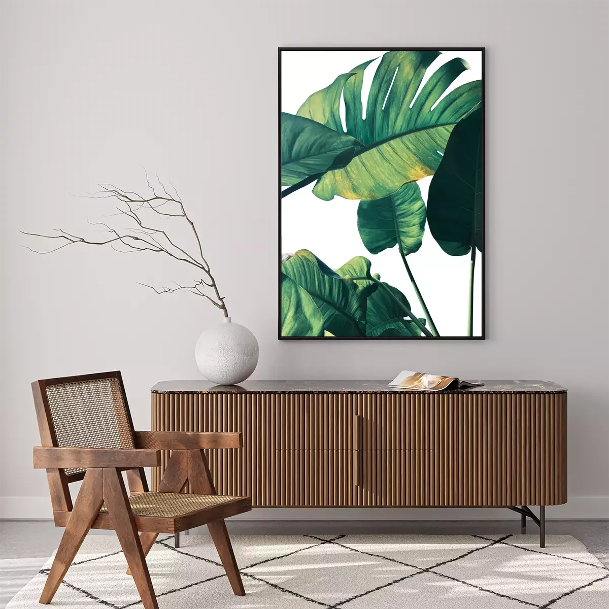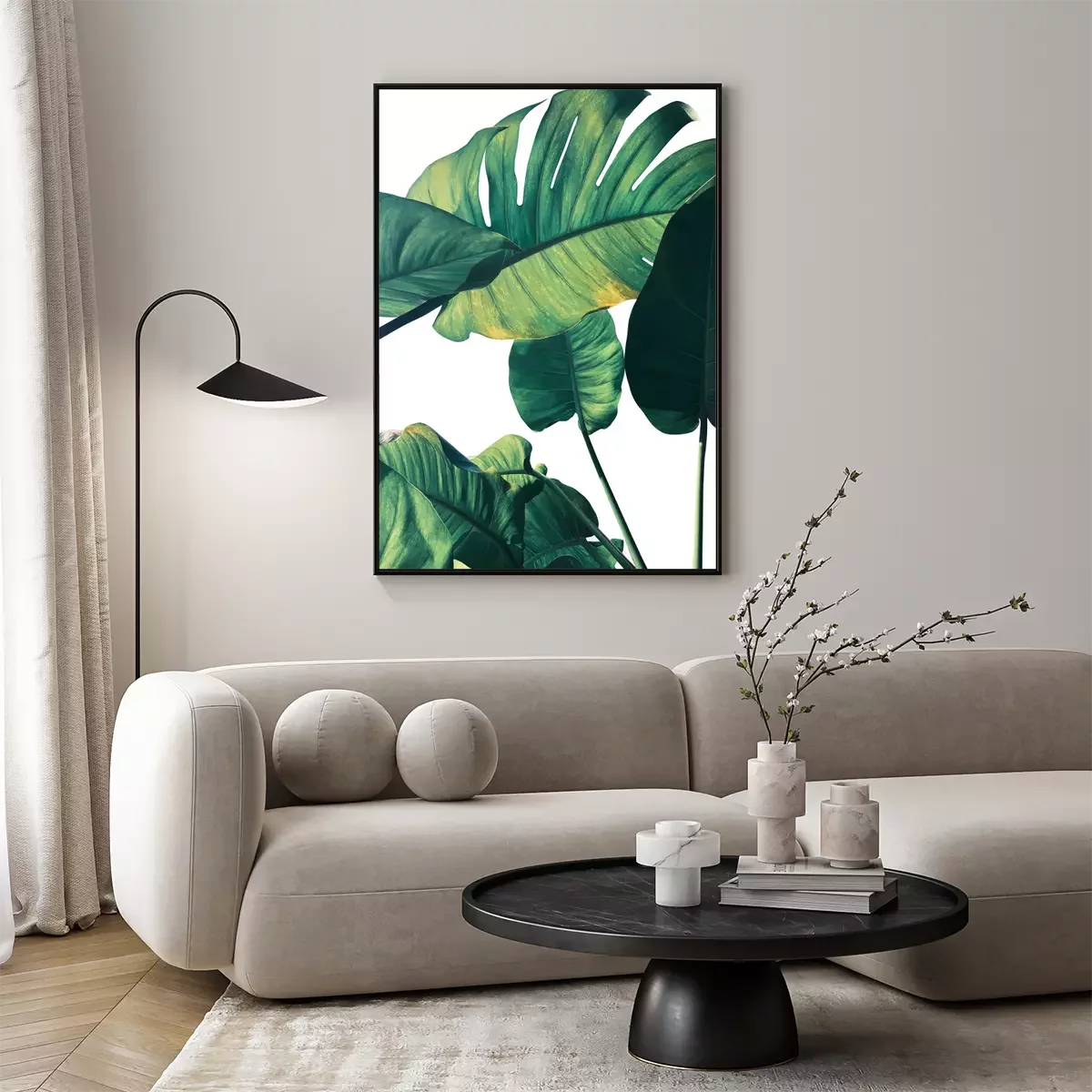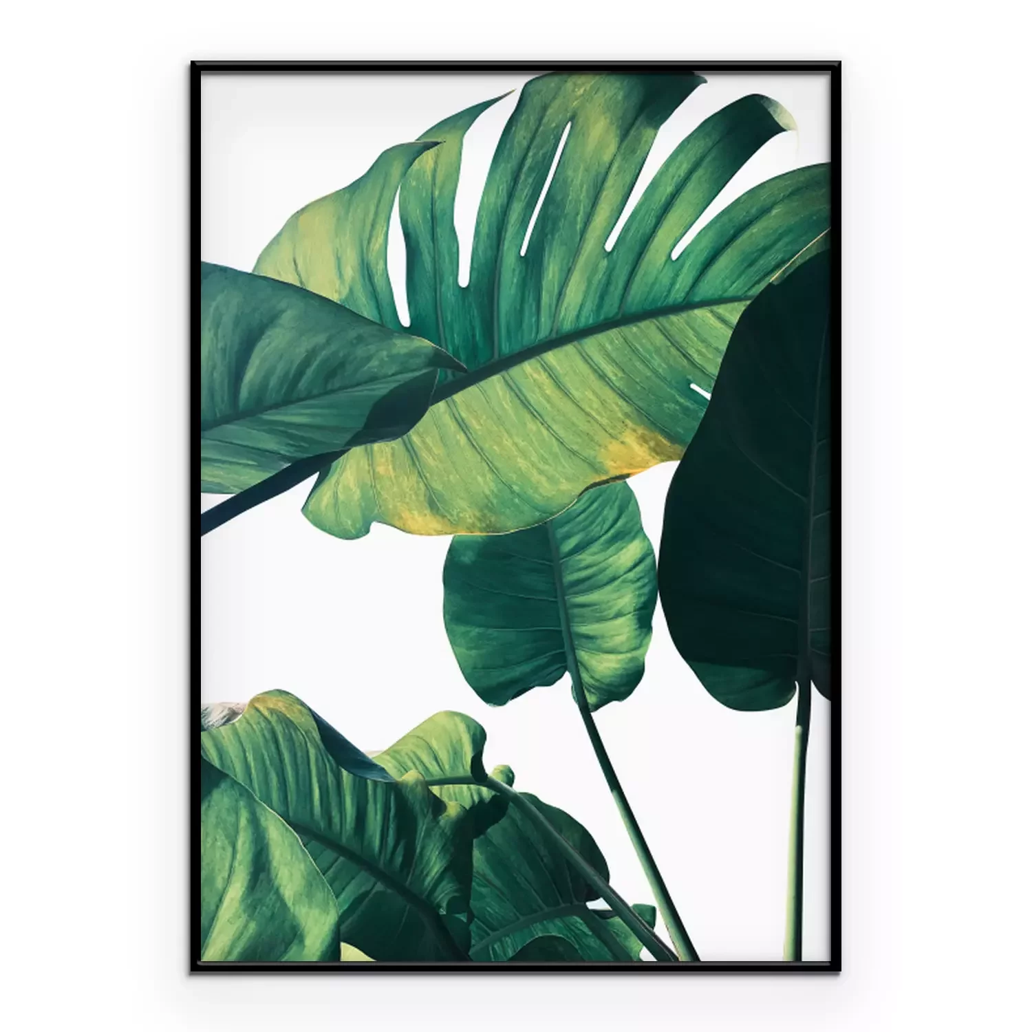 Poster: Abstract tropical green leaves pattern on white background, lush foliage of giant golden pothos or Devil’s ivy (Epipremnum aureum) the tropic plant..