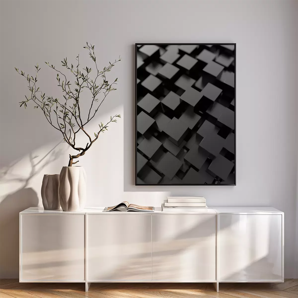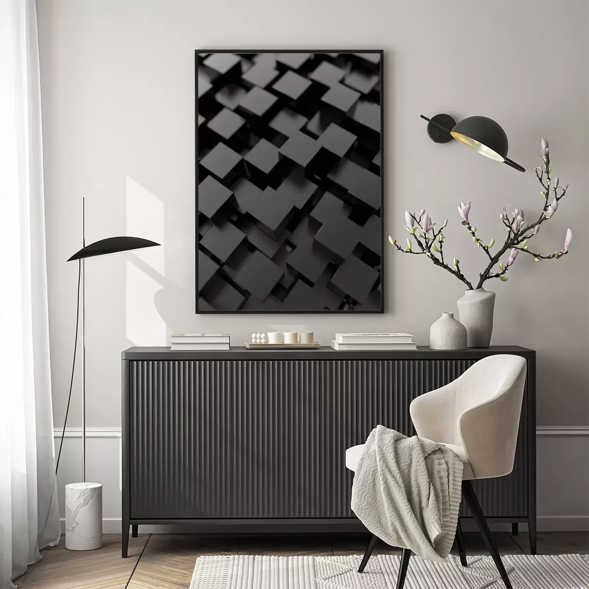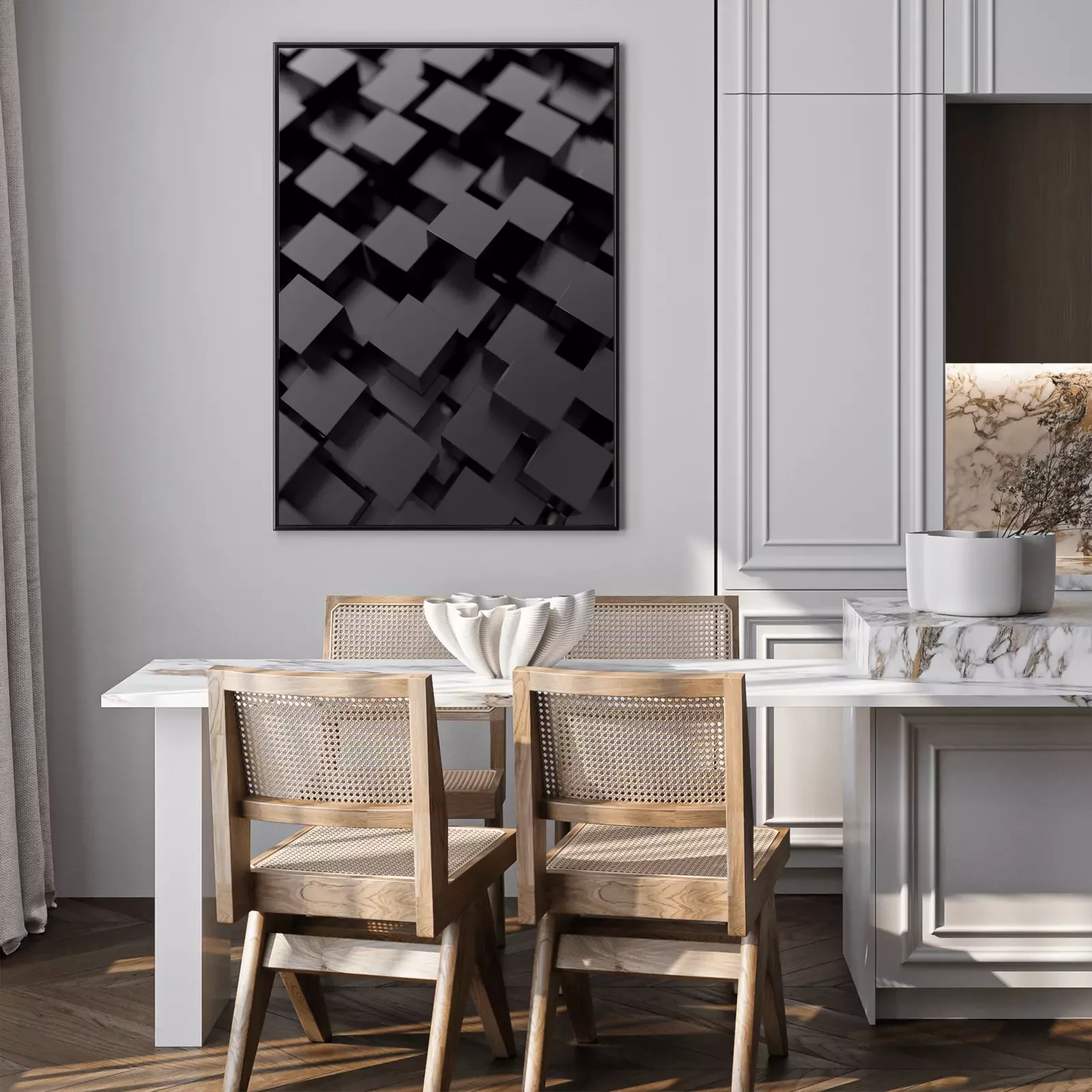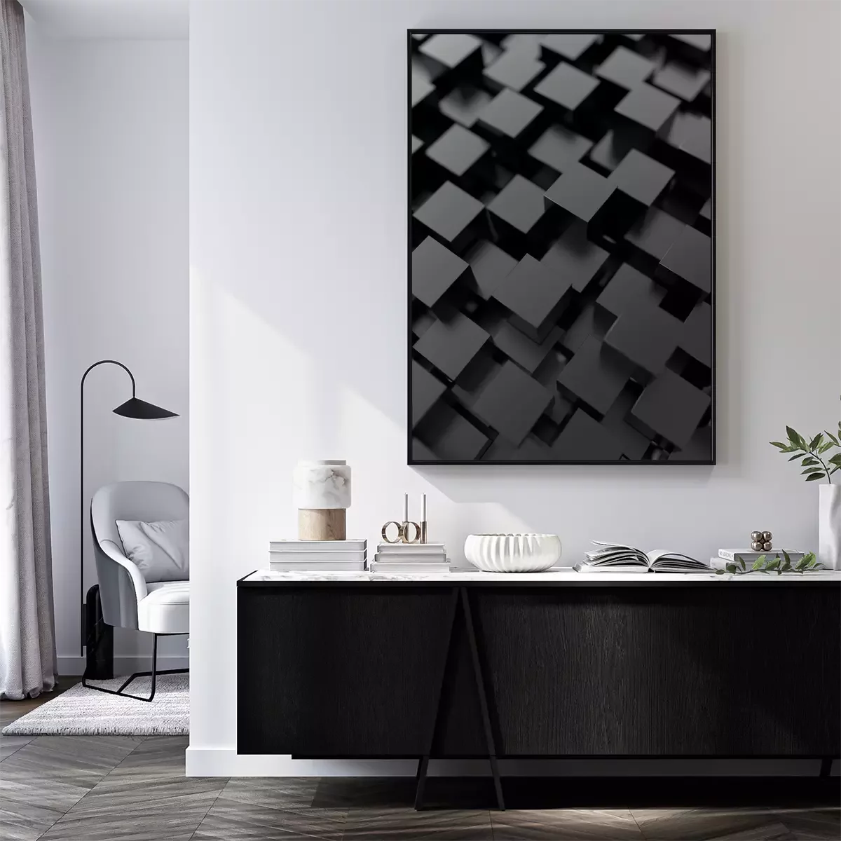 Poster: Abstracte kubussen. Zwarte achtergrond. 3d render.