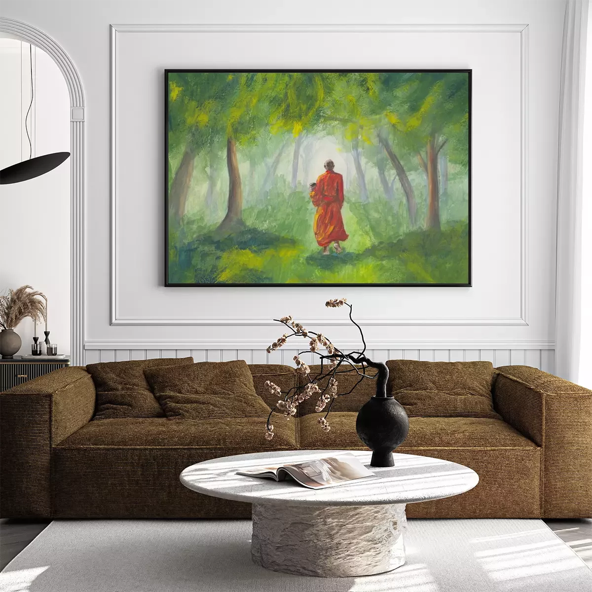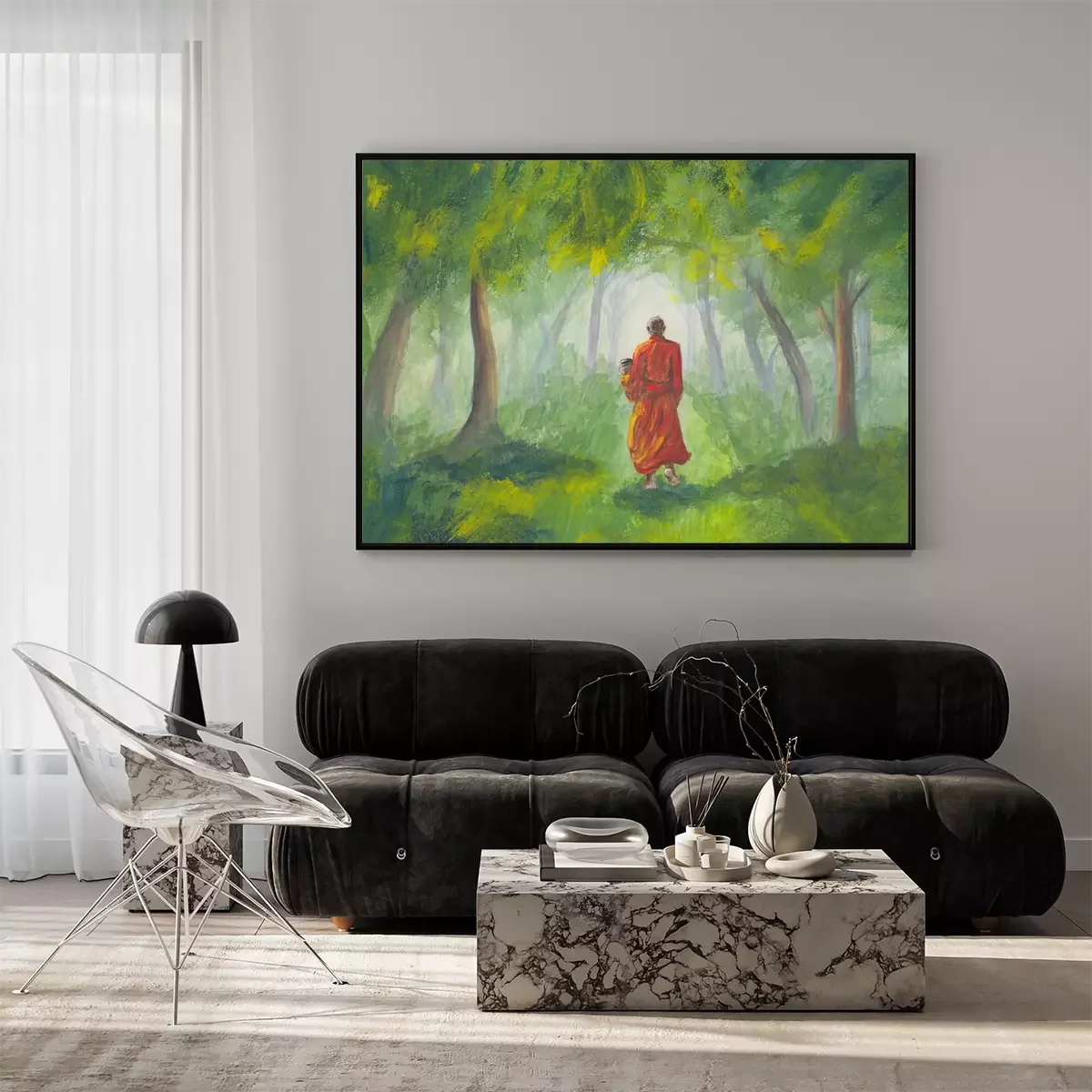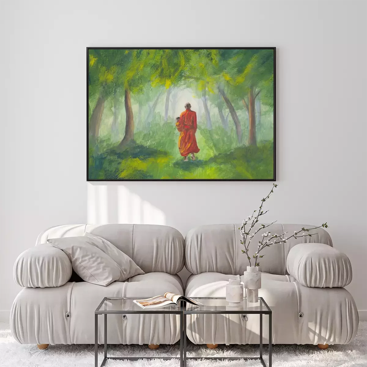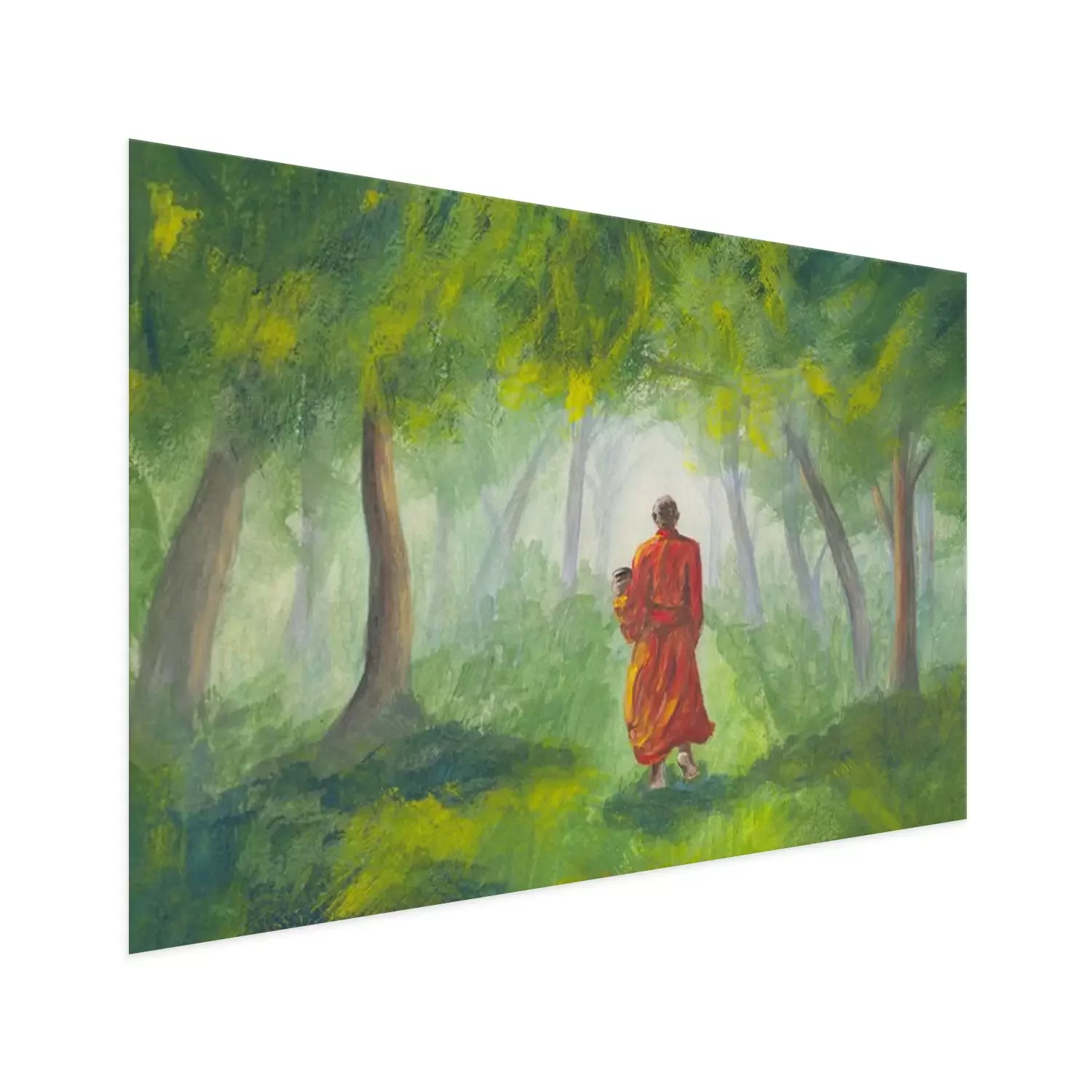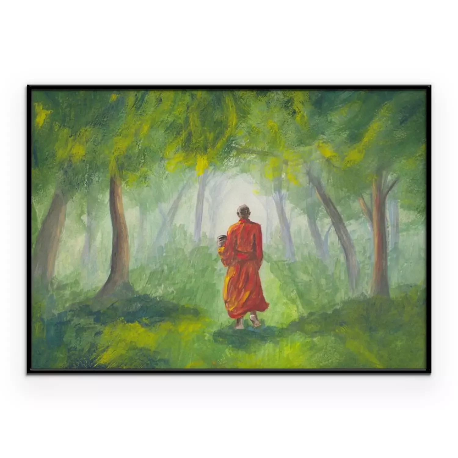 Poster: Acrylics painting of asian forest & walking Buddhist monk in orange robe with alms bowl at dawn. Oriental style landscape with trees. Concept for decoration, relax, restore, meditation background.