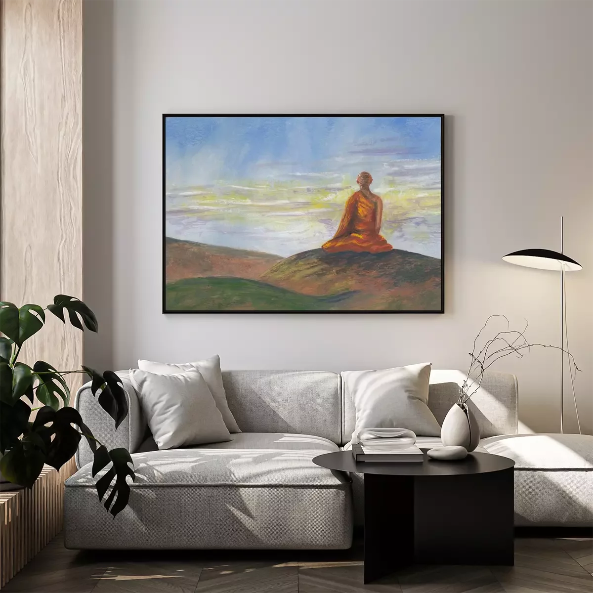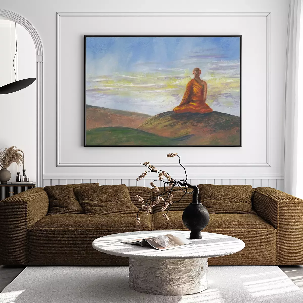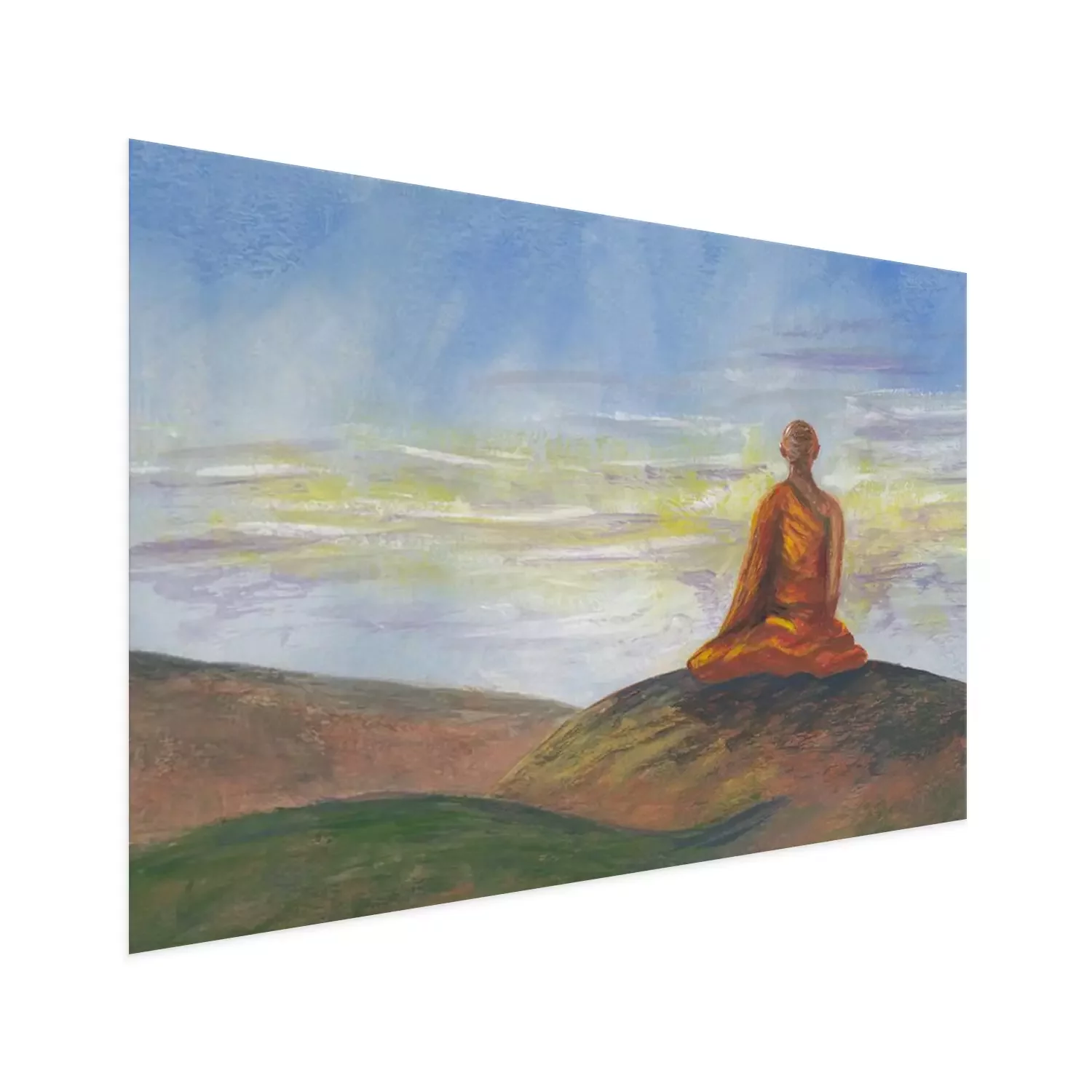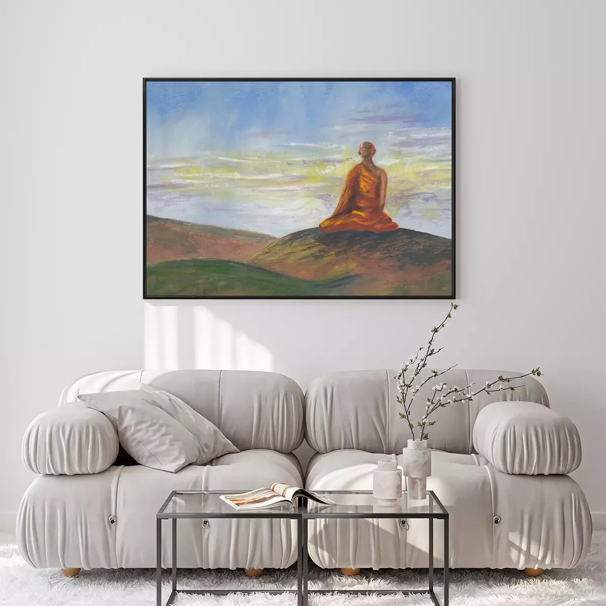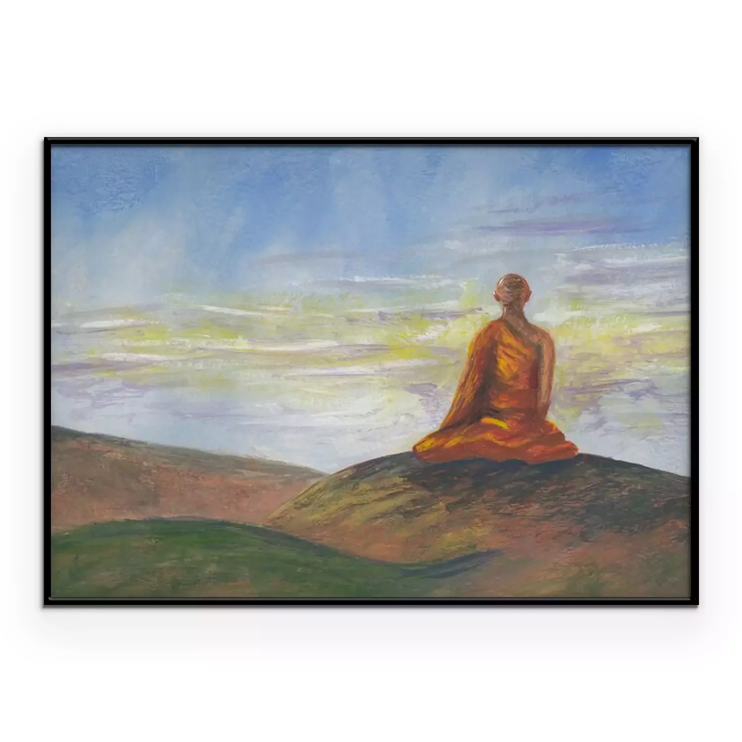 Poster: Acrylics painting of asian mountains, blue sunrise sky & meditating Buddhist monk in orange robe. Hand drawn oriental style landscape with layers of rocks. Concept for restore, meditation background.