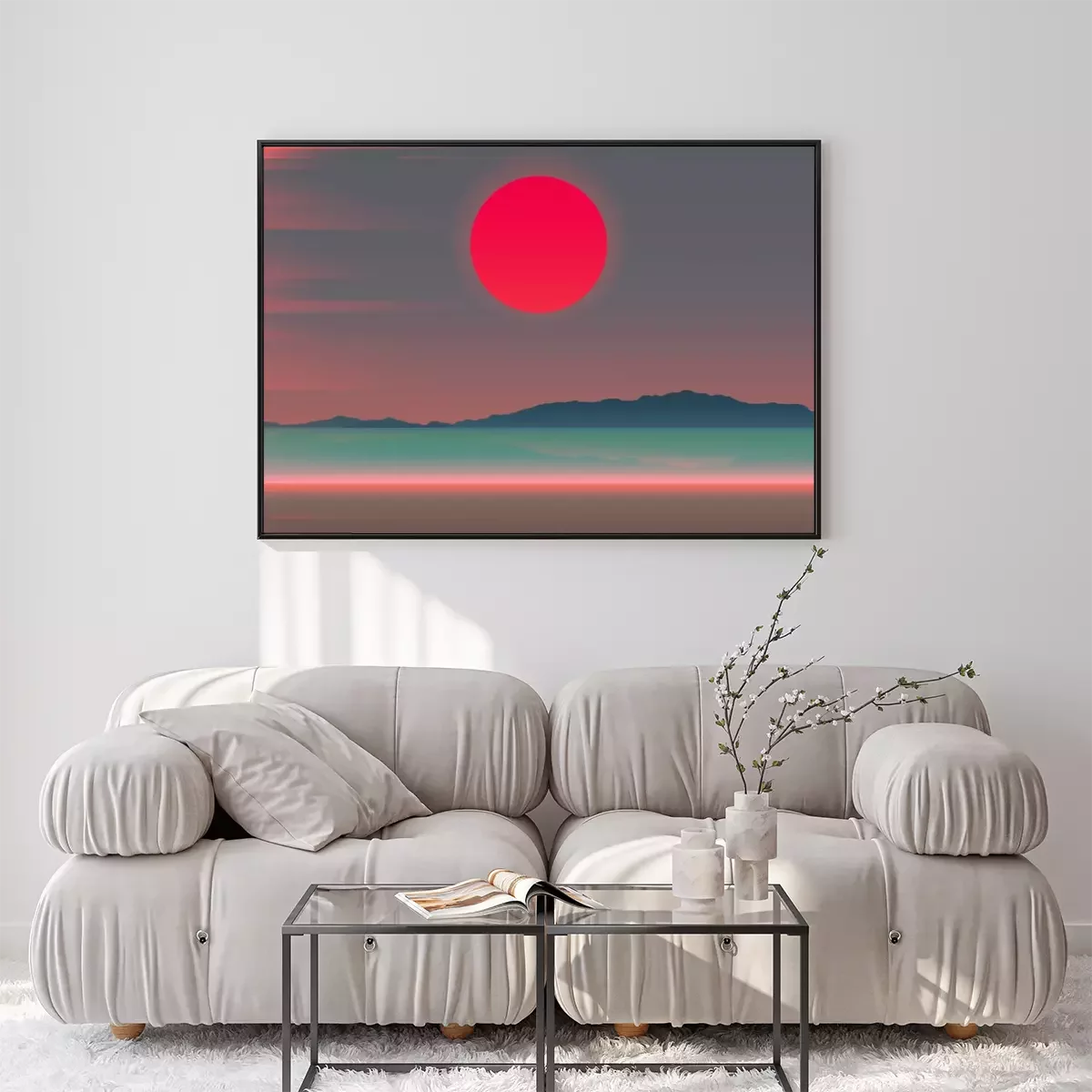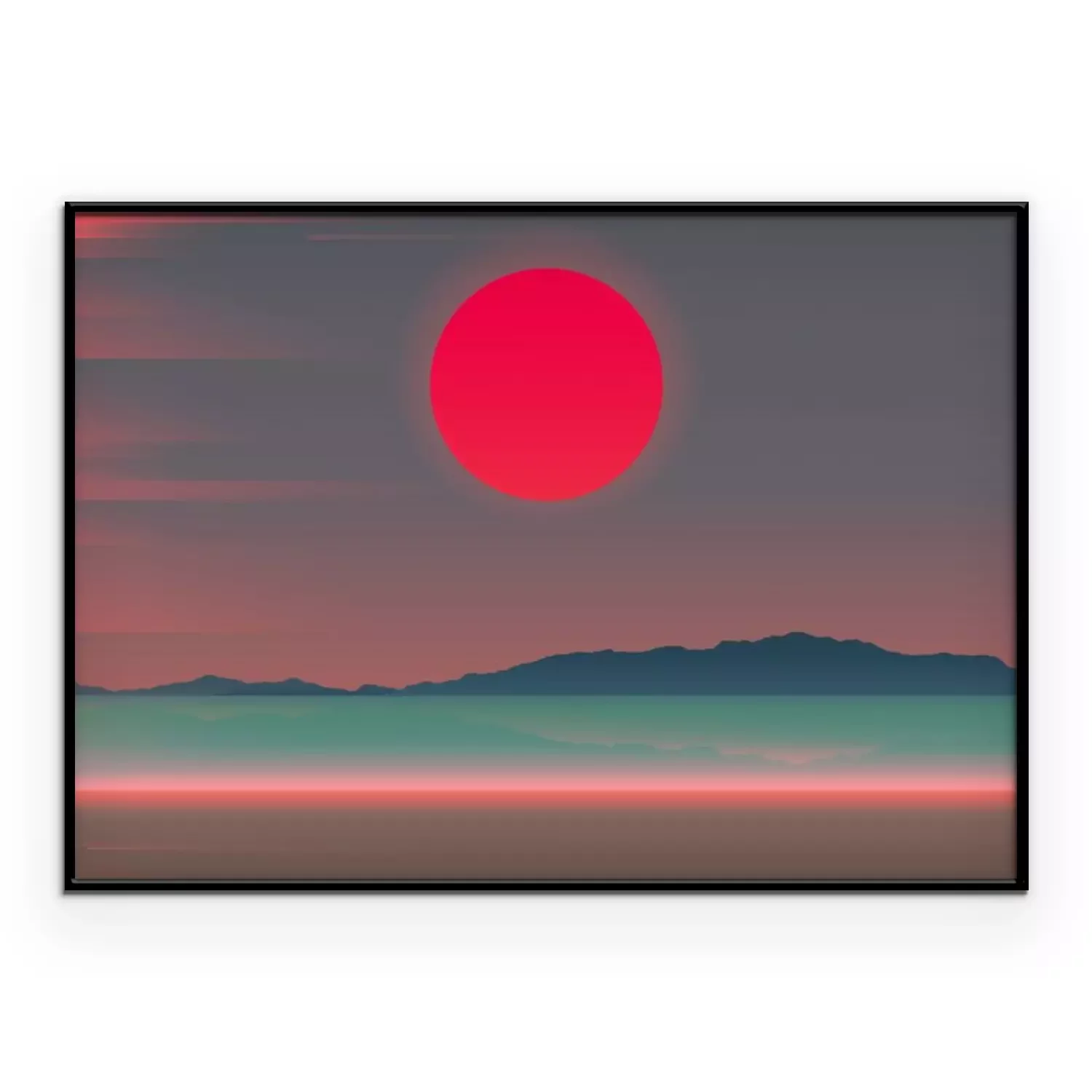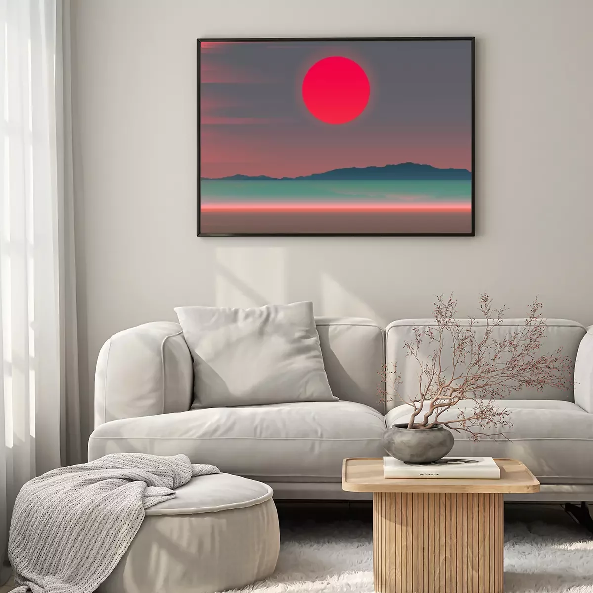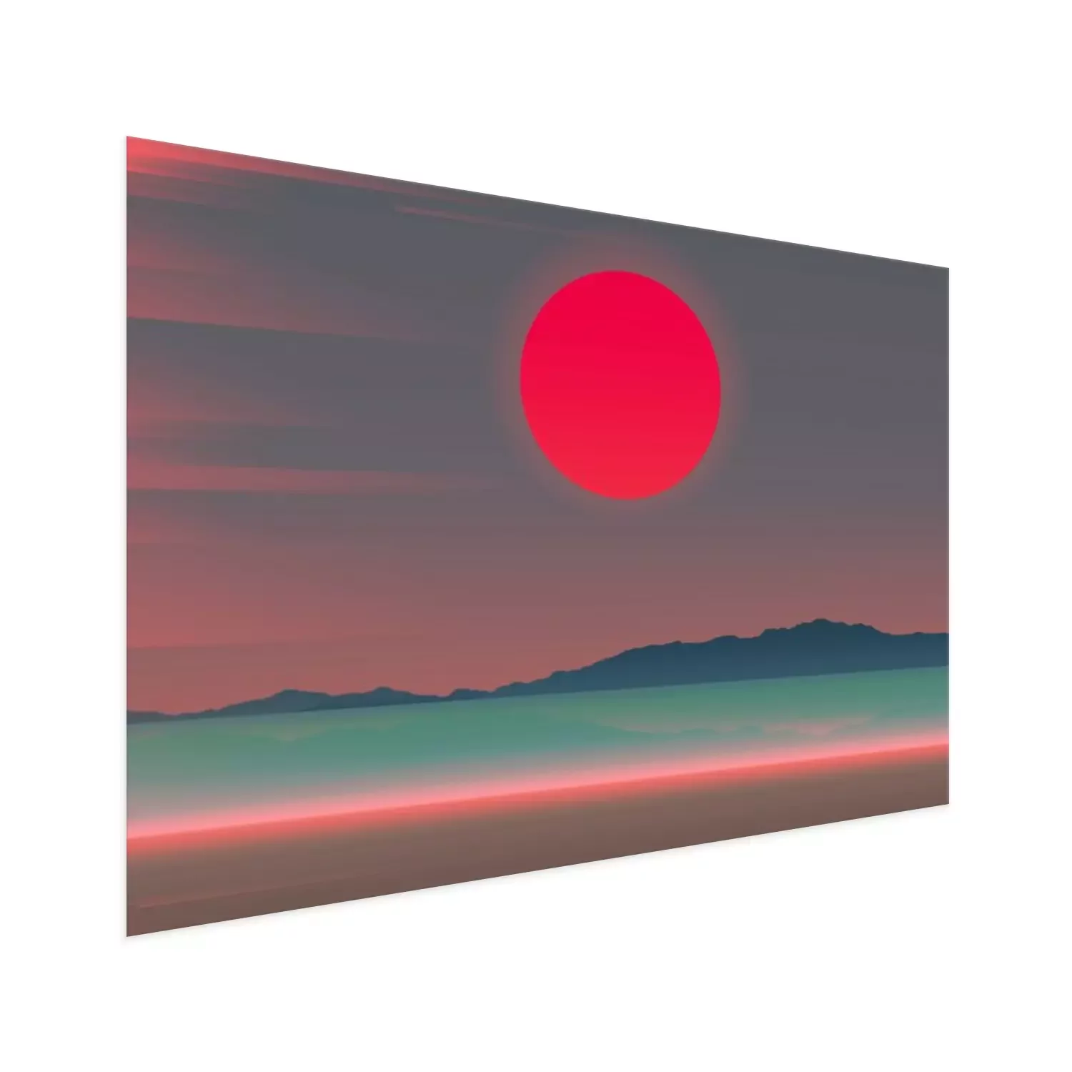 Poster Aesthetic beach scene landscape with big red sunset and light leak overlay, soft cool pastel gradient summer vibe