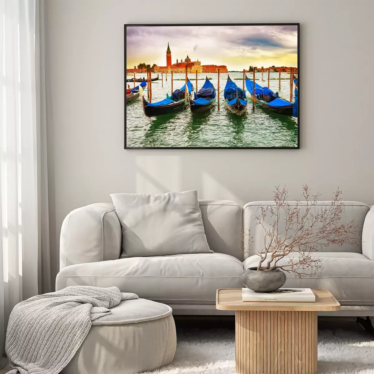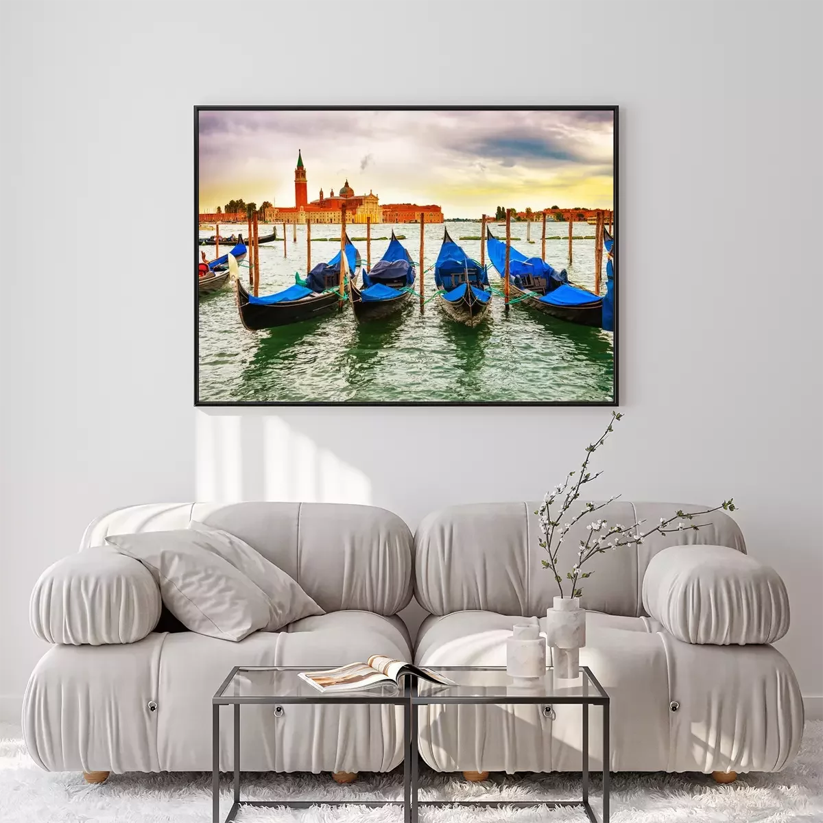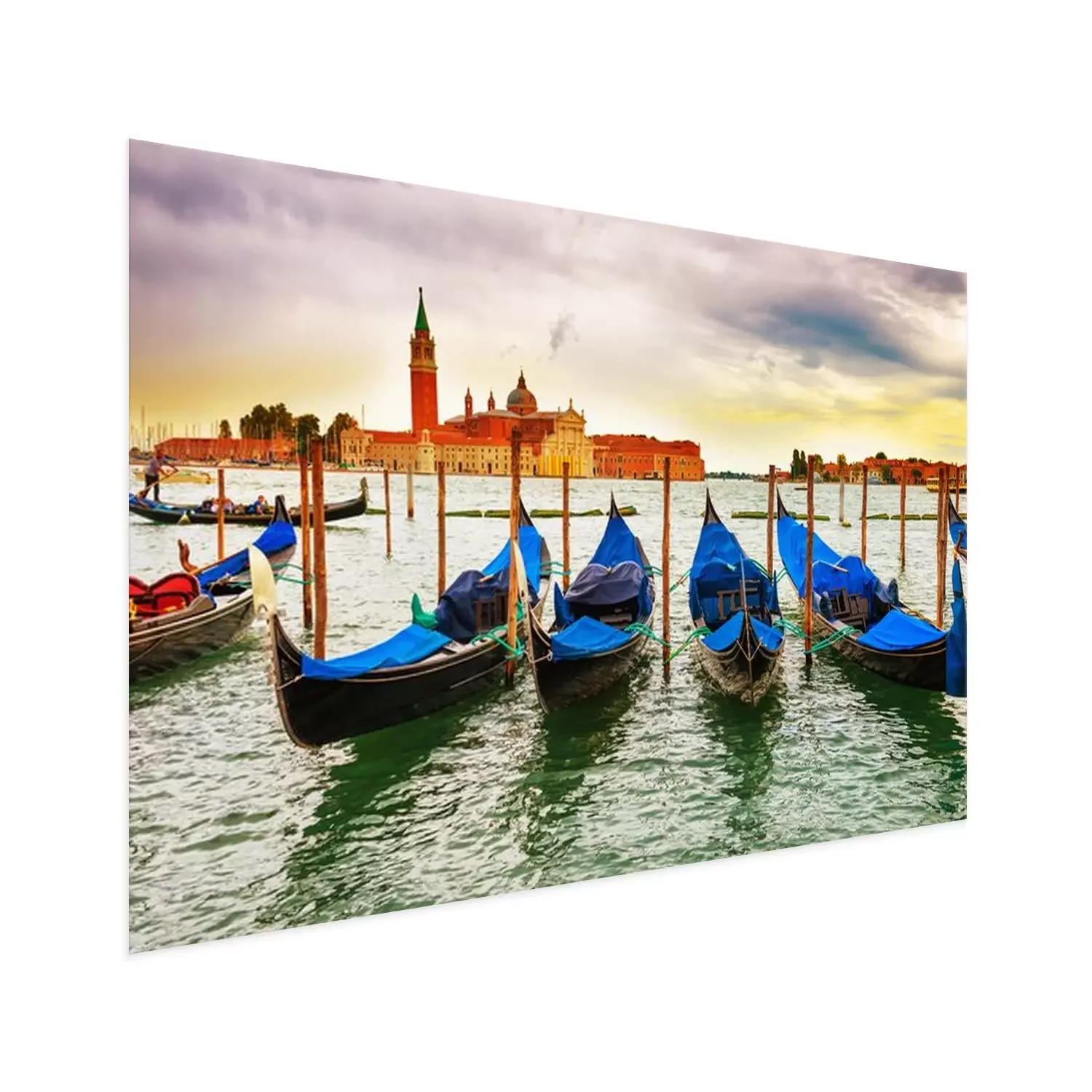 Poster: Afgemeerde gondels verslaan zonsondergang
