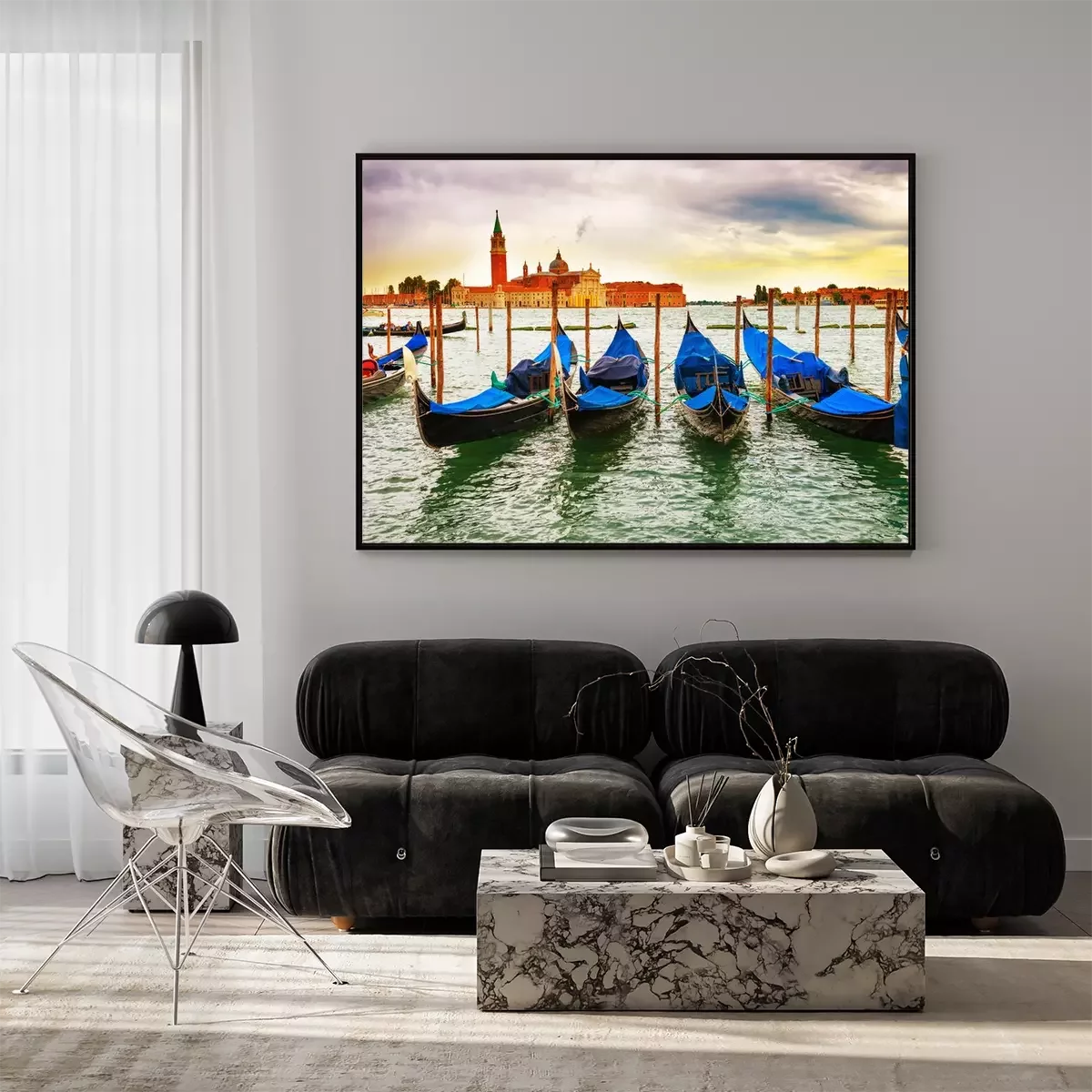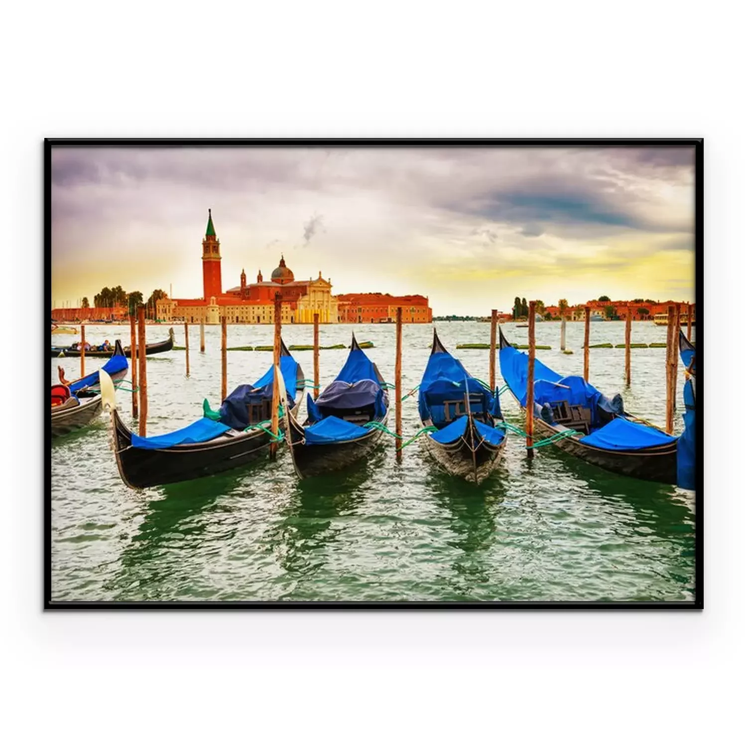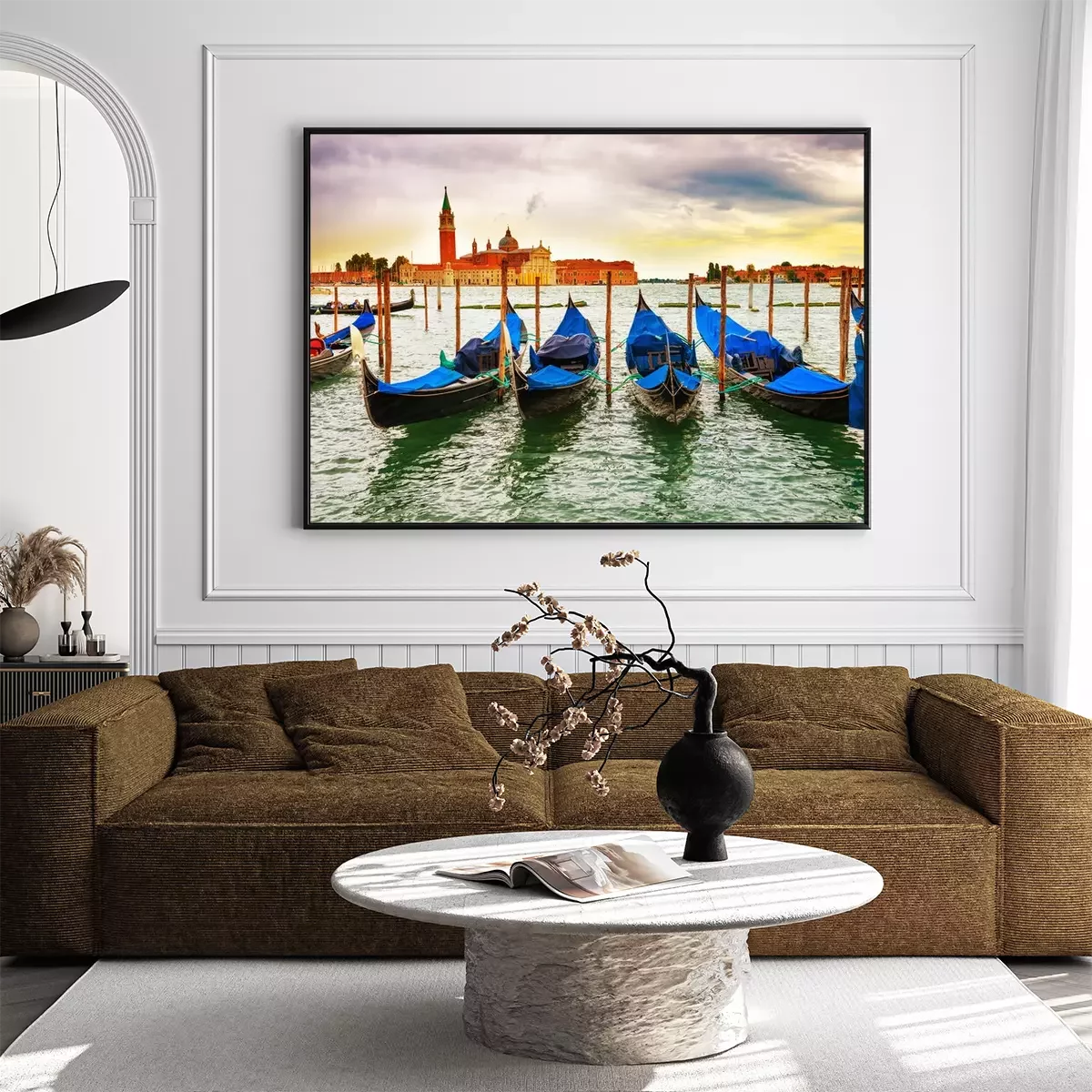 Poster: Afgemeerde gondels verslaan zonsondergang